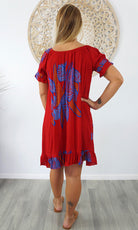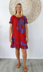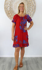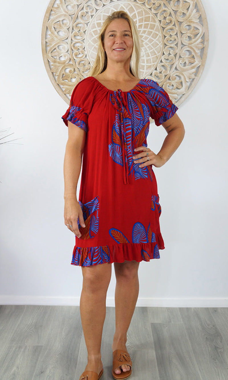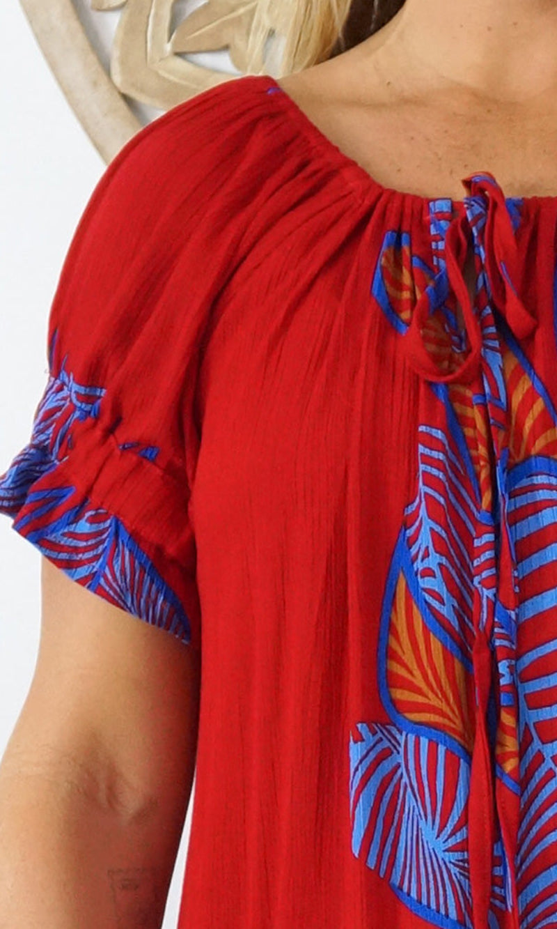 Made from crinkle rayon, the cuba dress features elastic around the back neck line with a drawstring tie at the front, frill detail on sleeves and hem line with pockets on each side.