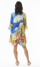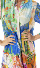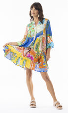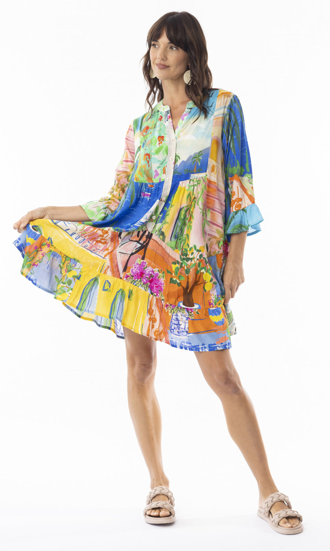 Be swept away by the radiant Sardinia Frill Sleeve Layer Dress. Featuring a button up mandarin collar, a tiered skirt that falls at the knee, and three-quarter frill sleeves, this dress is so easy to wear. Vibrant colours and an intricate patchwork of waterscape and terracotta gardens makes this the perfect dress for your next beach holiday.