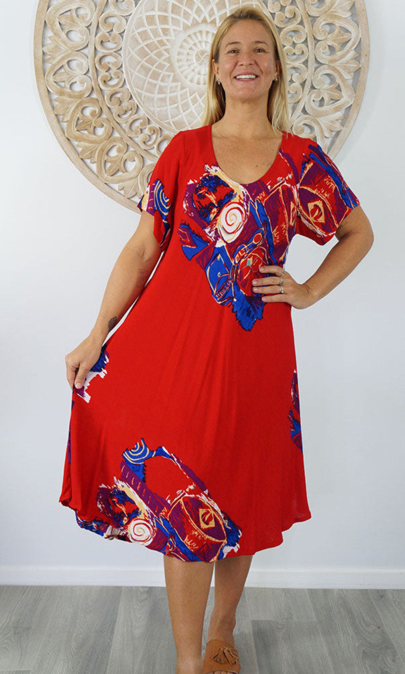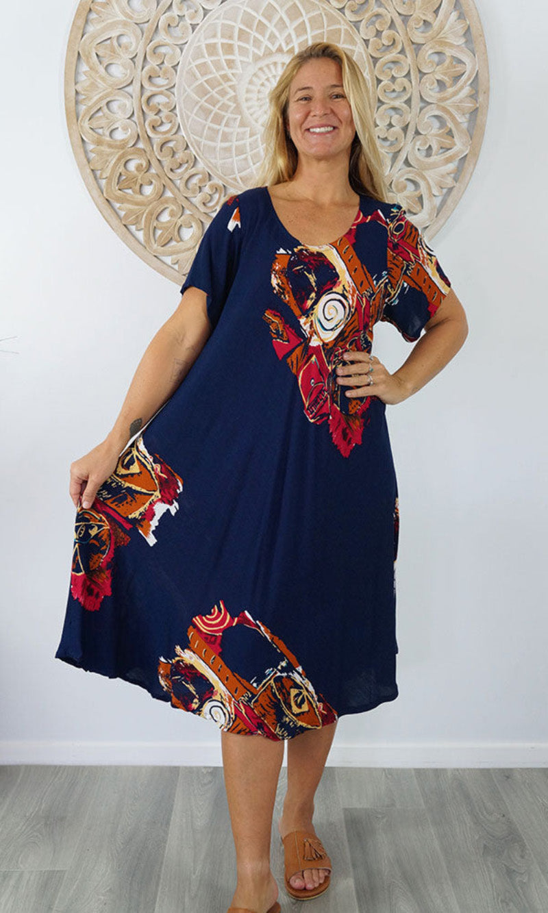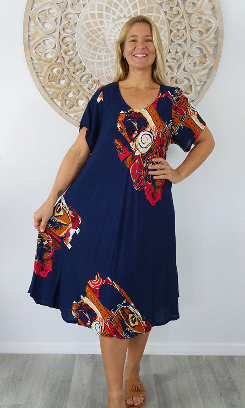 Cool and comfortable sleeveless dress in lovely pre shrunk crinkle rayon. Fabric is cut of the bias to assist the garment to fit many body shapes. Free Sizing 10 - 18.
