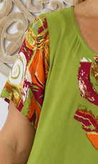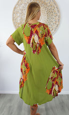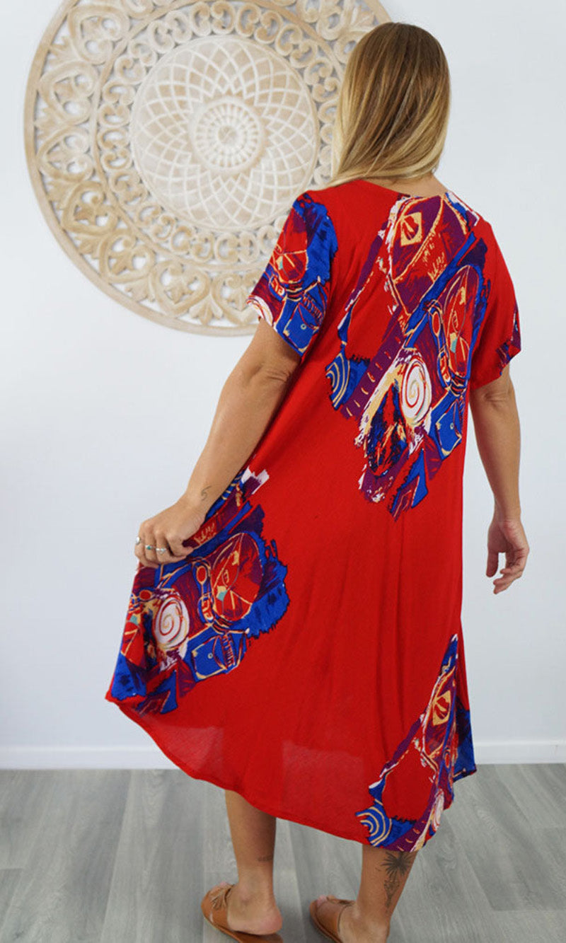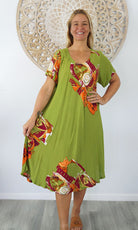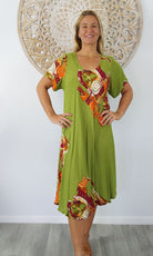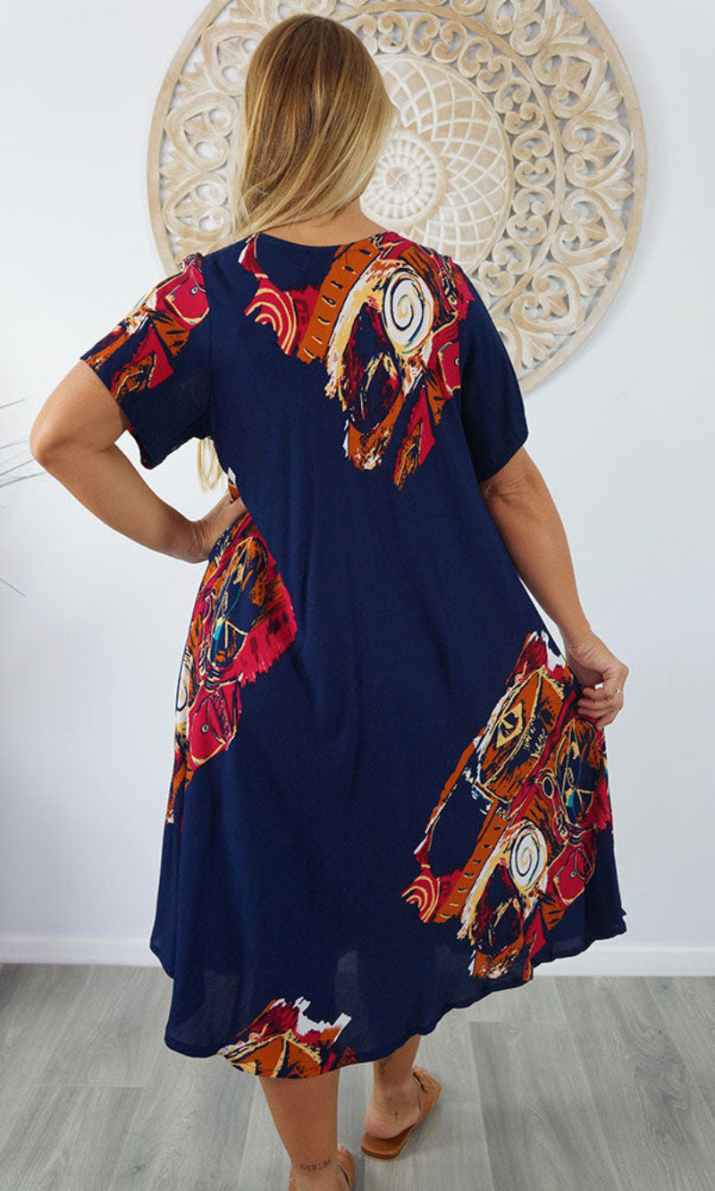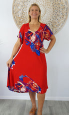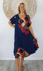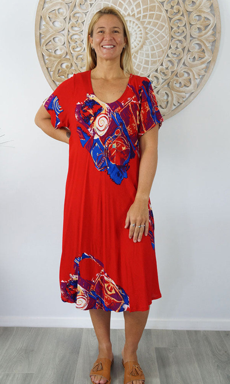 Cool and comfortable sleeveless dress in lovely pre shrunk crinkle rayon. Fabric is cut of the bias to assist the garment to fit many body shapes. Free Sizing 10 - 18.