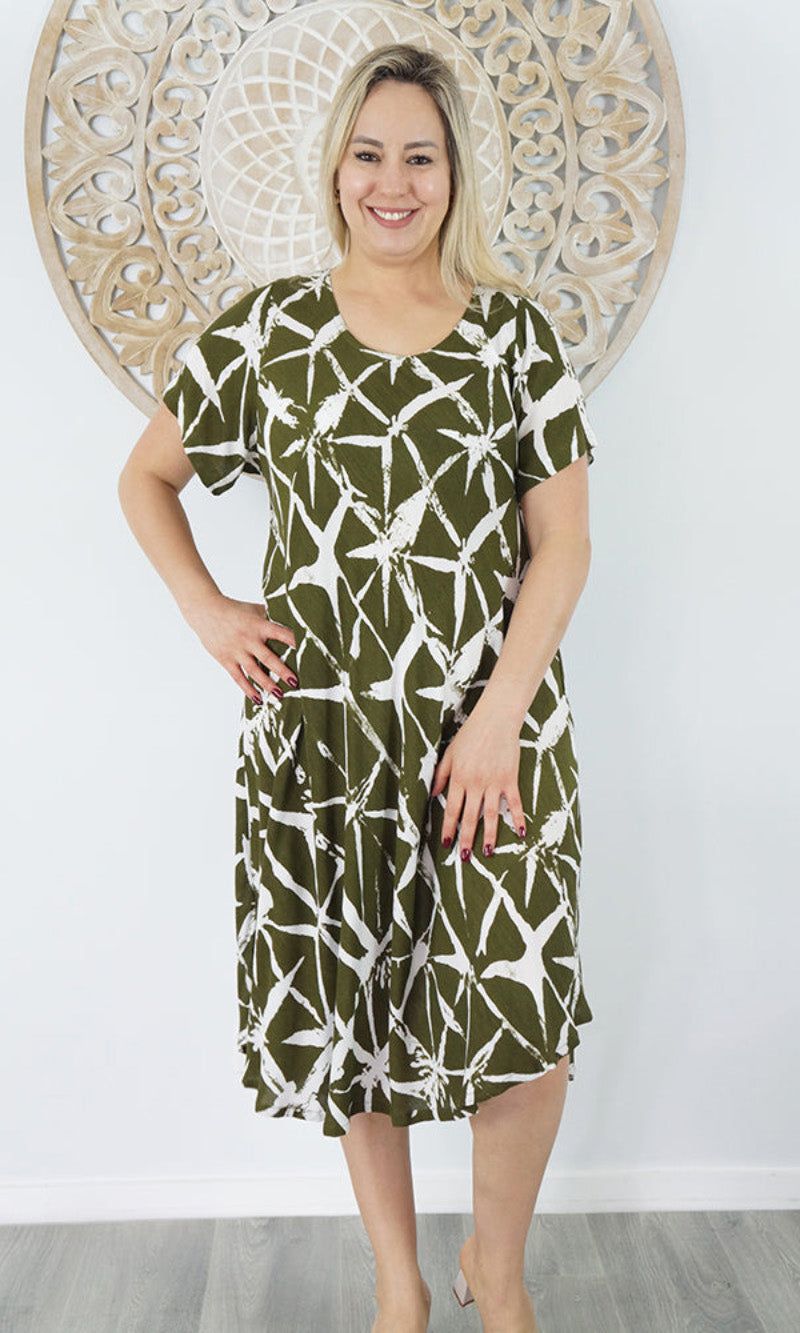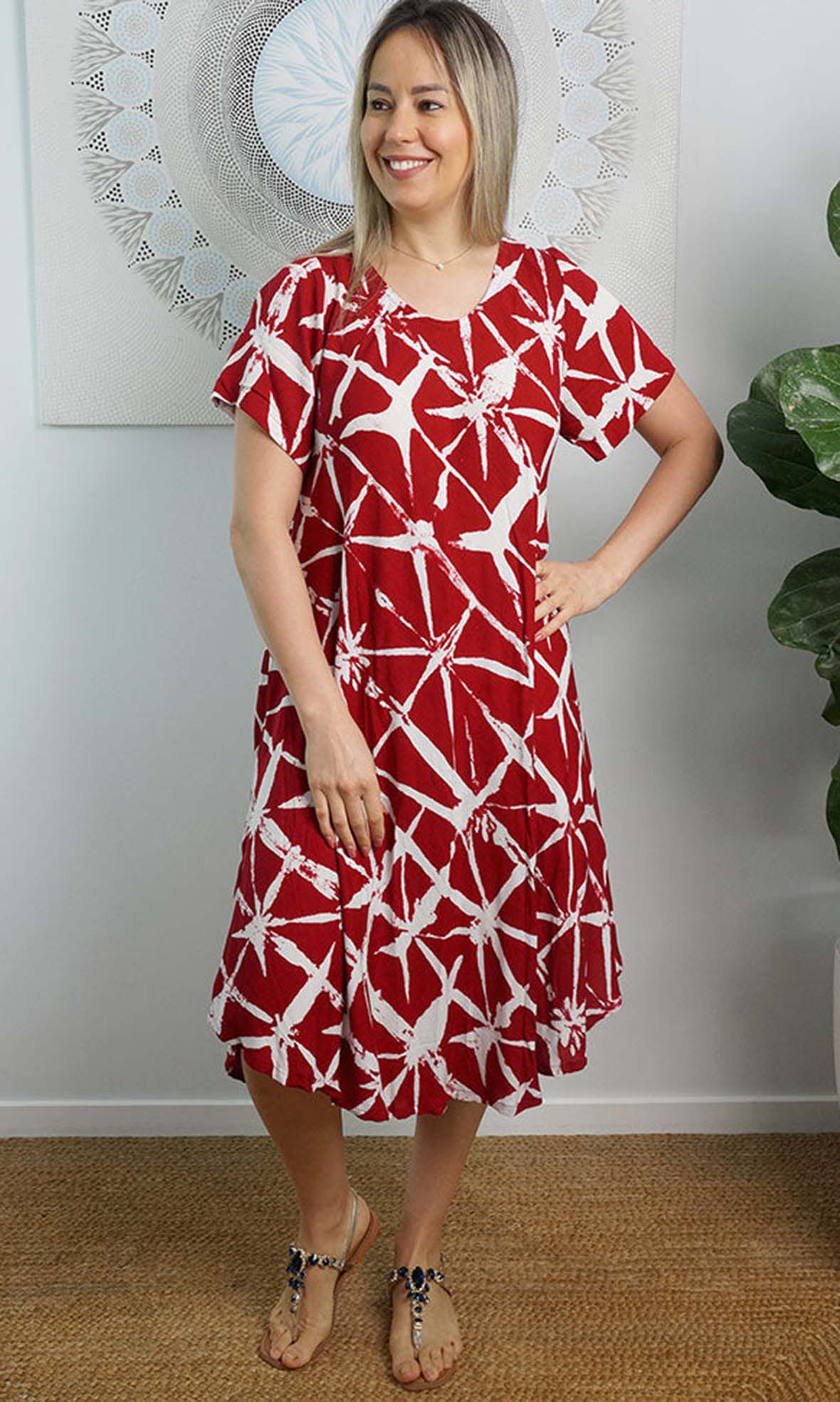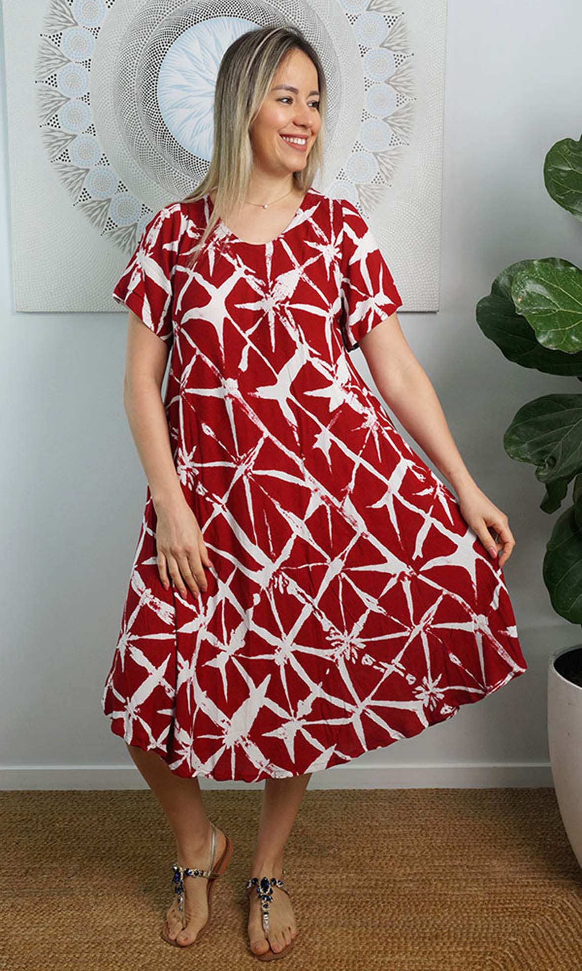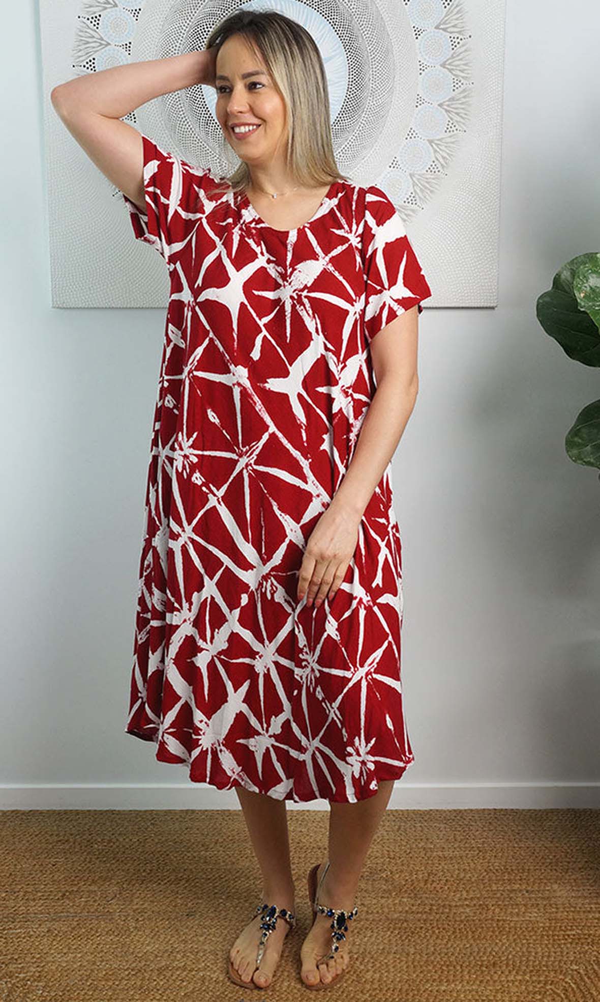 Cool and comfortable sleeveless dress in lovely pre shrunk crinkle rayon. Fabric is cut of the bias to assist the garment to fit many body shapes. Free Sizing 10 - 18.