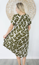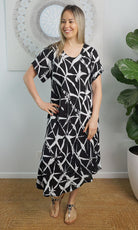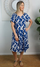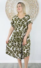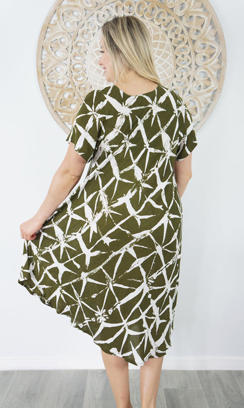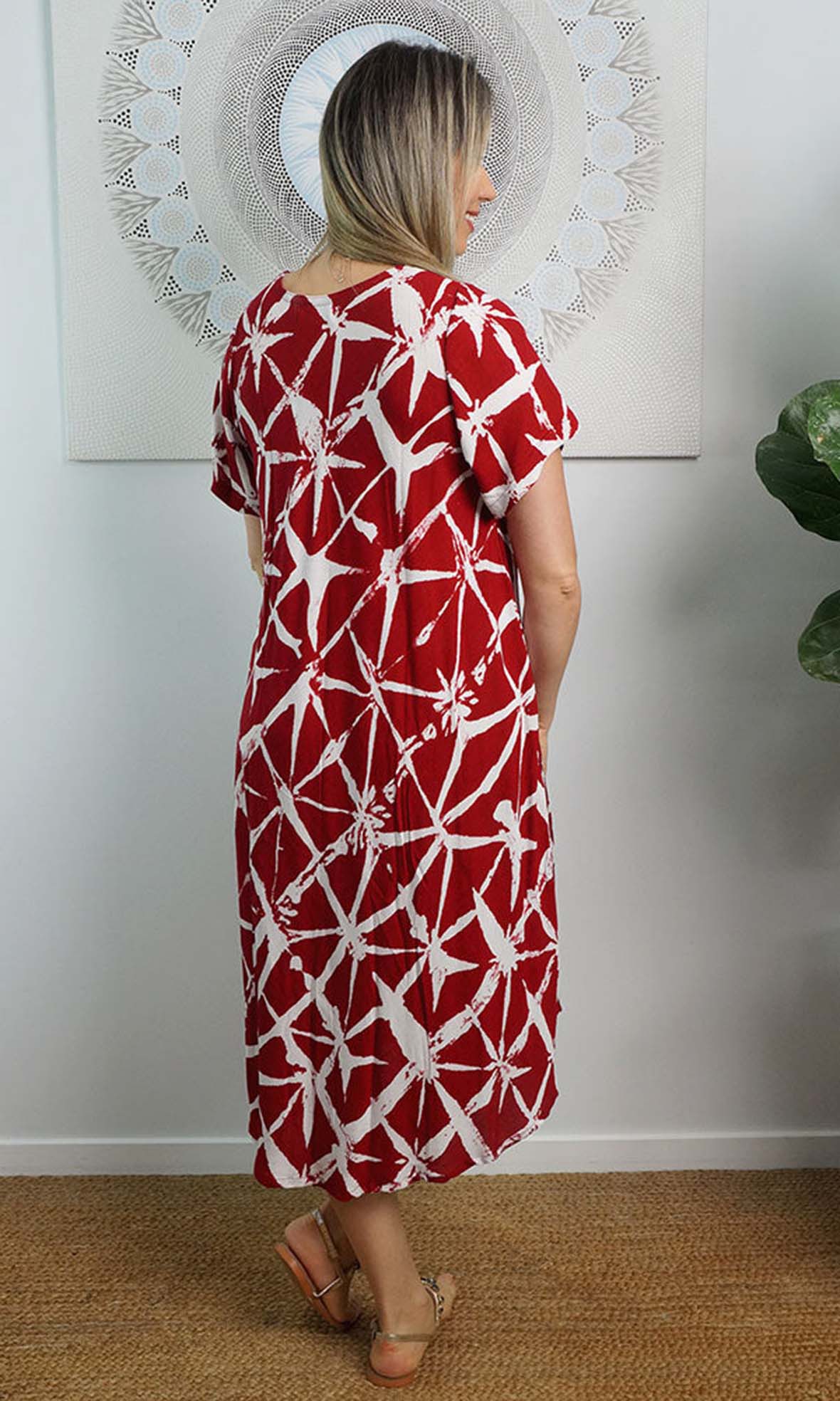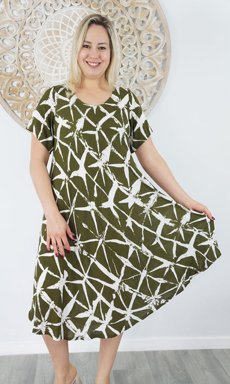 Cool and comfortable sleeveless dress in lovely pre shrunk crinkle rayon. Fabric is cut of the bias to assist the garment to fit many body shapes. Free Sizing 10 - 18.