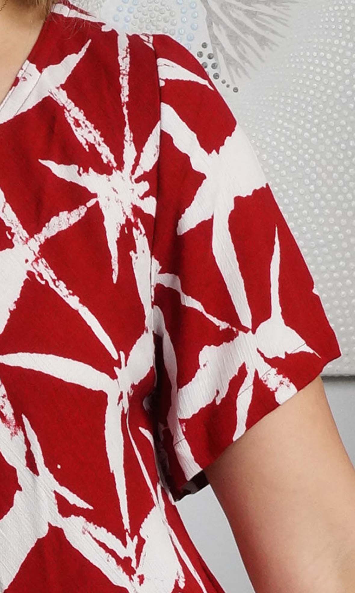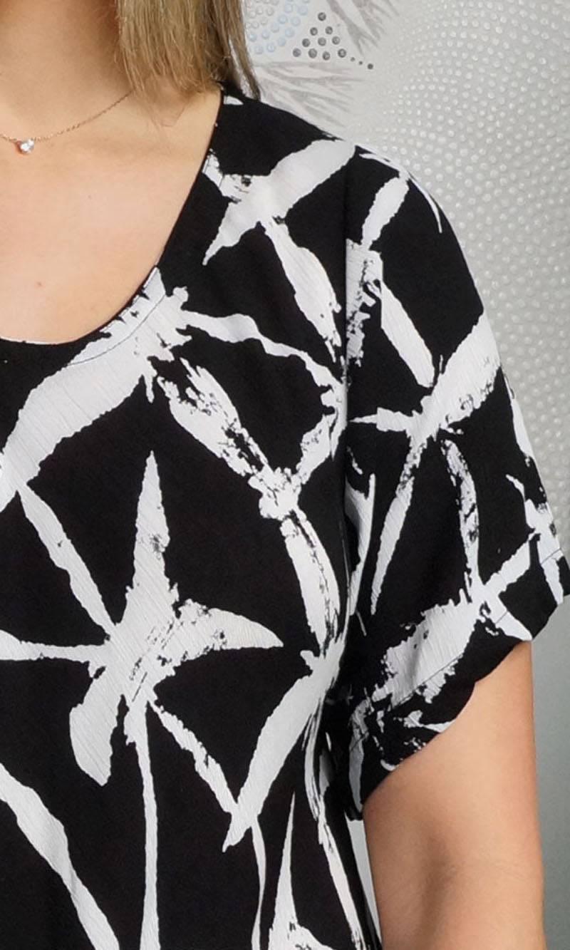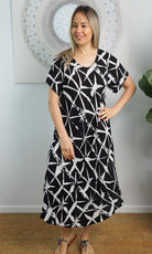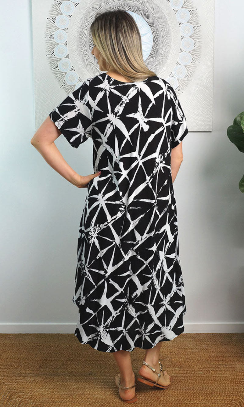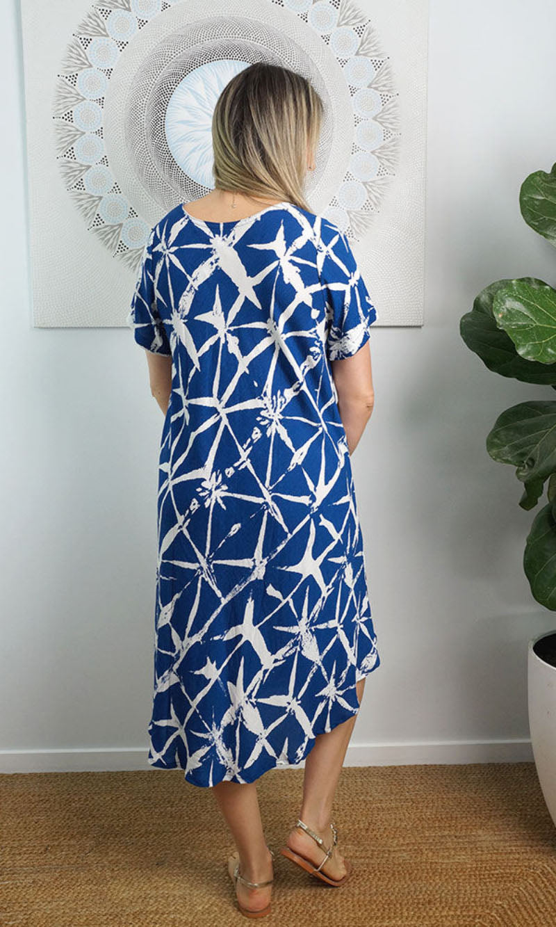 Cool and comfortable sleeveless dress in lovely pre shrunk crinkle rayon. Fabric is cut of the bias to assist the garment to fit many body shapes. Free Sizing 10 - 18.