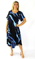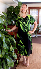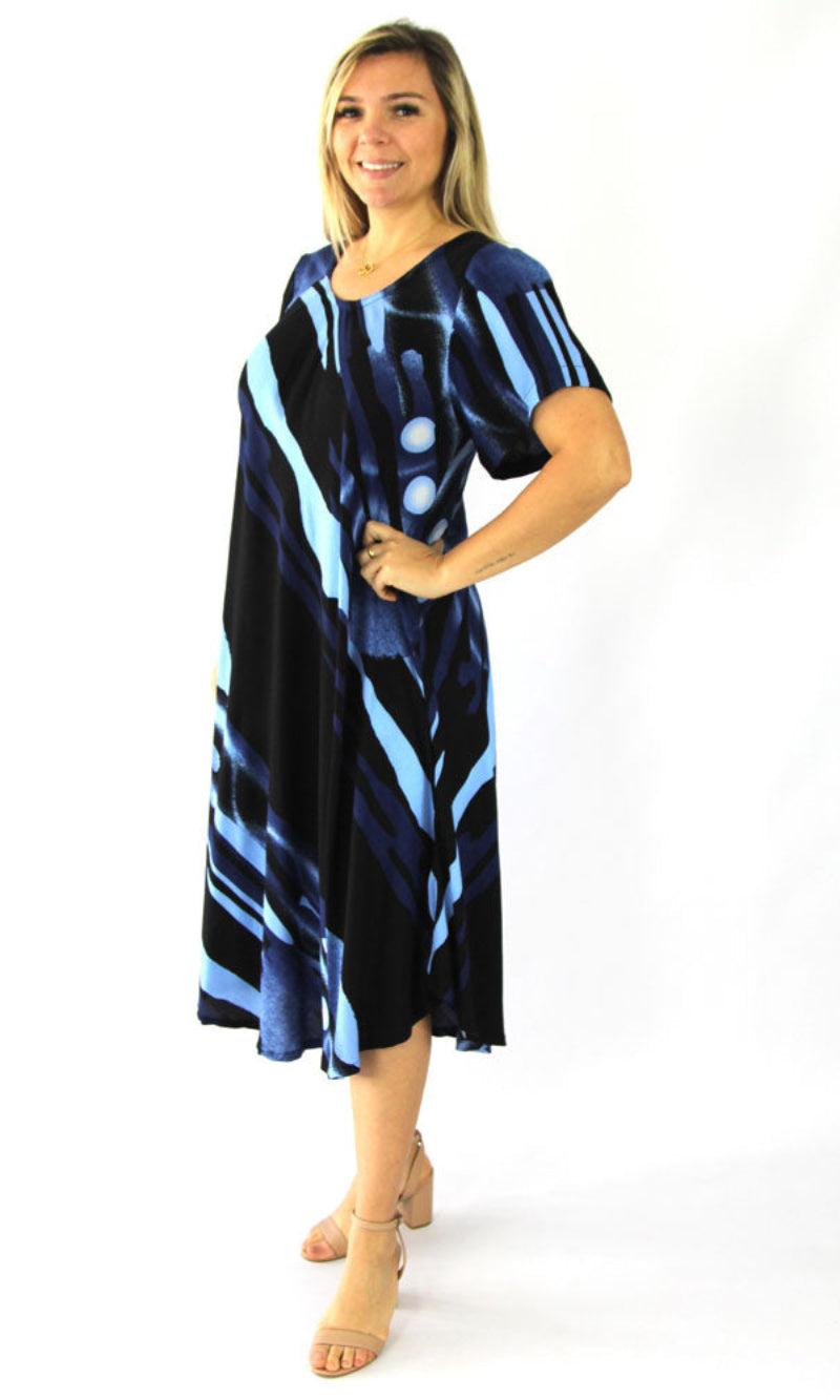 Cool and comfortable sleeveless dress in lovely pre shrunk crinkle rayon. Fabric is cut of the bias to assist the garment to fit many body shapes. Free Sizing 10 - 18.