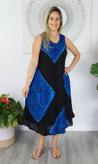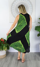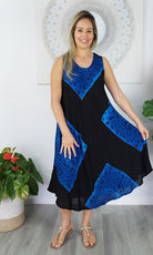 Cool and comfortable sleeveless dress in lovely pre shrunk crinkle rayon. Fabric is cut of the bias to assist the garment to fit many body shapes.