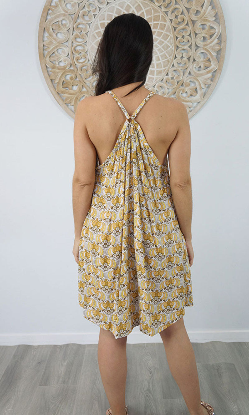 The Short Sherbet dress offers a comfortable and stylish option for warm weather. Made from soft, lightweight rayon, it helps keep you cool, while its loose, flowing silhouette allows for easy movement. Featuring adjustable straps and a distinctive wooden ring at the back, it showcases a trendy racerback design with an elegant touch.