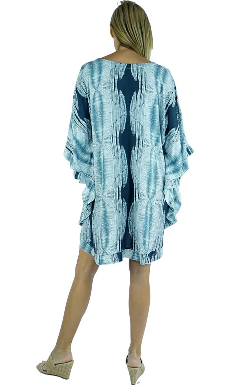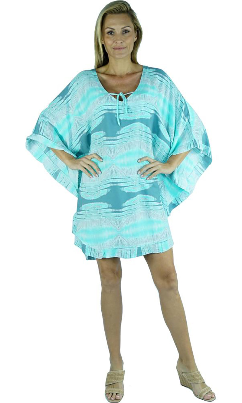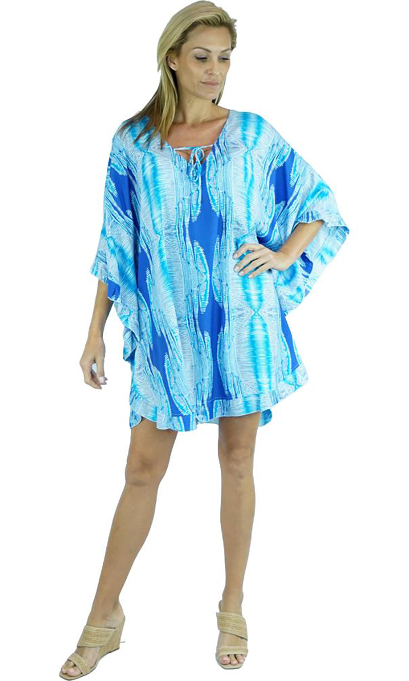 Wear it as a top, a dress, or a tunic over bathers, this product is a complete outfit. A cute tie on the neck line compliments the free flowing figure, while batwing style sleeves give your arms space to move freely.