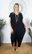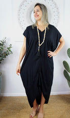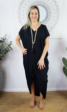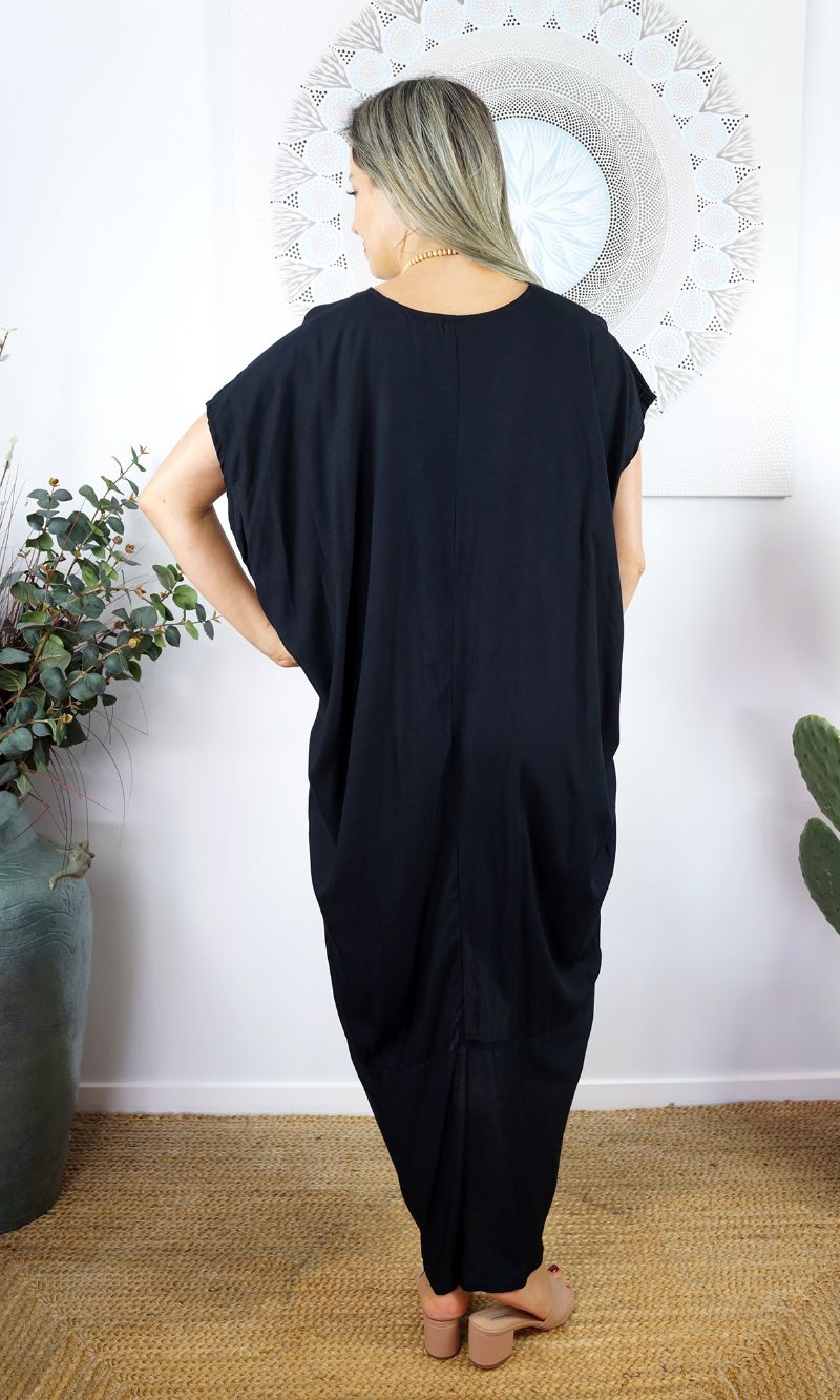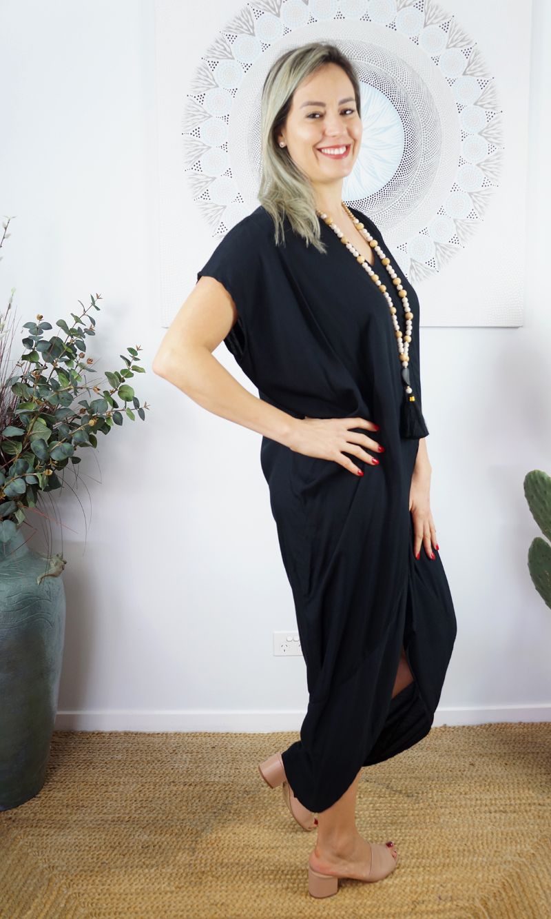 This stylish Toga Dress features a V-neck back and front, open sleeves with button and made from a cool rayon. This product looks great on any body shape, made for comfort.