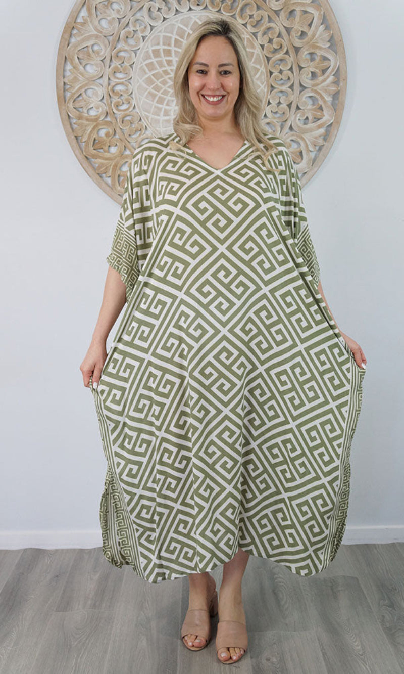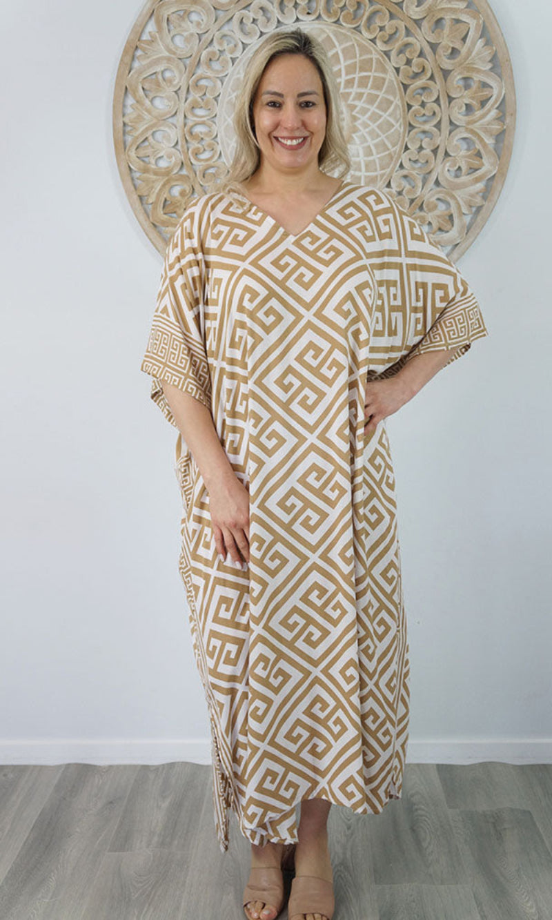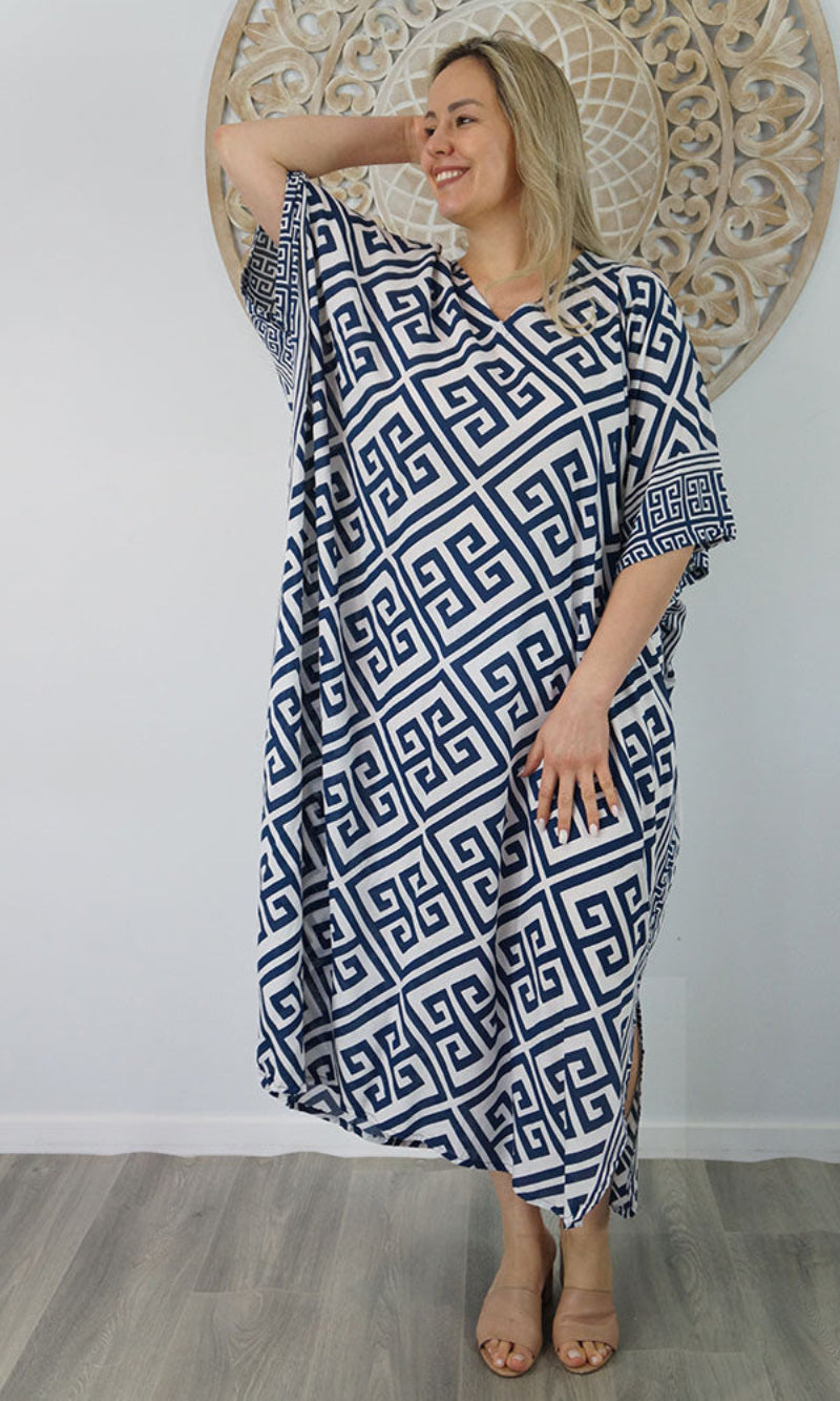 Our kaftans range from rich solid colours to funky patterns. A simple V-neck in the front, side splits on the bottom and a free size from 10-26, this product fits everyone (seriously, these fit everyone).