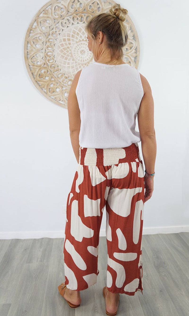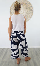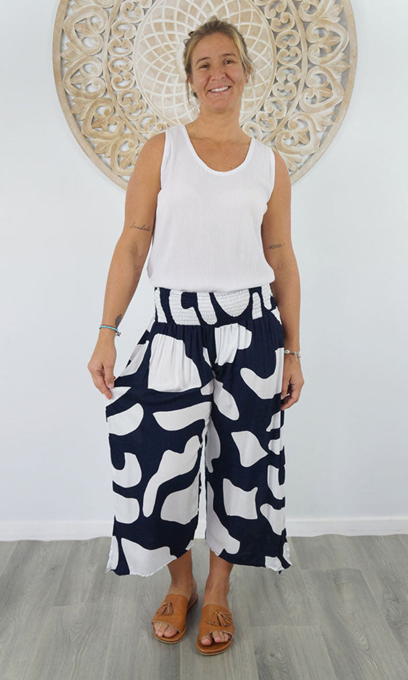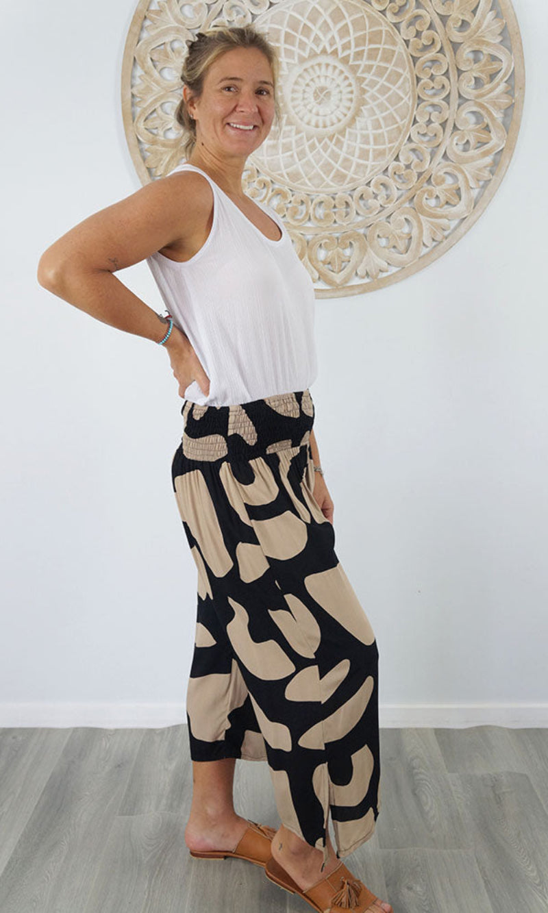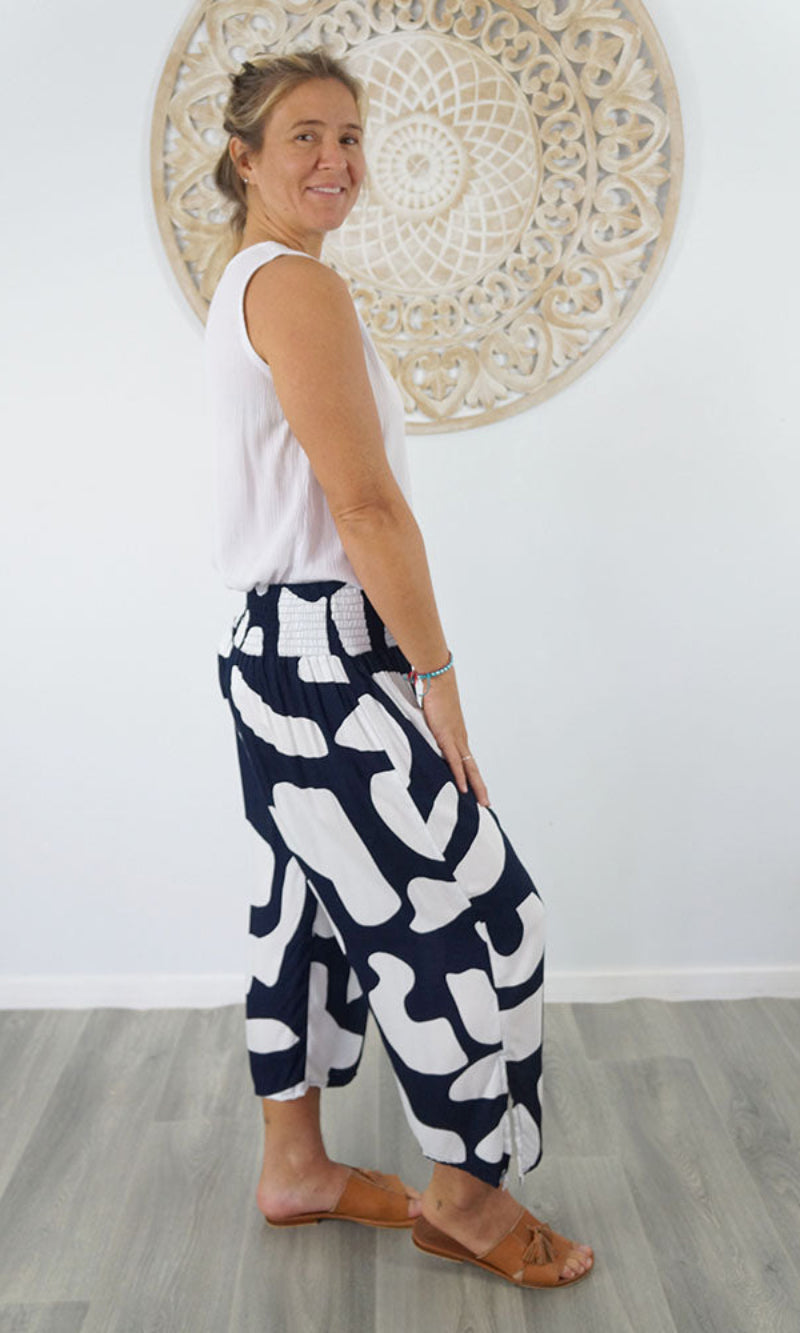 The 3/4 Bazzar pant is a free size garment, fits between size 10-16. This product will give you comfort for an everyday day wear with an elastic waist, wide leg, splits and ties for that classic look. (Can be worn tied or untied at the leg)