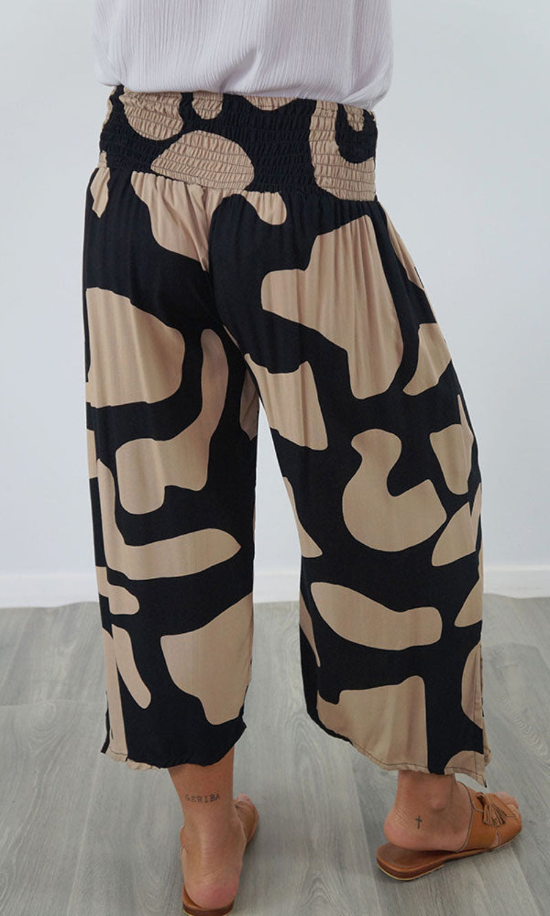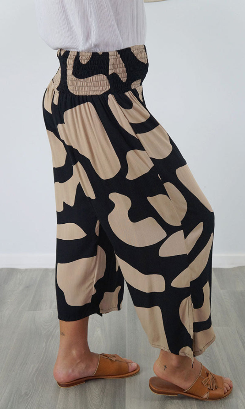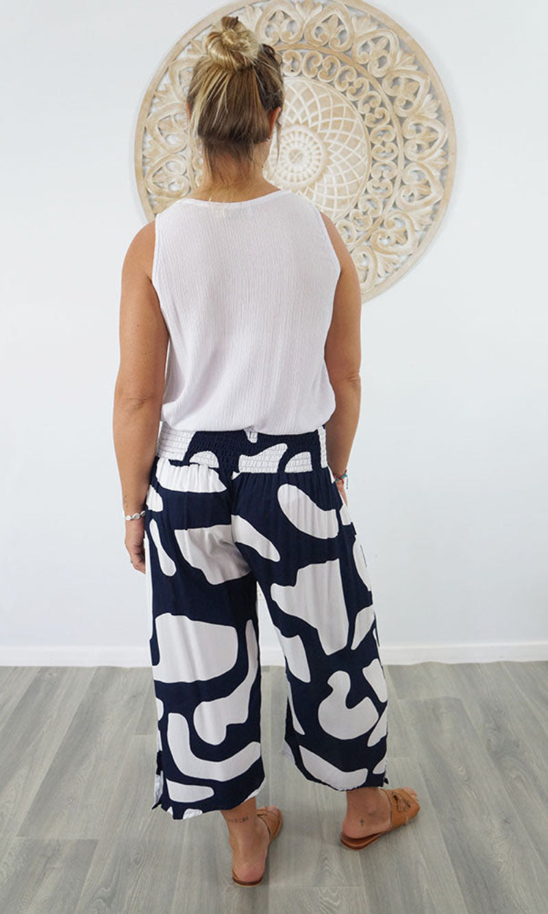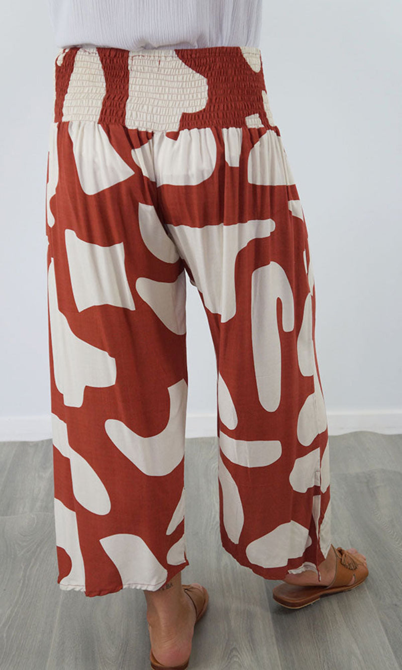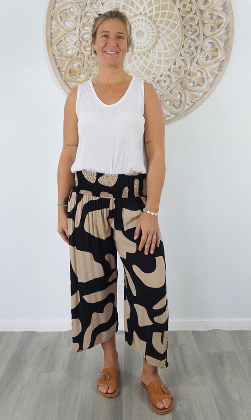 The 3/4 Bazzar pant is a free size garment, fits between size 10-16. This product will give you comfort for an everyday day wear with an elastic waist, wide leg, splits and ties for that classic look. (Can be worn tied or untied at the leg)