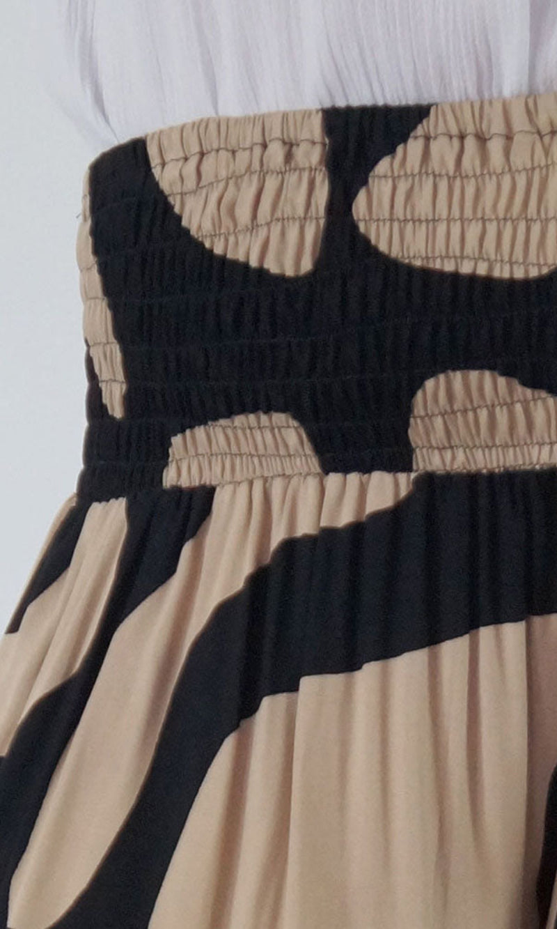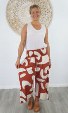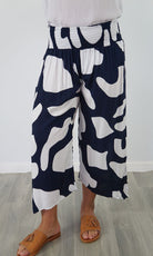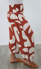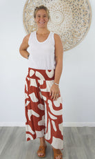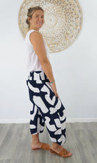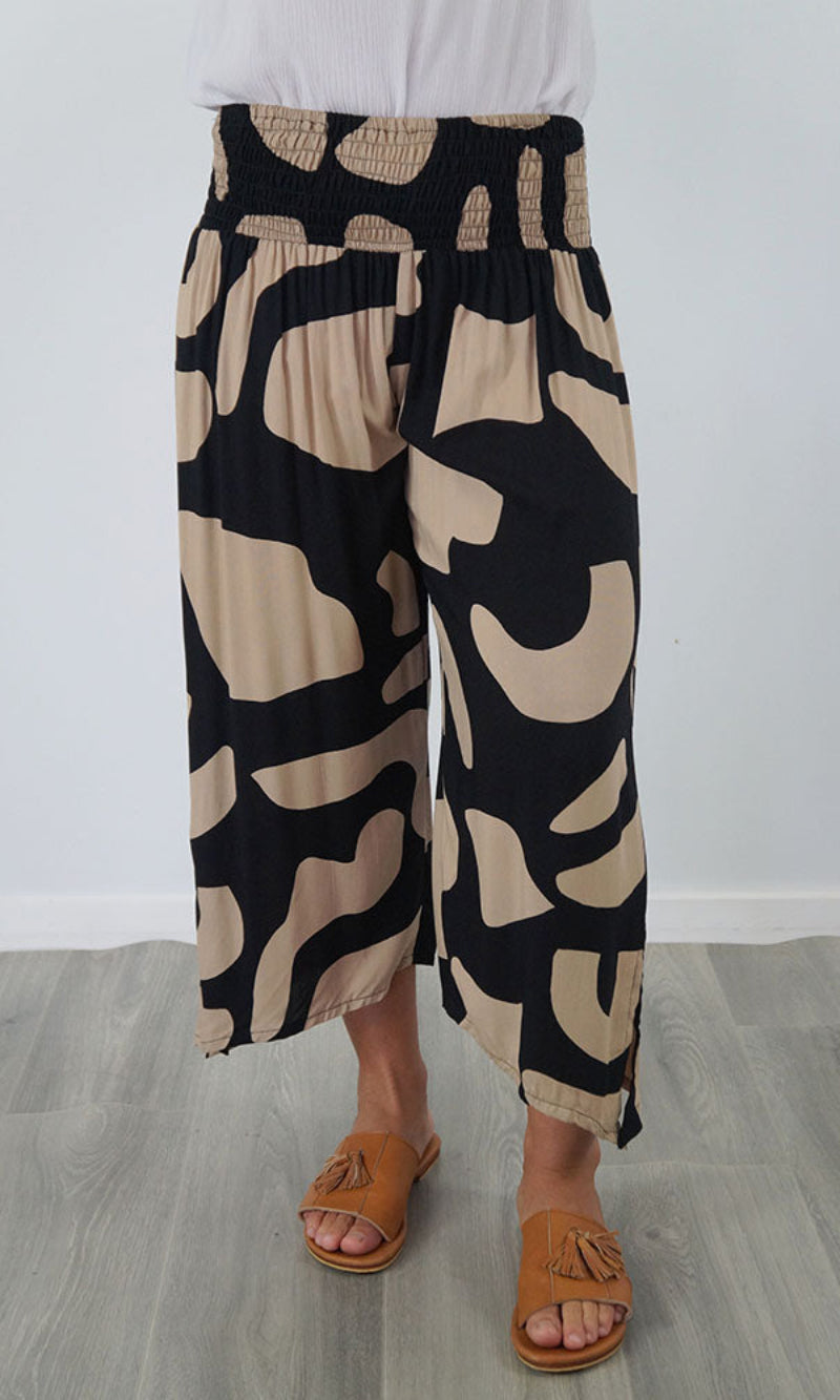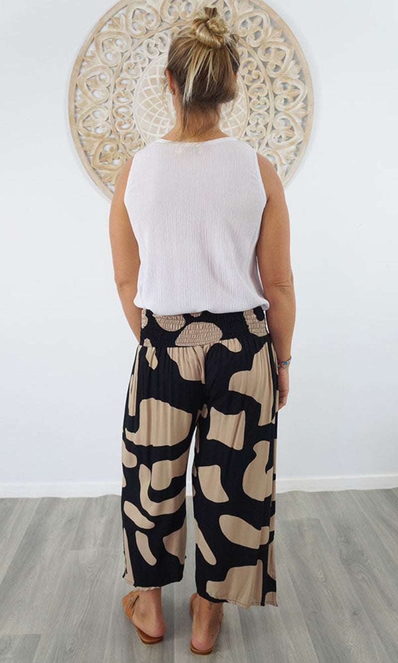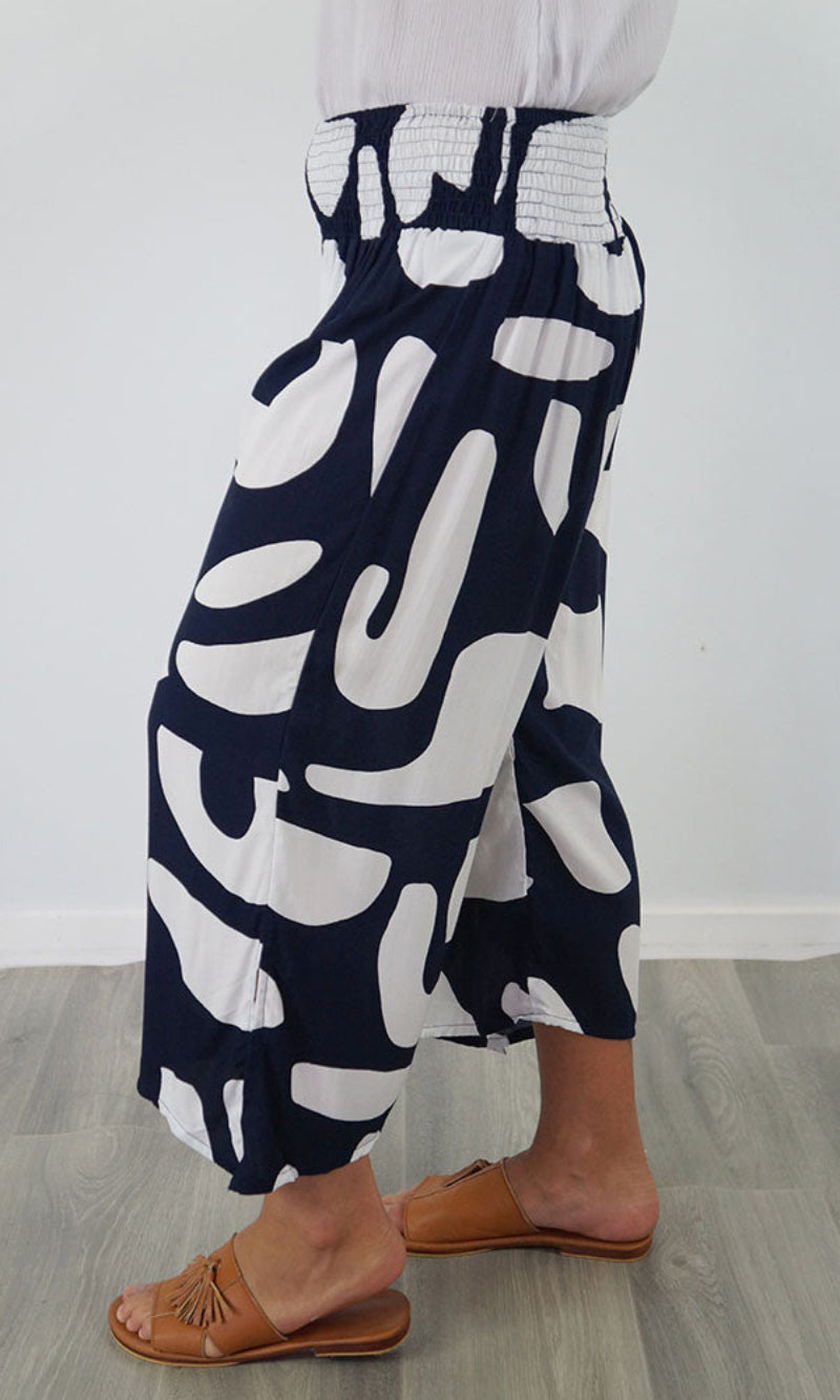 The 3/4 Bazzar pant is a free size garment, fits between size 10-16. This product will give you comfort for an everyday day wear with an elastic waist, wide leg, splits and ties for that classic look. (Can be worn tied or untied at the leg)