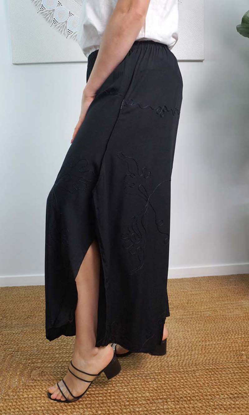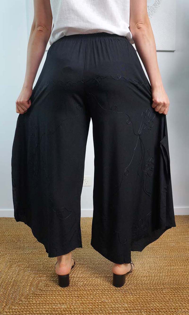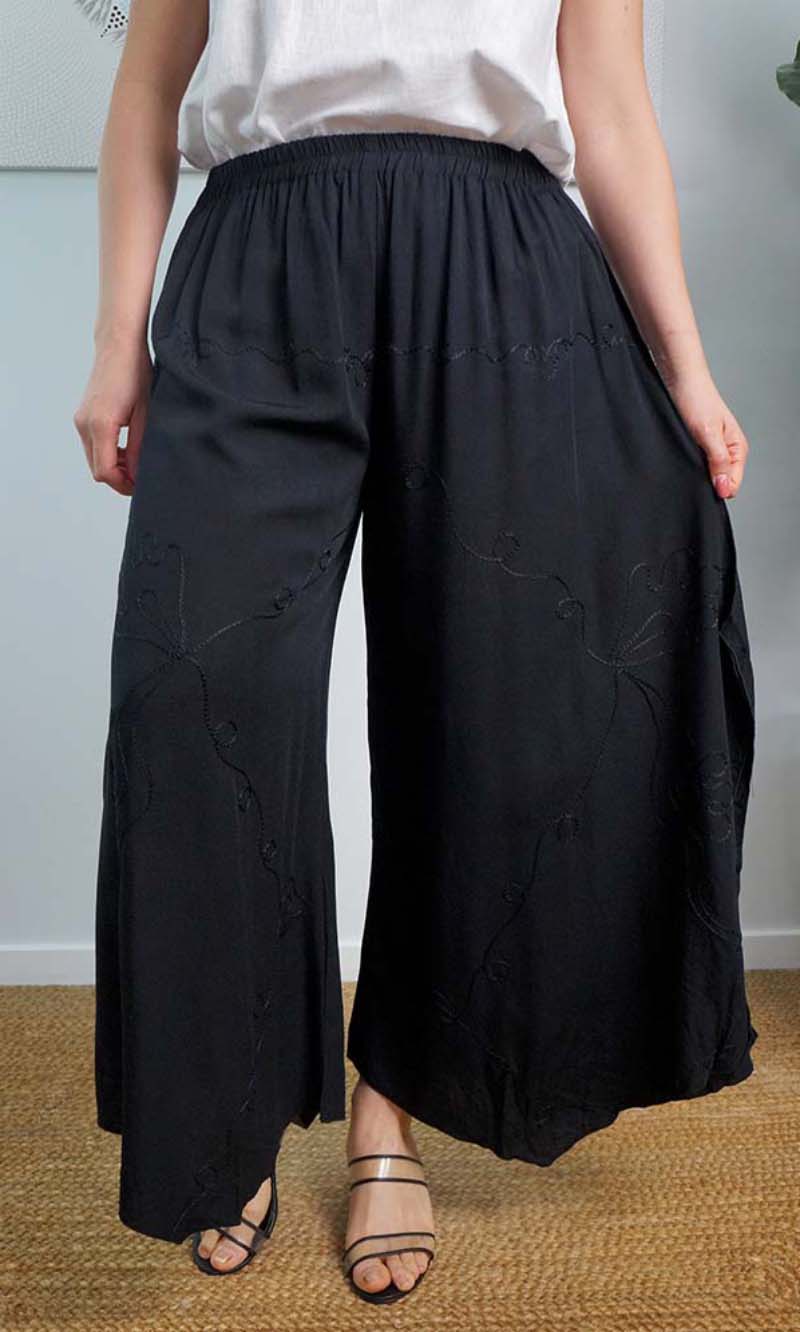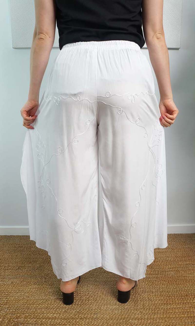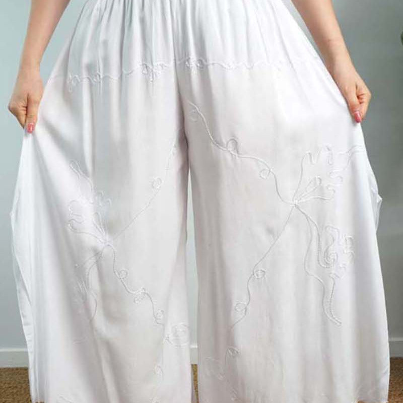 A comfortable embroidered pant with a below knee length split on each leg and a elastic waist to fit sizes 10-16.
