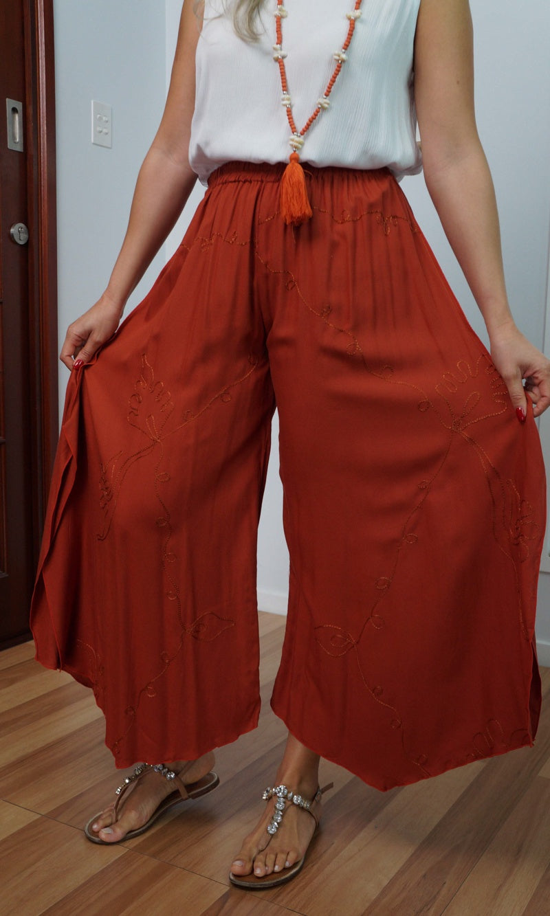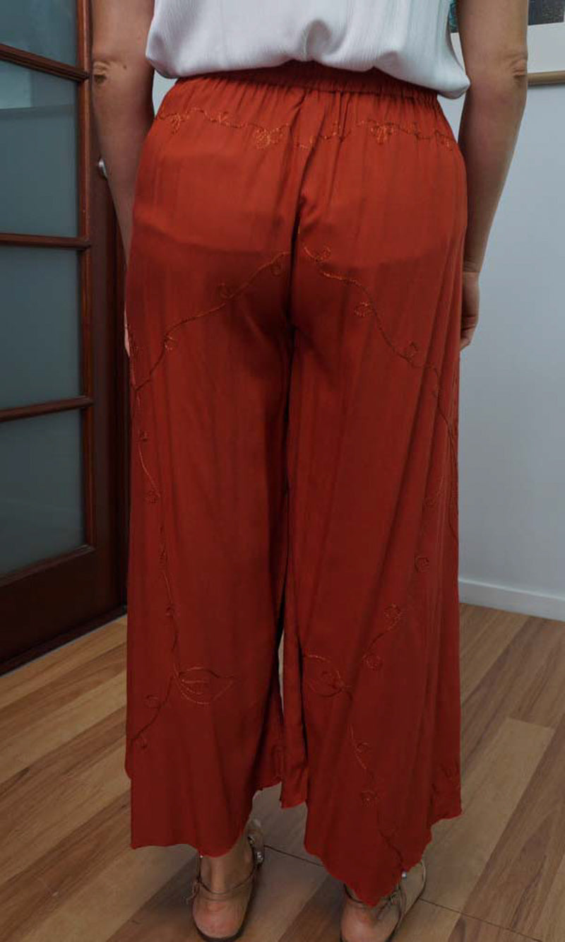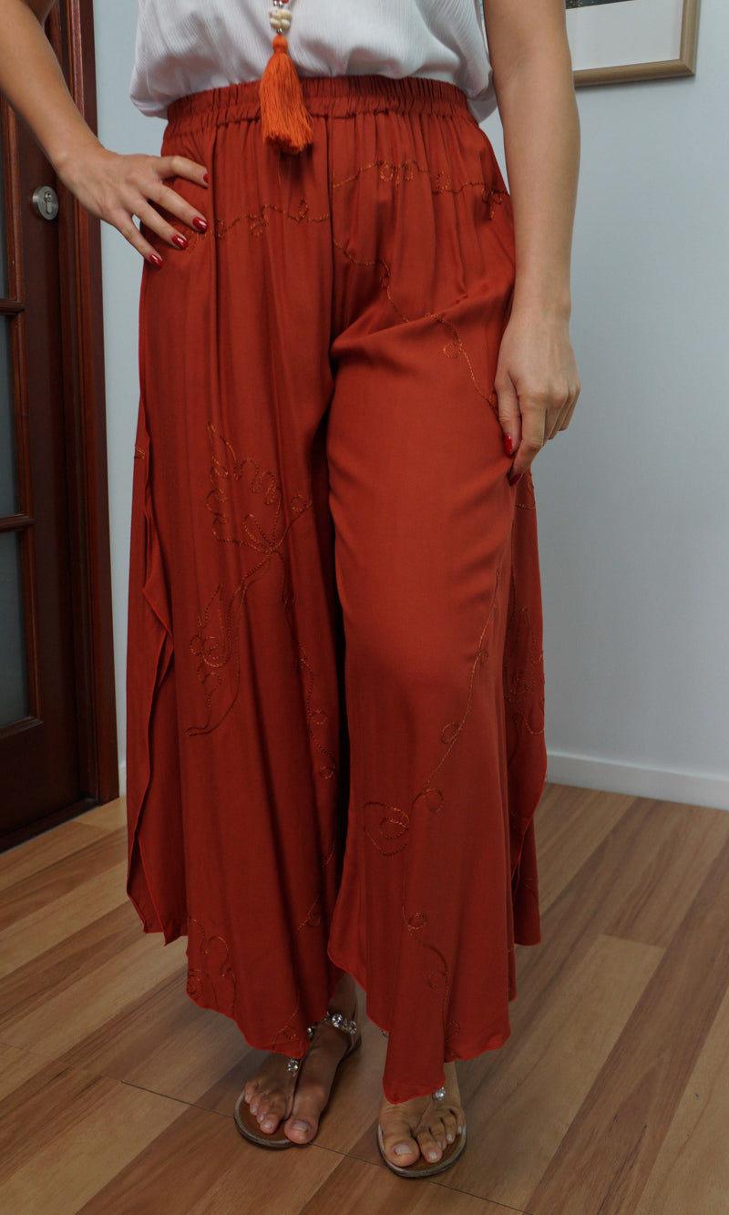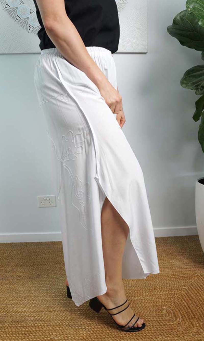 A comfortable embroidered pant with a below knee length split on each leg and a elastic waist to fit sizes 10-16.