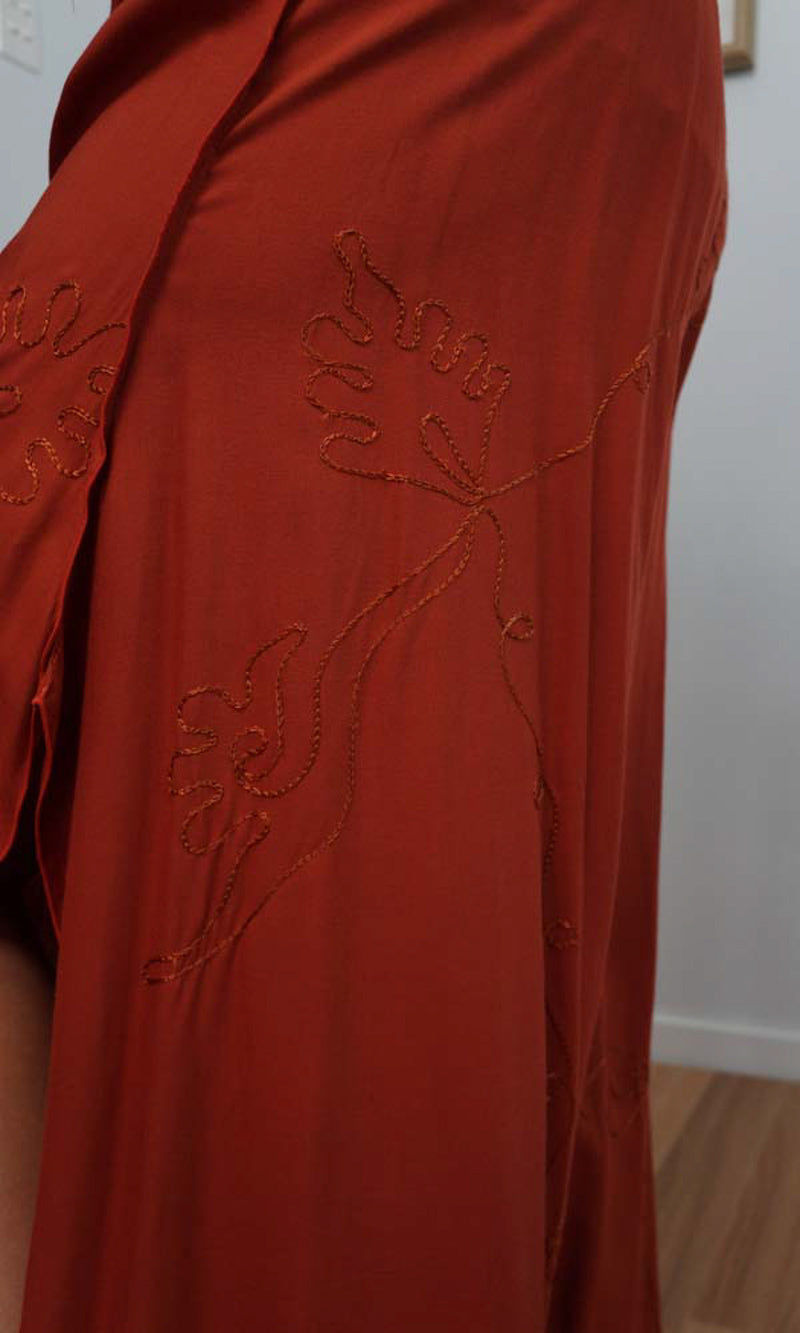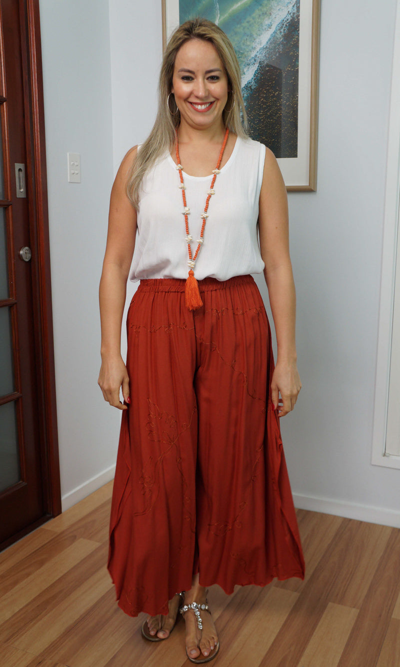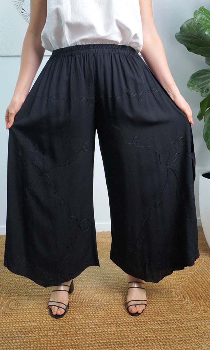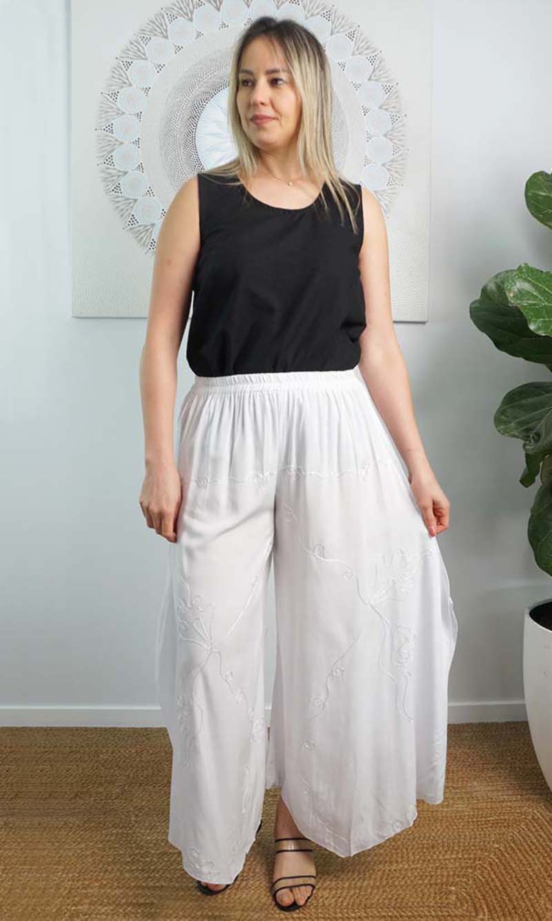 A comfortable embroidered pant with a below knee length split on each leg and a elastic waist to fit sizes 10-16.