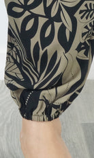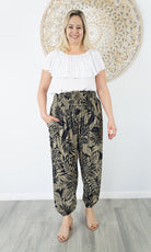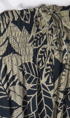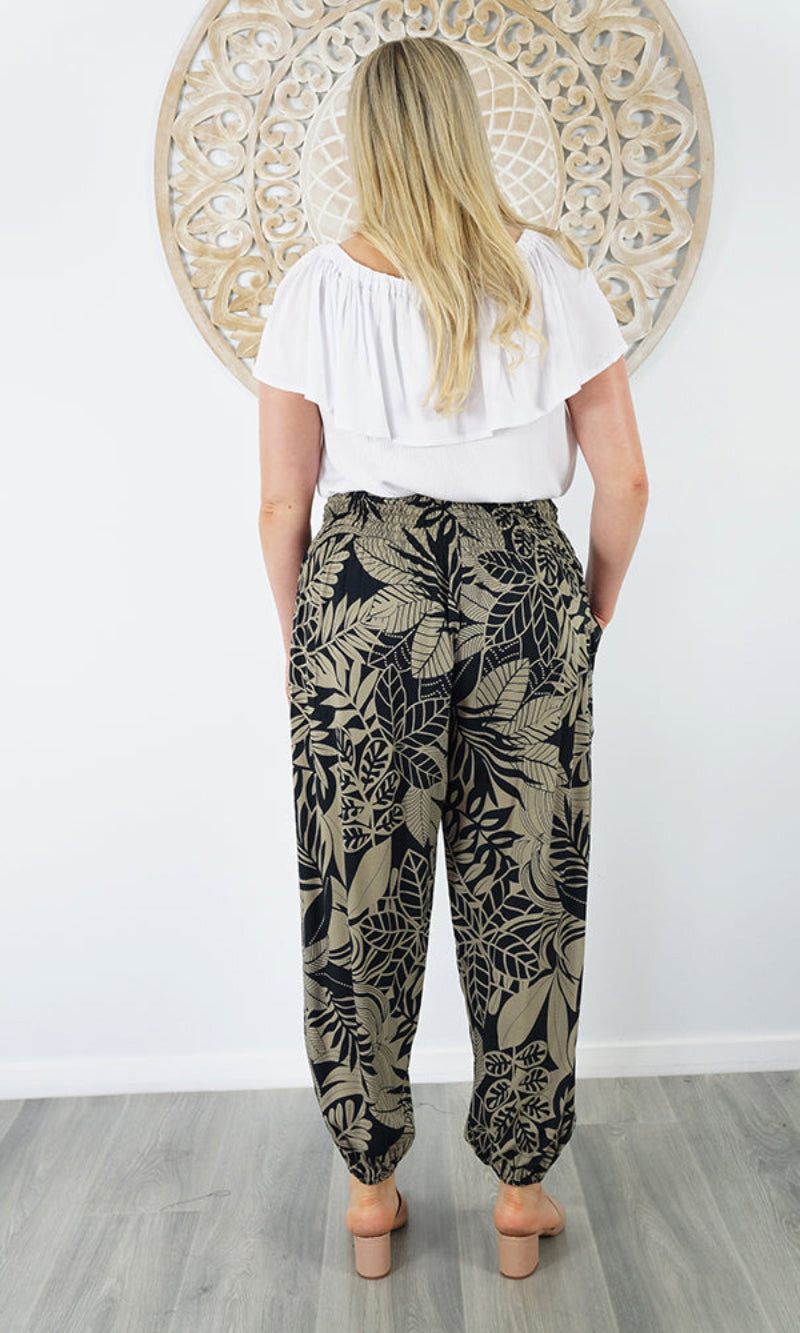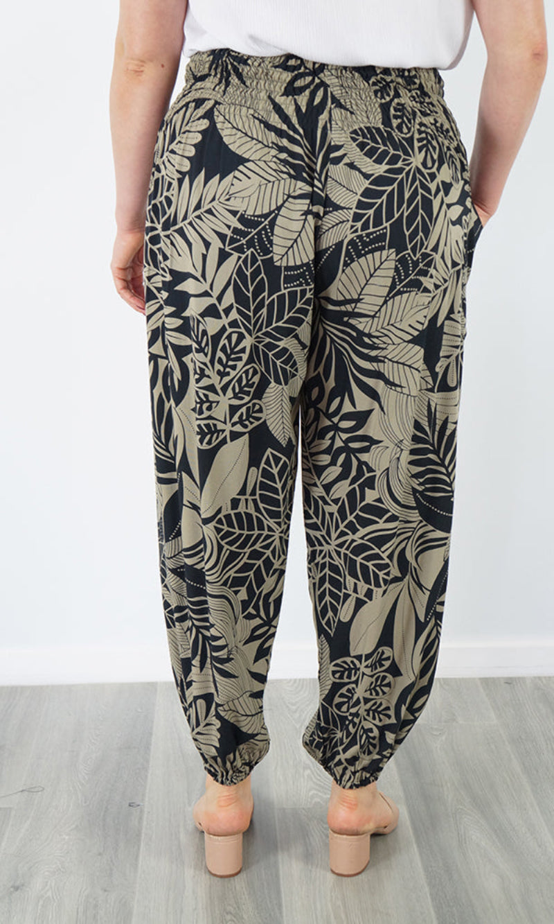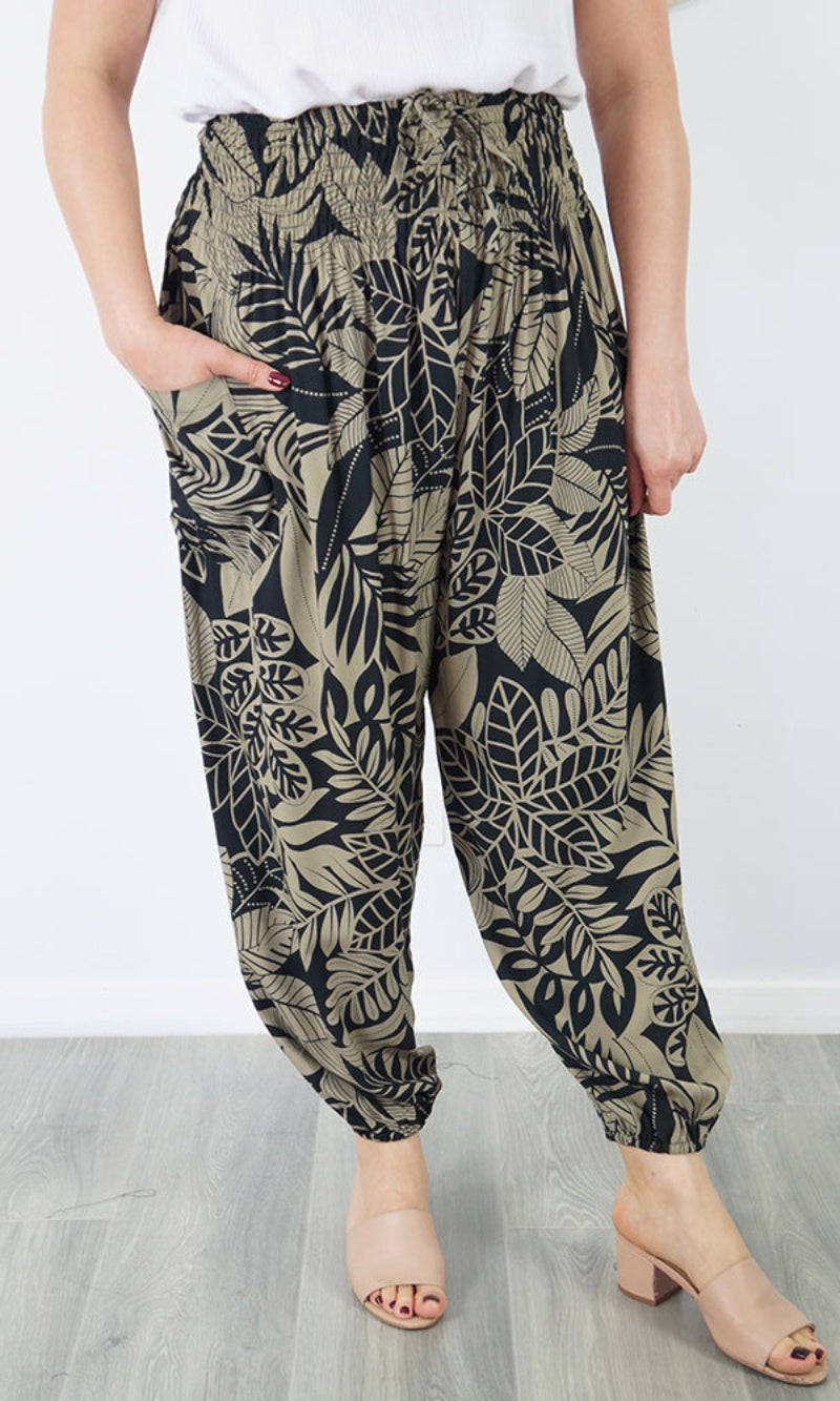 The harem pant is 100% rayon and 100% comfort, with shirring around the waist and elastic around the ankle. 3 sizes available. Free size to fit 10-16, 18-20 and 22-24.