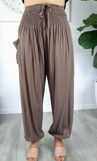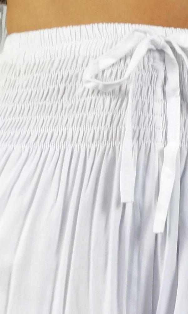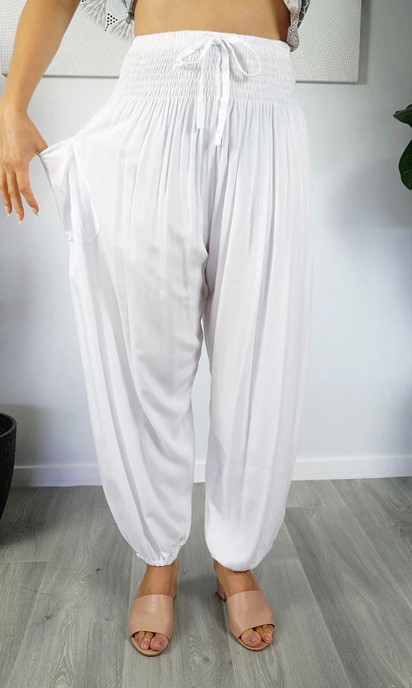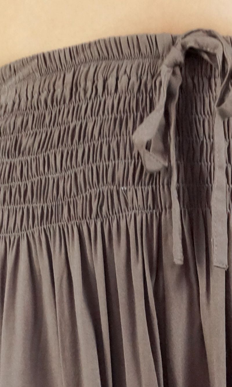 The harem pant is 100% rayon and 100% comfort, with shirring around the waist and elastic around the ankle. 3 sizes available. Free size to fit 10-16, 18-20 and 22-24.