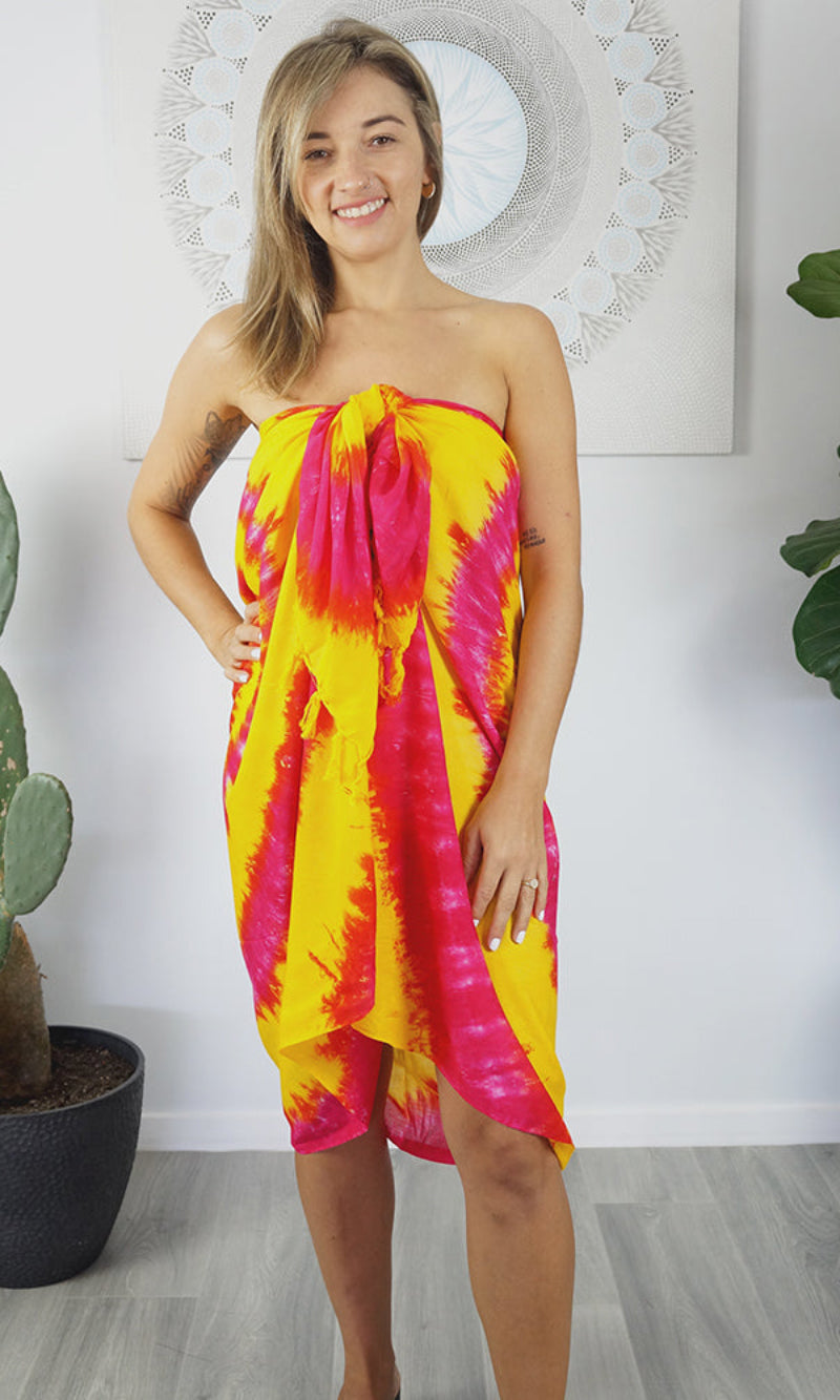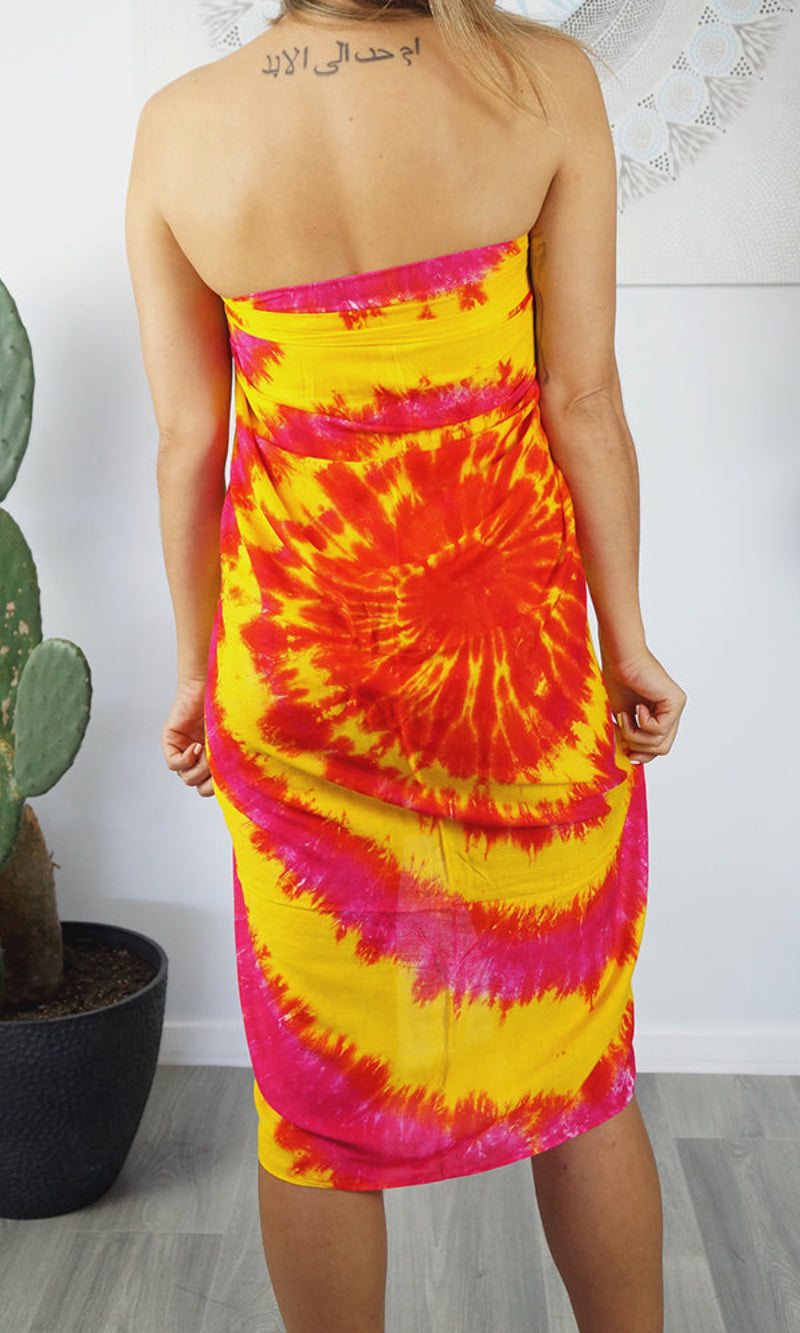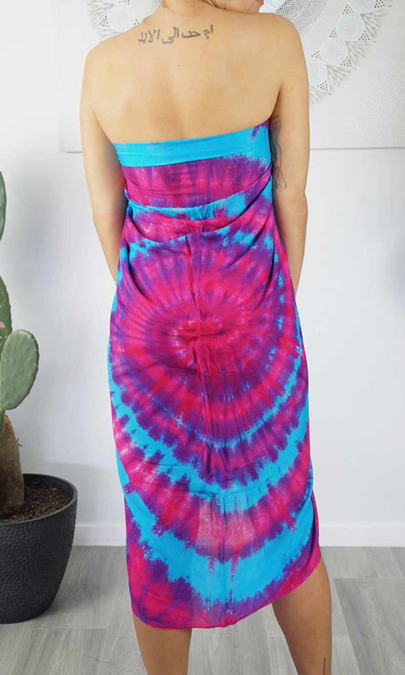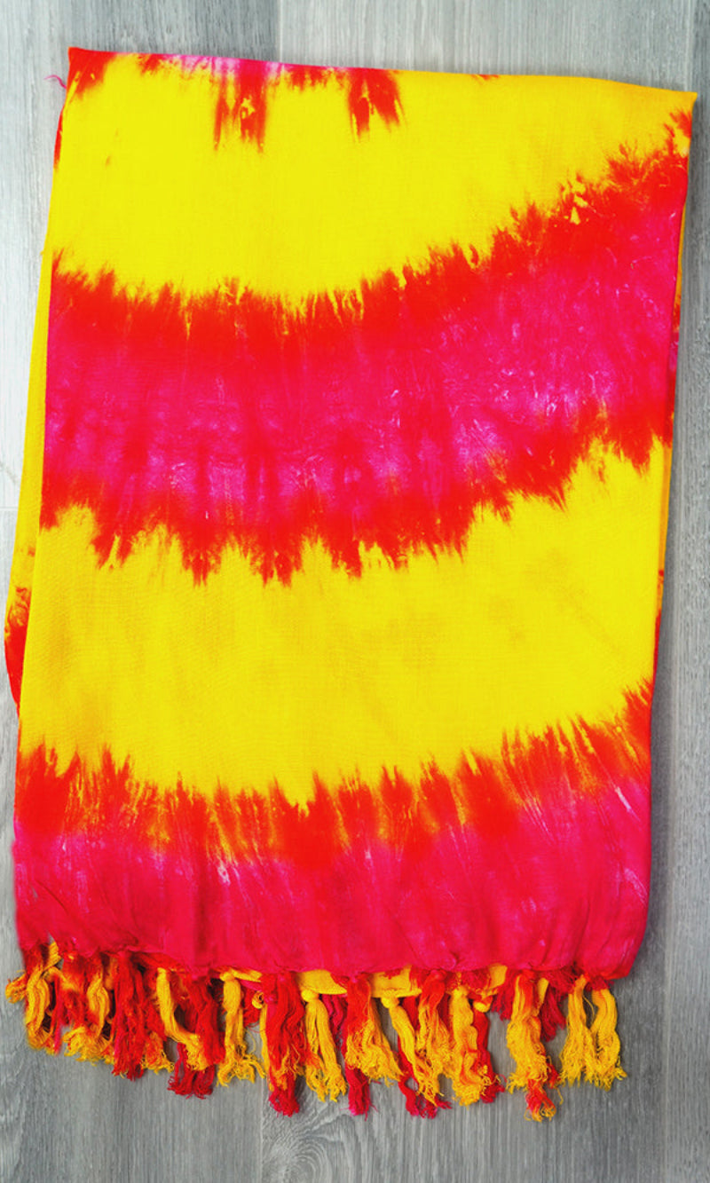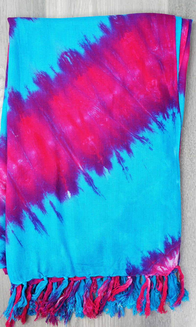 These "Tie Dye" Spiral sarongs are a great cover up for a day at the beach, pool, lake or wherever else your heart desires. Sarong measures approximately 1.8M x 1.15M on fringed lightweight rayon.