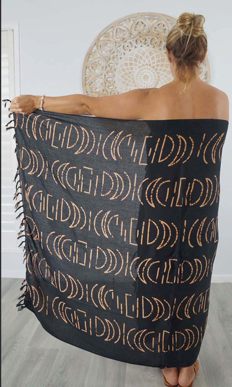 These Half Moon printed sarongs are a great cover up for a day at the beach, pool, lake or wherever else your heart desires. Sarong measures approximately 1.8M x 1.15M on fringed lightweight rayon.