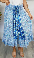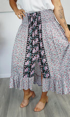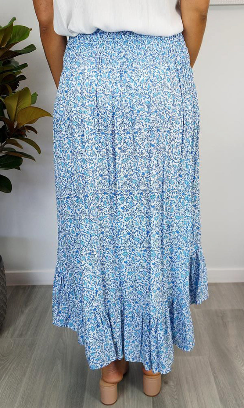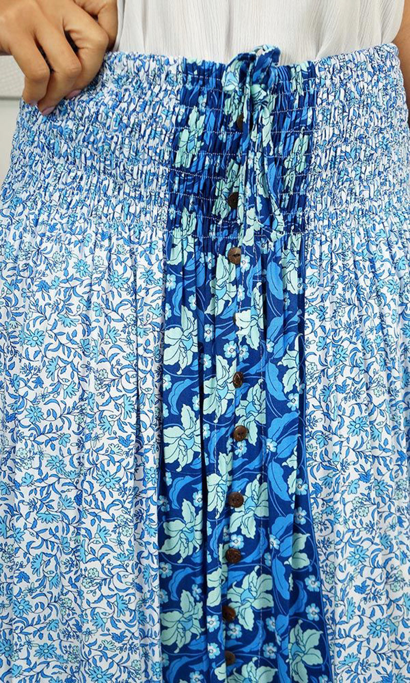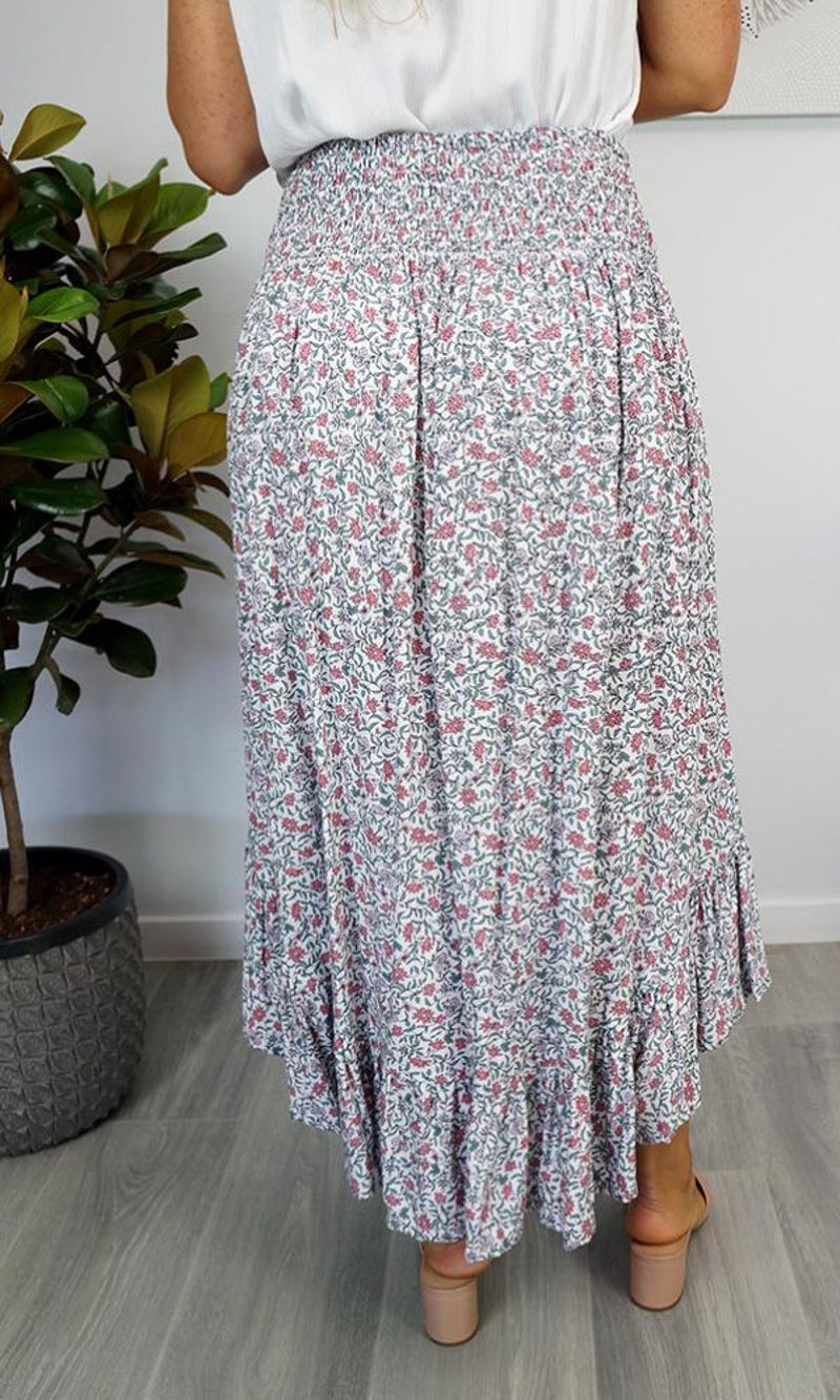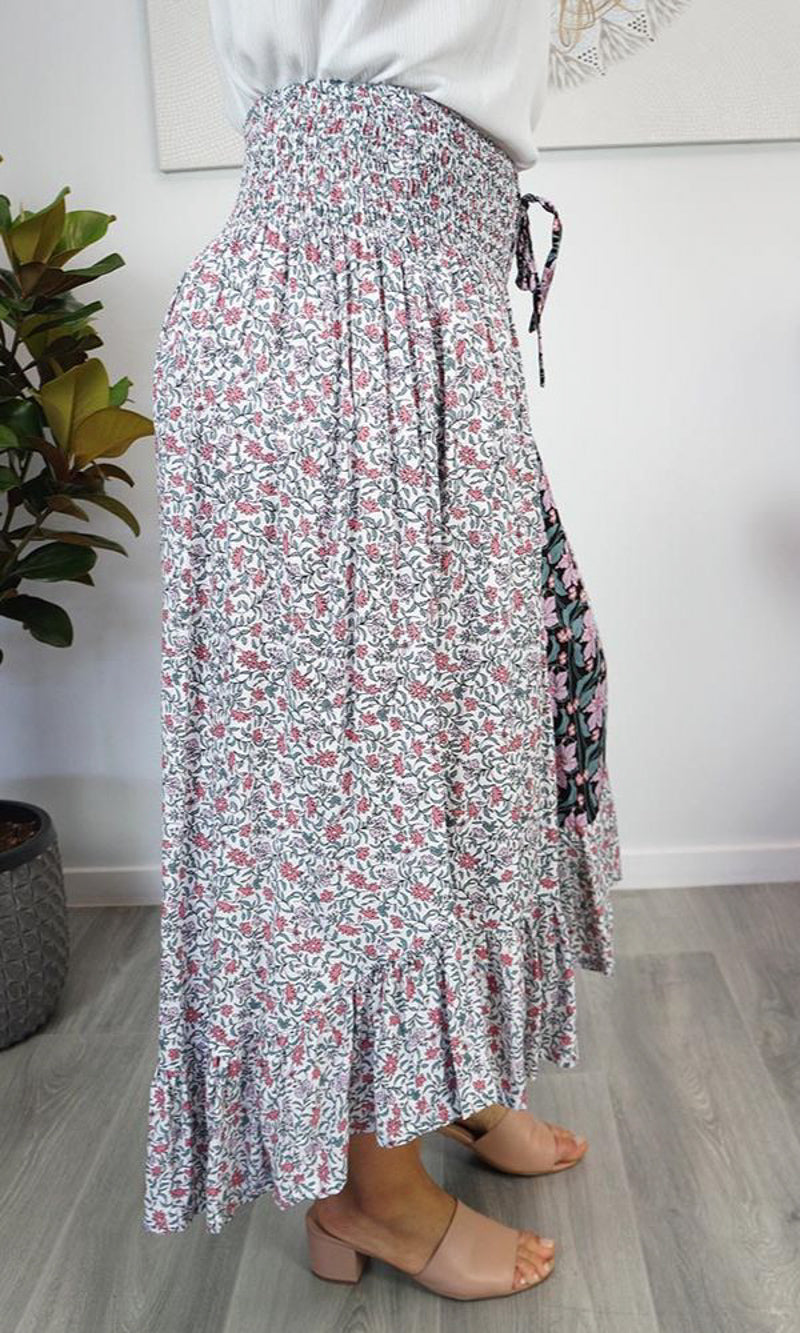 The Tangelo Skirt is fun and flirty. This "hi-low" skirt is the perfect length that can worn at as a casual or dressed up. The elastic smock waist ensures a comfortable fit for a wide range of sizes. Free size fits 8-16.