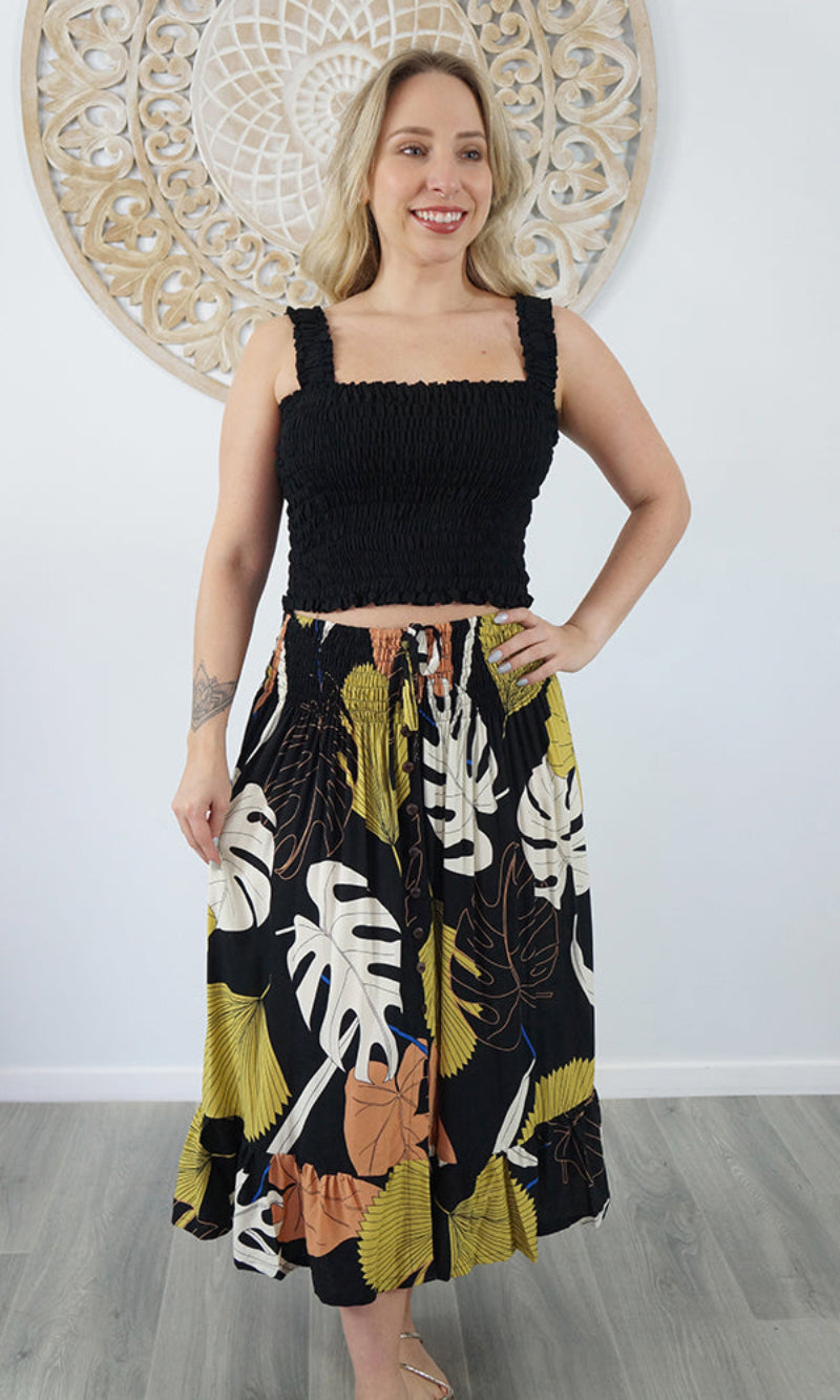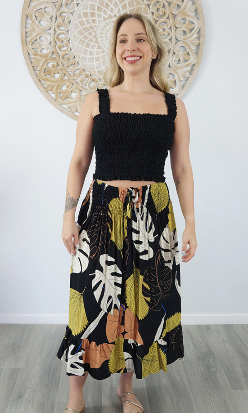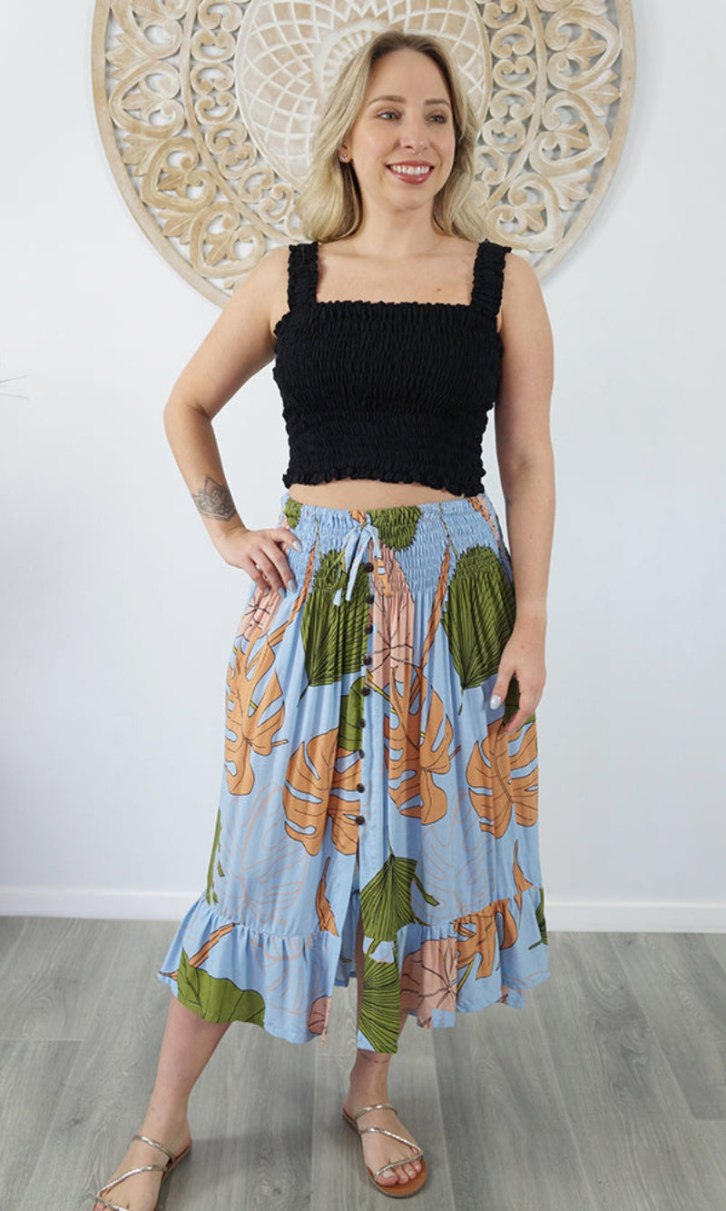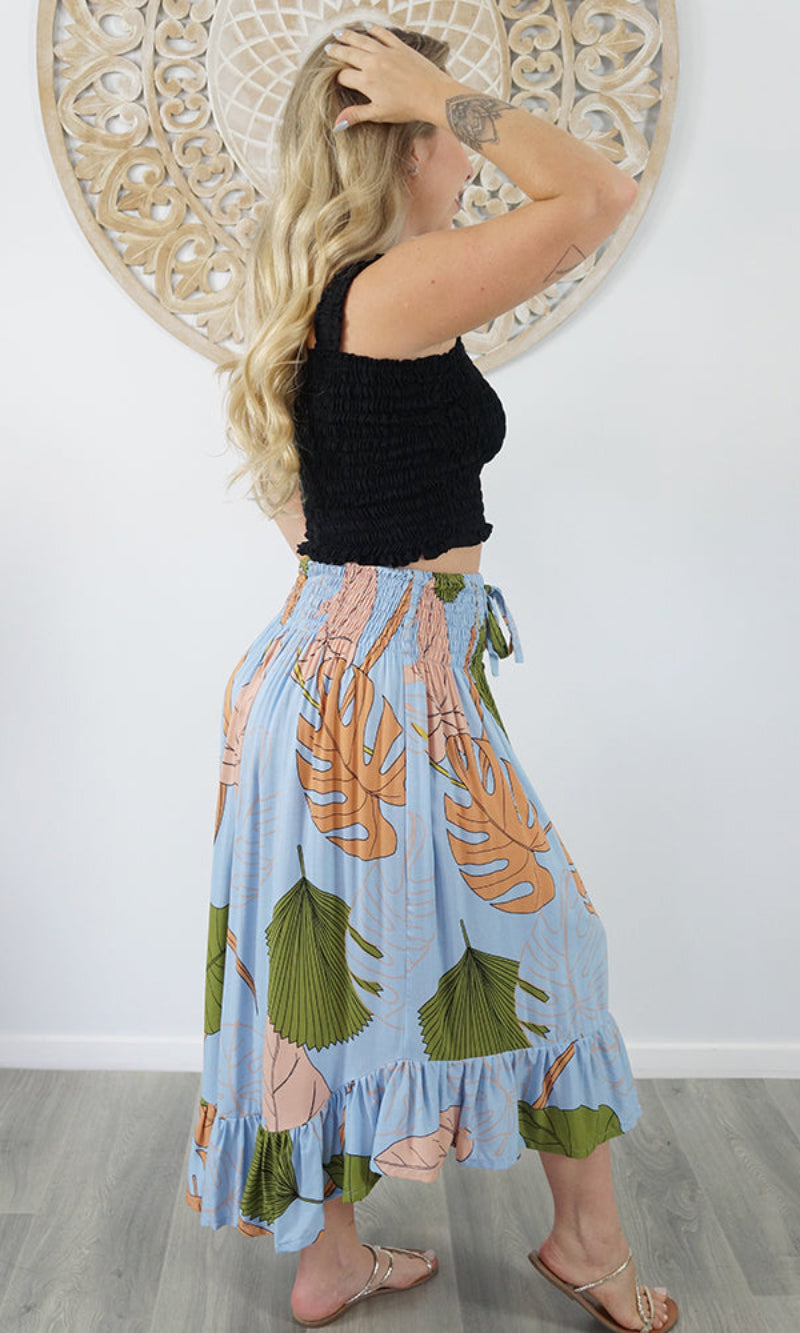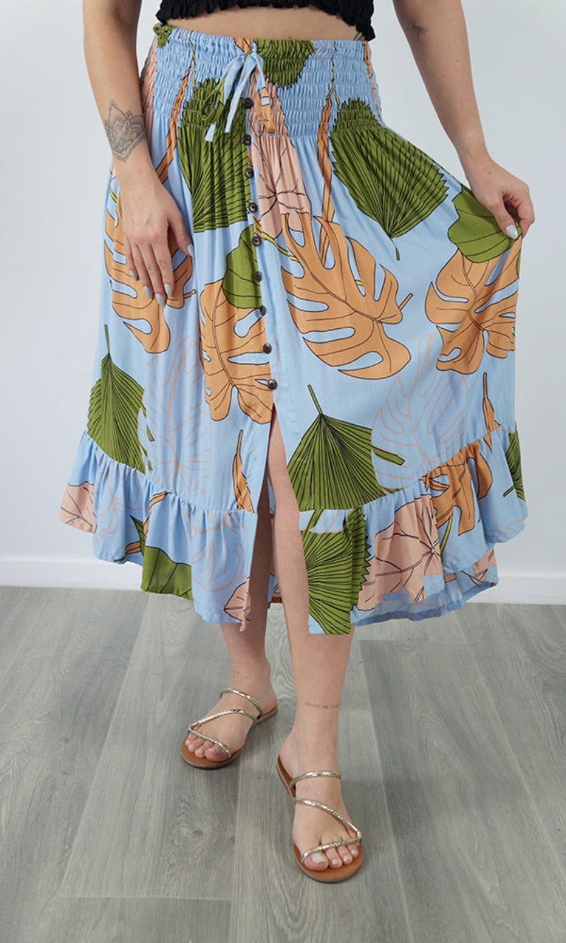 The Tangelo Skirt is fun and flirty. This "hi-low" skirt is the perfect length that can worn at as a casual or dressed up. The elastic smock waist ensures a comfortable fit for a wide range of sizes. Free size fits 8-16.