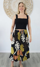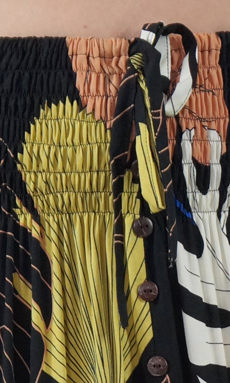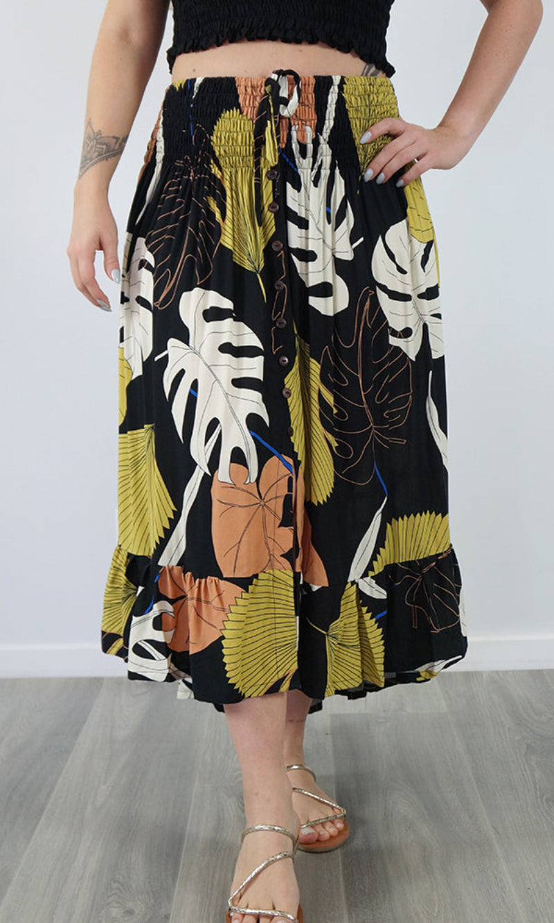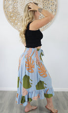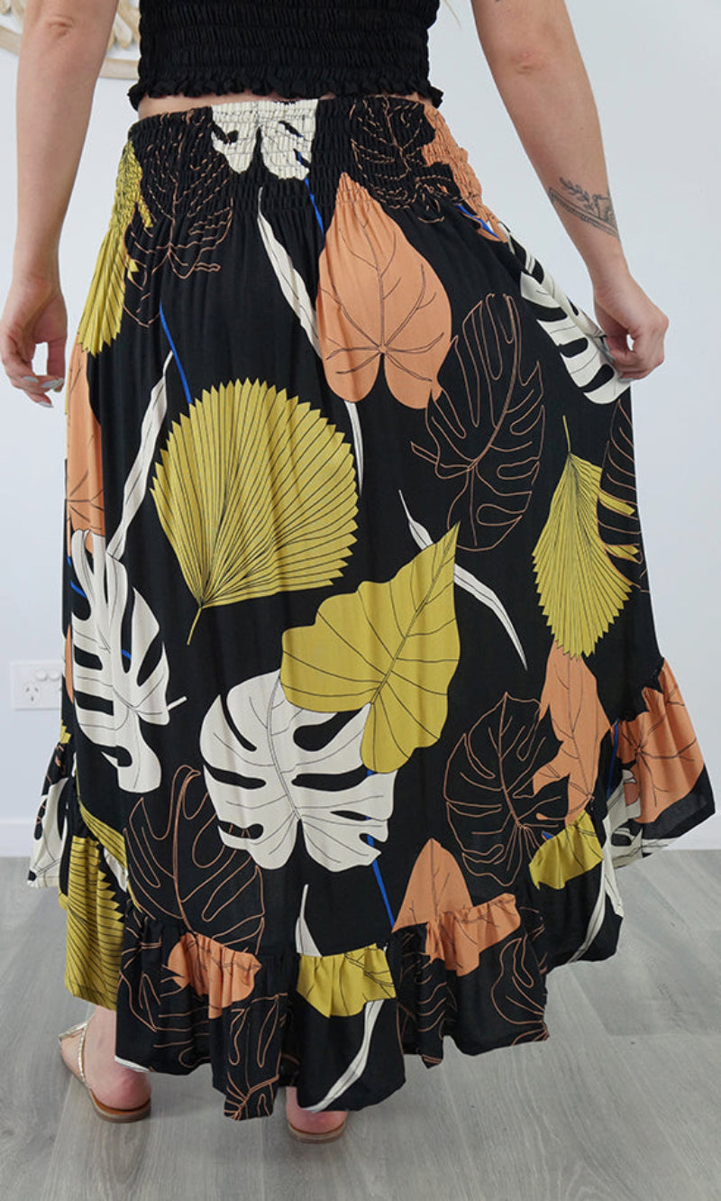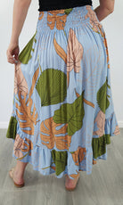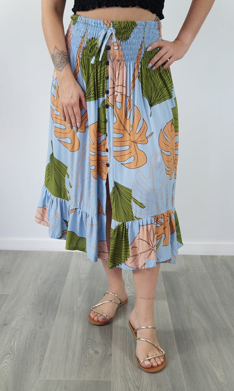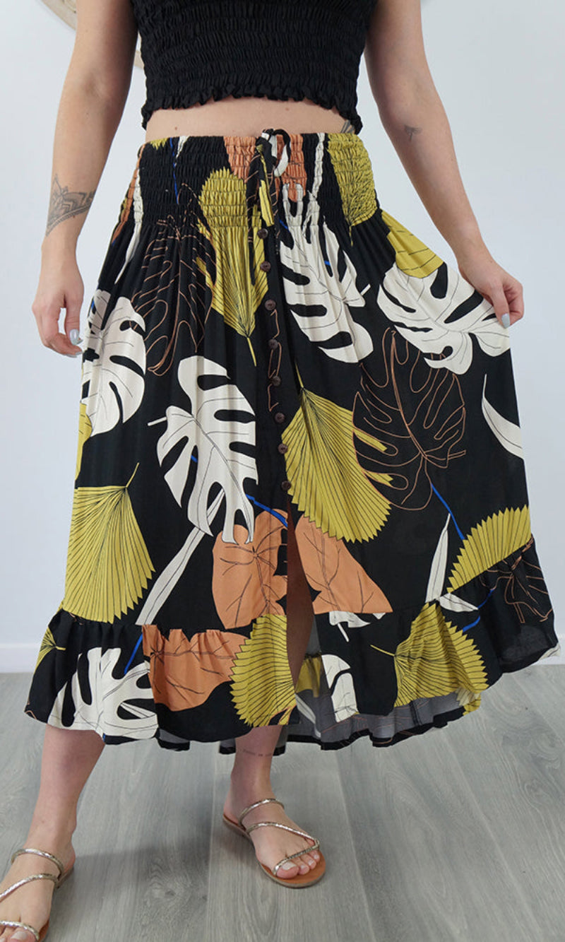 The Tangelo Skirt is fun and flirty. This "hi-low" skirt is the perfect length that can worn at as a casual or dressed up. The elastic smock waist ensures a comfortable fit for a wide range of sizes. Free size fits 8-16.