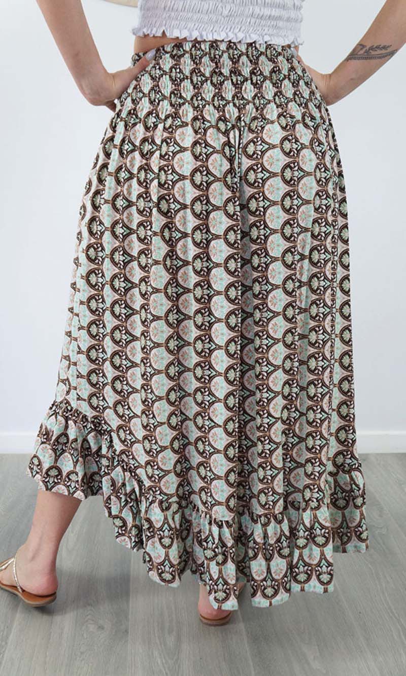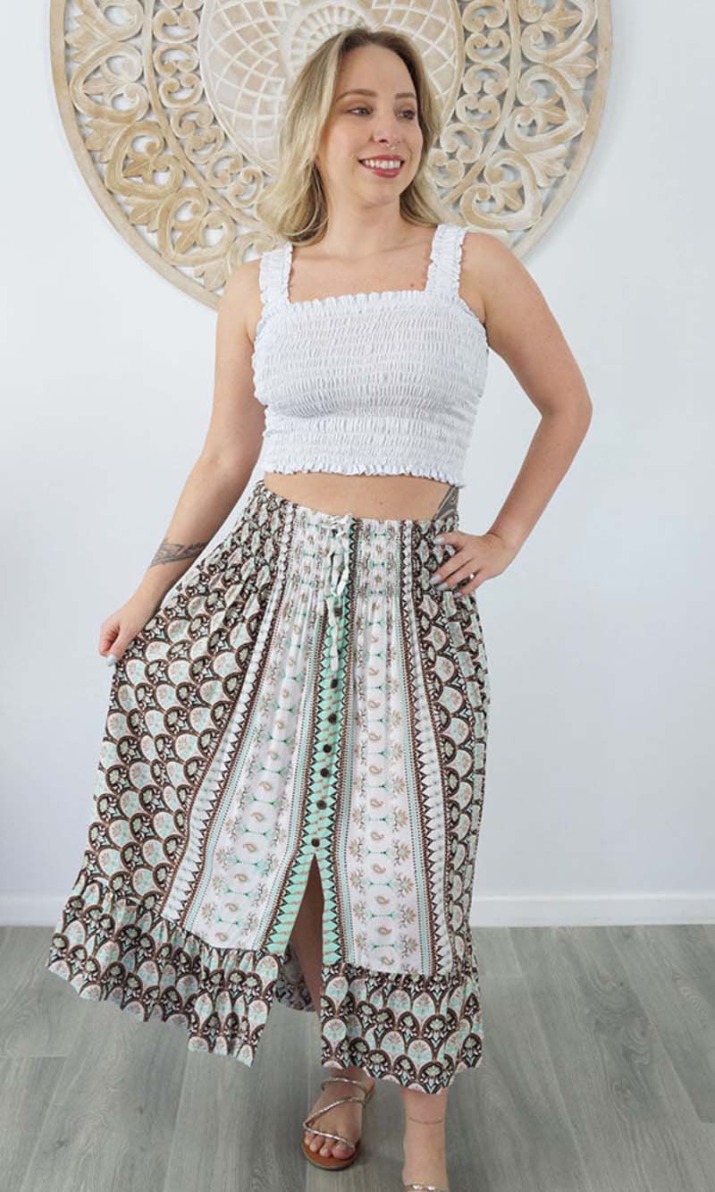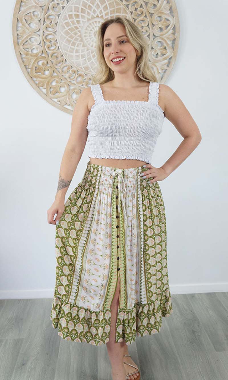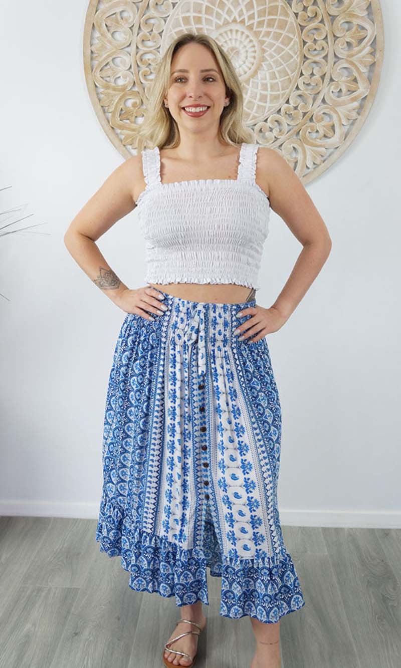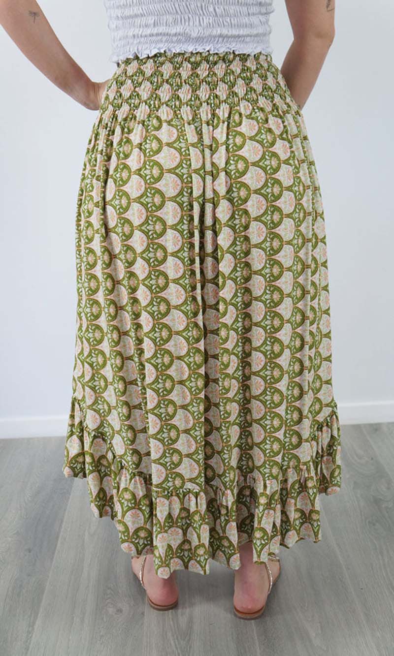 The Tangelo Skirt is fun and flirty. This "hi-low" skirt is the perfect length that can worn at as a casual or dressed up. The elastic smock waist ensures a comfortable fit for a wide range of sizes. Free size fits 8-16.