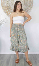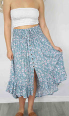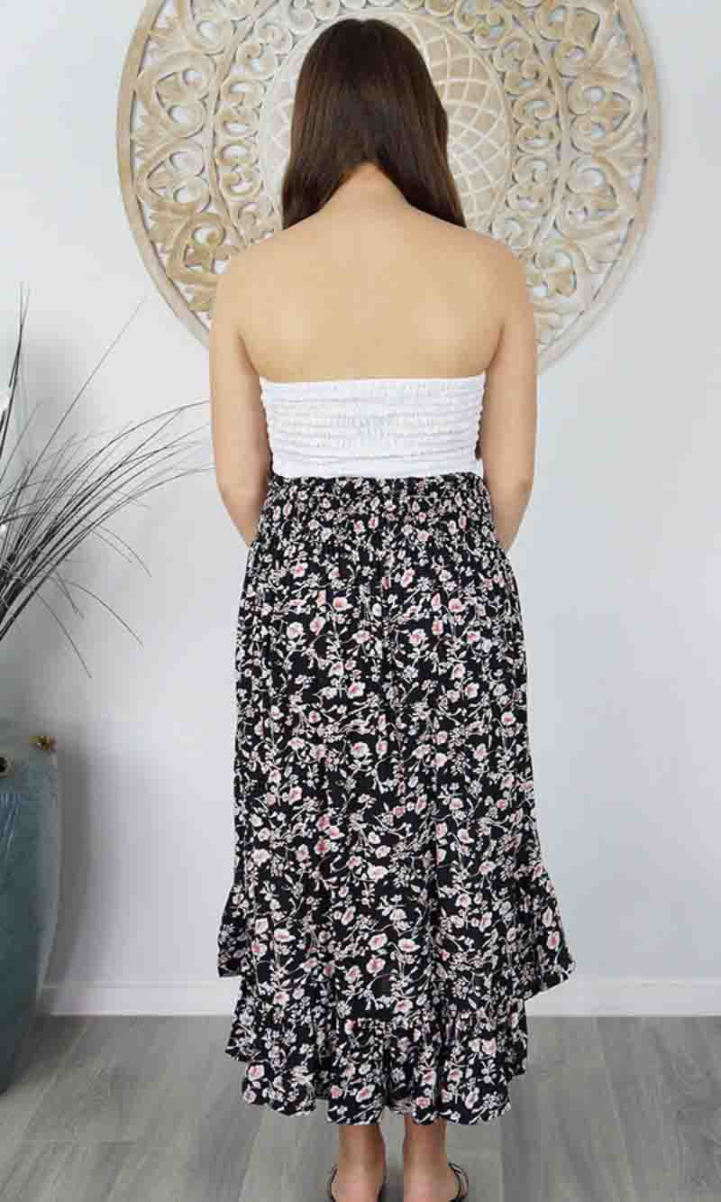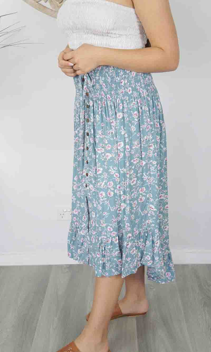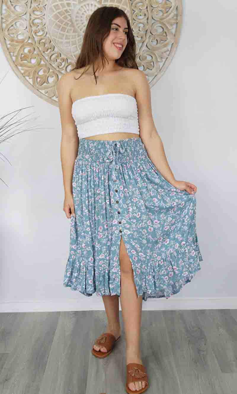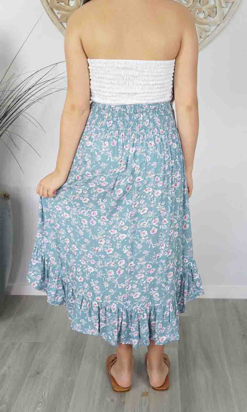 The Tangelo Skirt is fun and flirty. This "hi-low" skirt is the perfect length that can worn at as a casual or dressed up. The elastic smock waist ensures a comfortable fit for a wide range of sizes. Free size fits 8-16.
