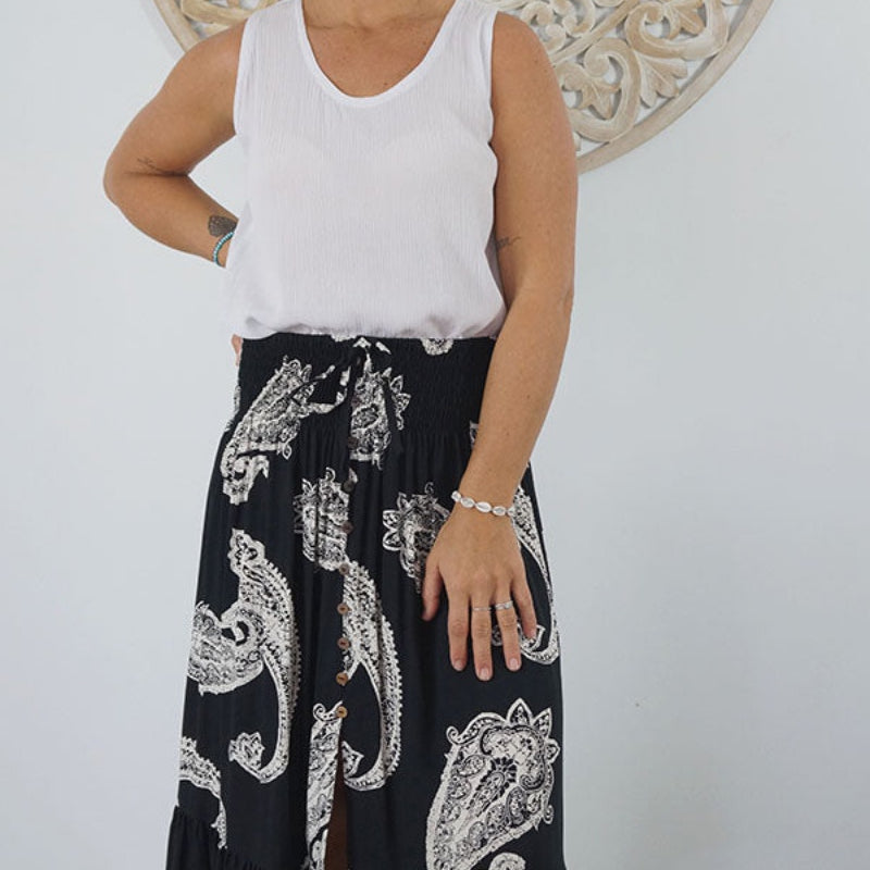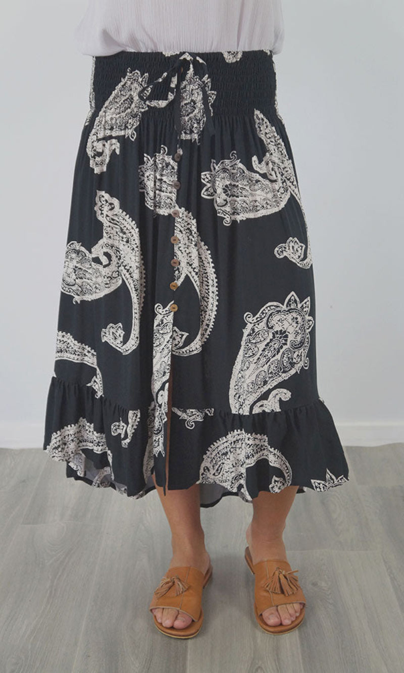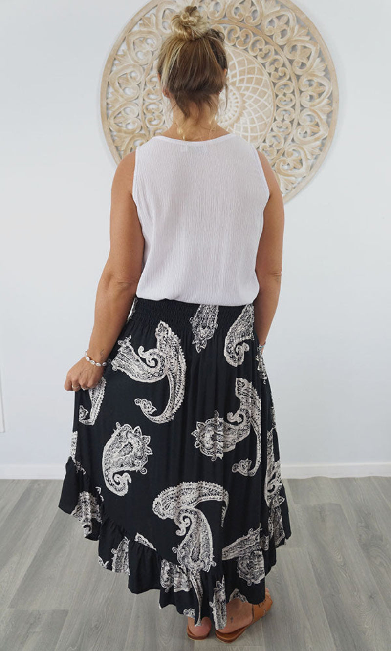 The Tangelo Skirt is fun and flirty. This "hi-low" skirt is the perfect length that can worn at as a casual or dressed up. The elastic smock waist ensures a comfortable fit for a wide range of sizes. Free size fits 8-16.