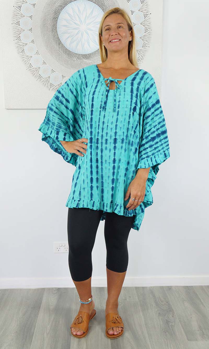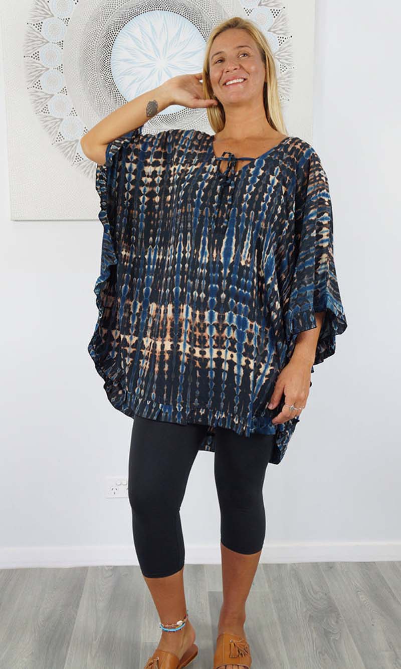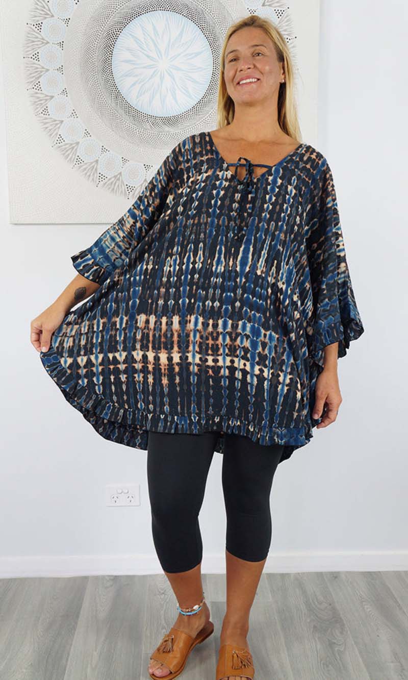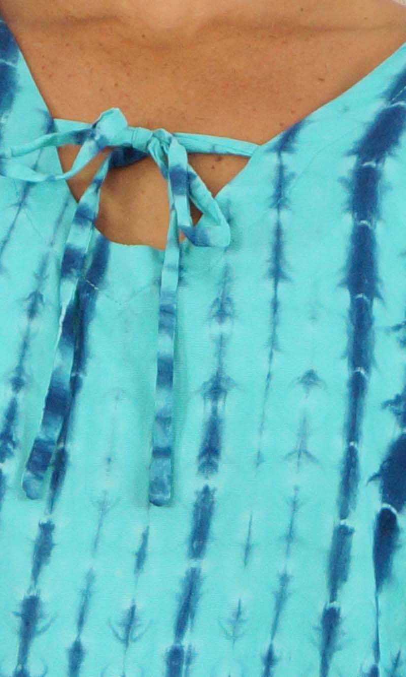 Wear it as a top, a dress, or a tunic over bathers, this product is a complete outfit. A cute tie on the neck line compliments the free flowing figure, while batwing style sleeves give your arms space to move freely.