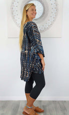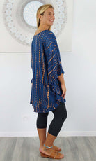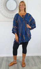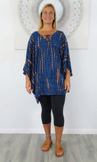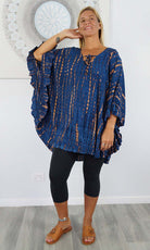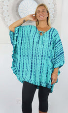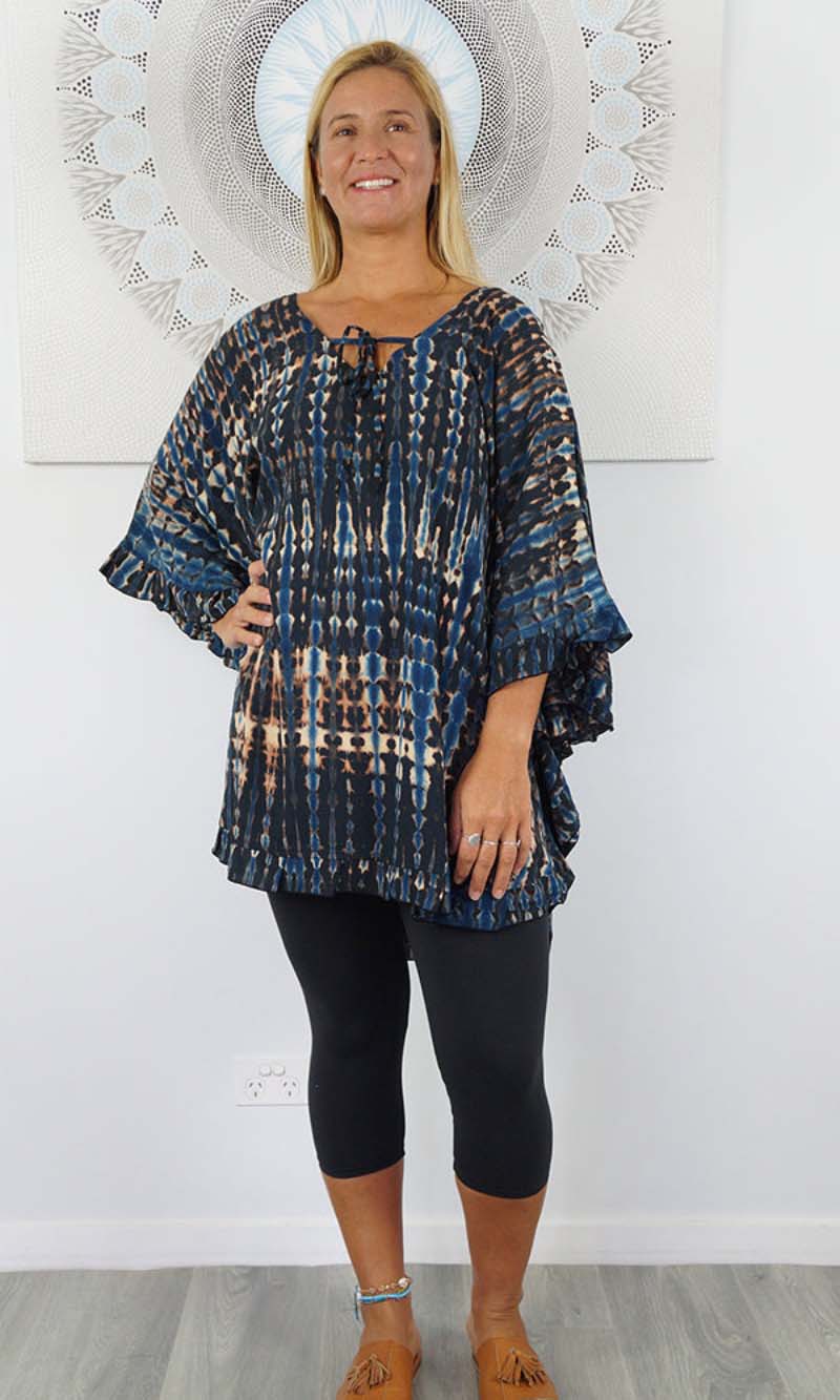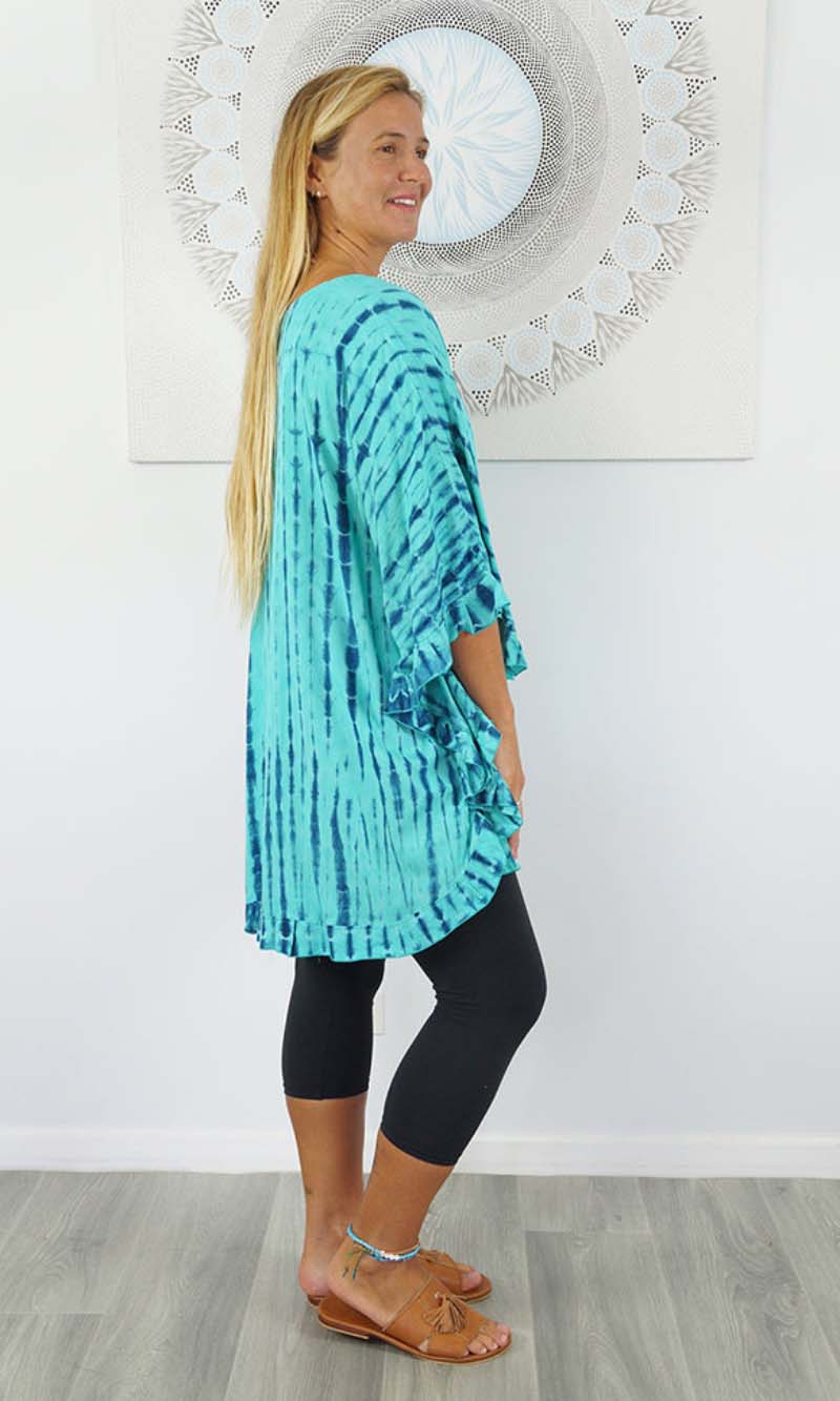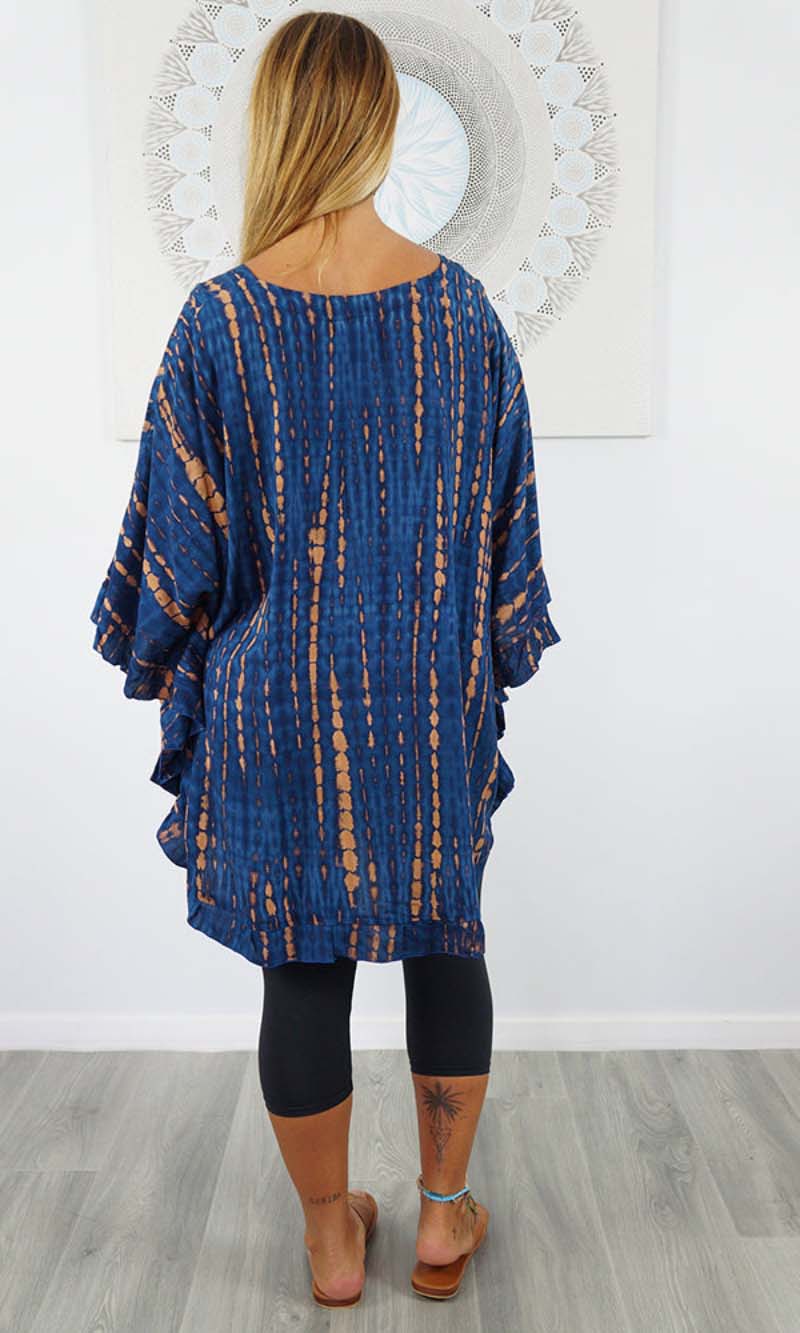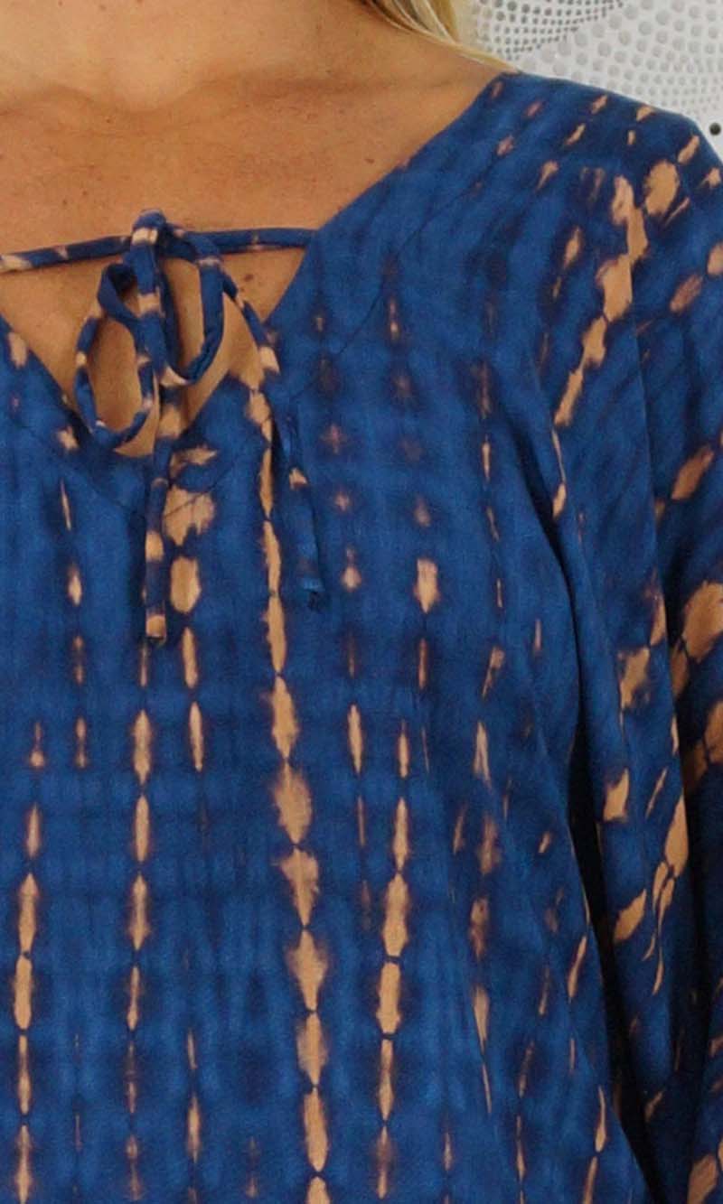 Wear it as a top, a dress, or a tunic over bathers, this product is a complete outfit. A cute tie on the neck line compliments the free flowing figure, while batwing style sleeves give your arms space to move freely.