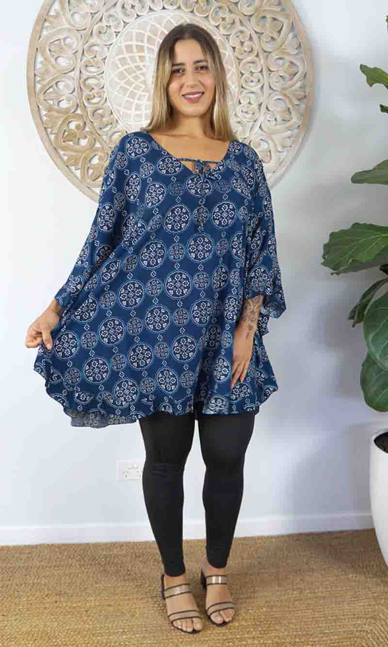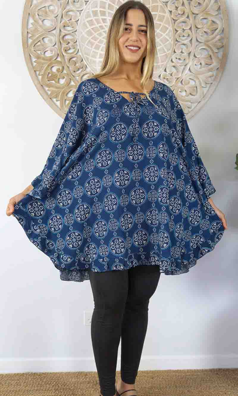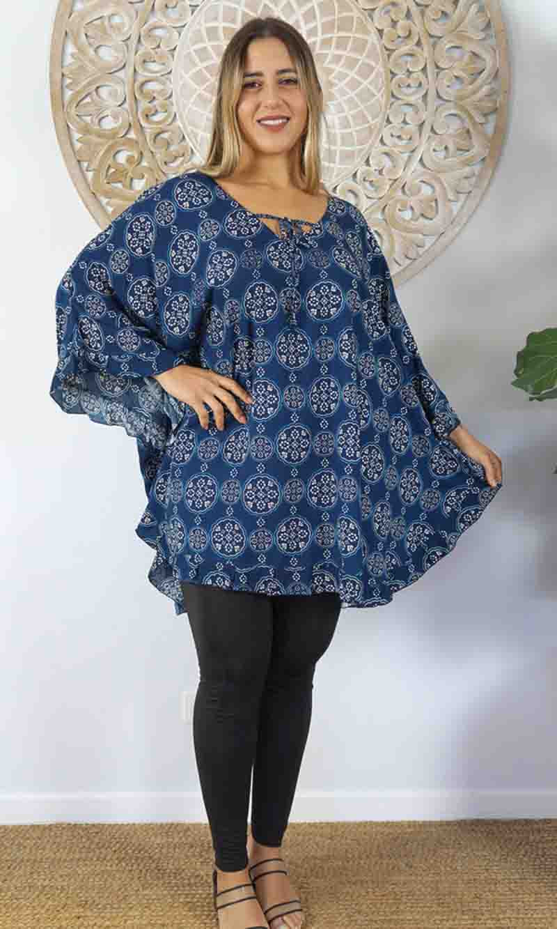 Wear it as a top, a dress, or a tunic over bathers, this product is a complete outfit. A cute tie on the neck line compliments the free flowing figure, while batwing style sleeves give your arms space to move freely.