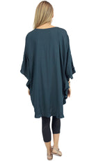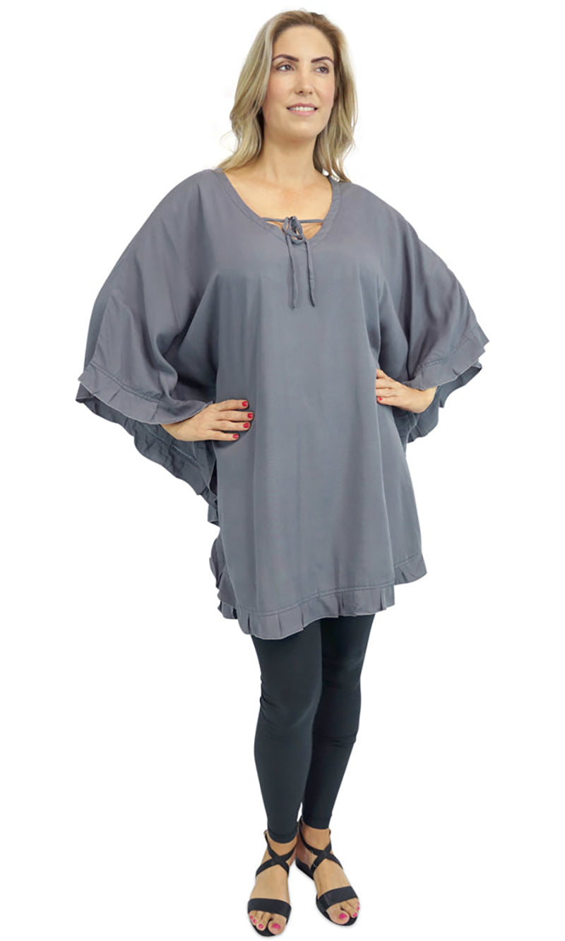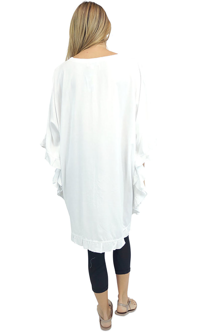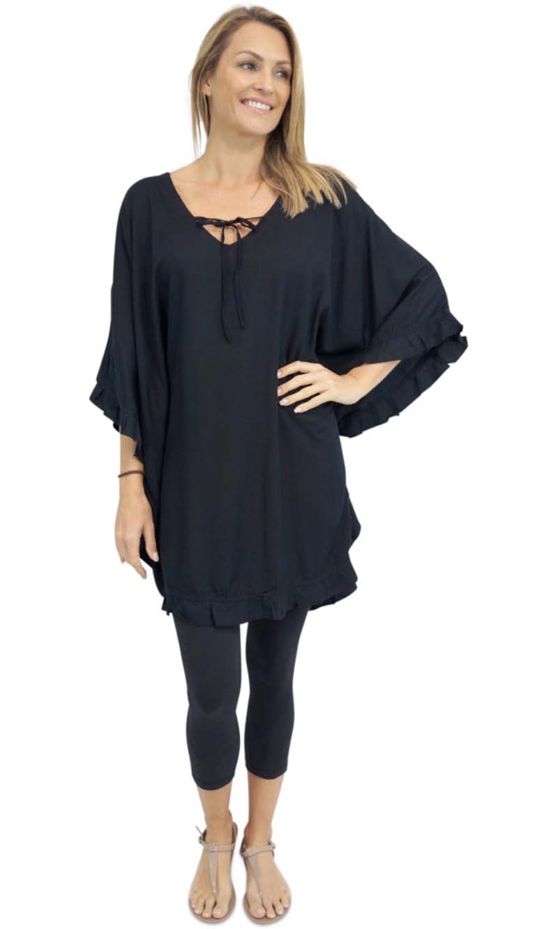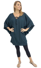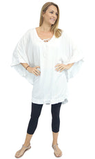 Wear it as a top, a dress, or a tunic over bathers, this product is a complete outfit. A cute tie on the neck line compliments the free flowing figure, while batwing style sleeves give your arms space to move freely.