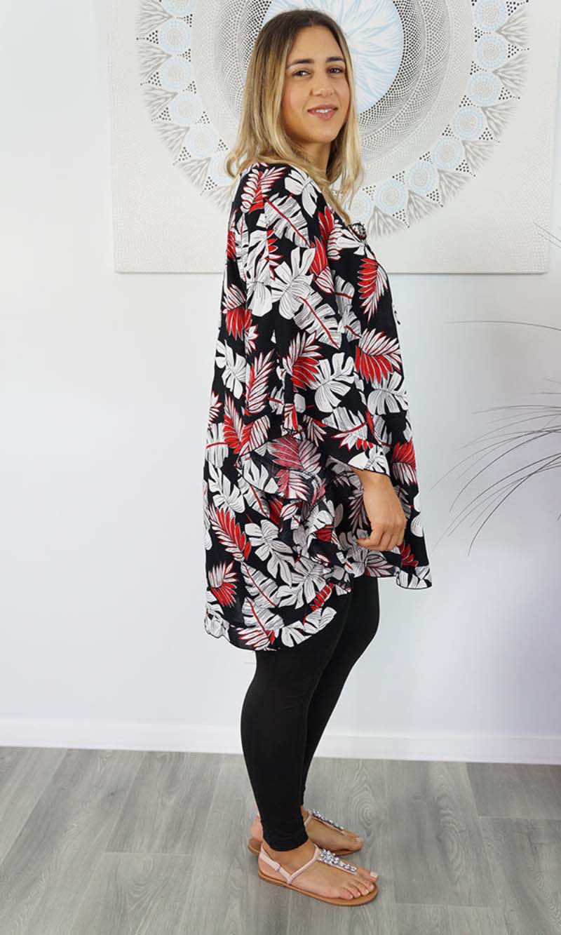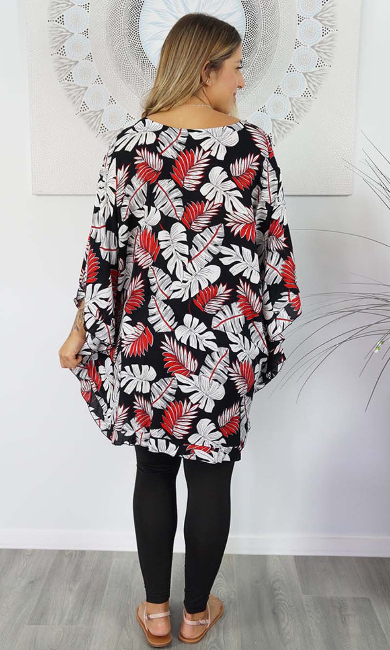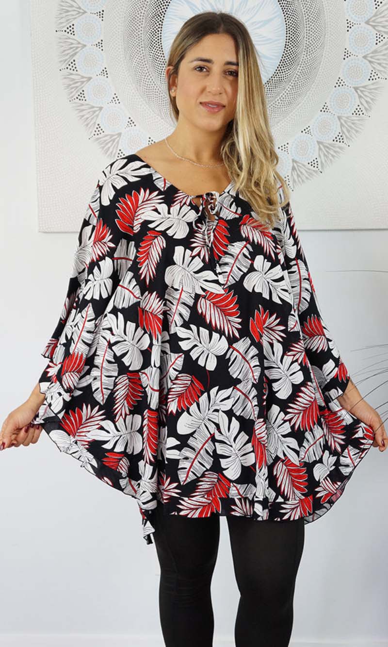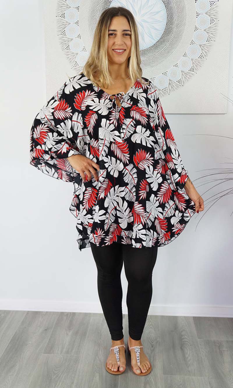 Wear it as a top, a dress, or a tunic over bathers, this product is a complete outfit. A cute tie on the neck line compliments the free flowing figure, while batwing style sleeves give your arms space to move freely.