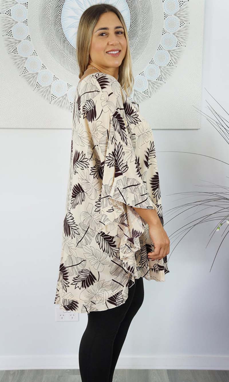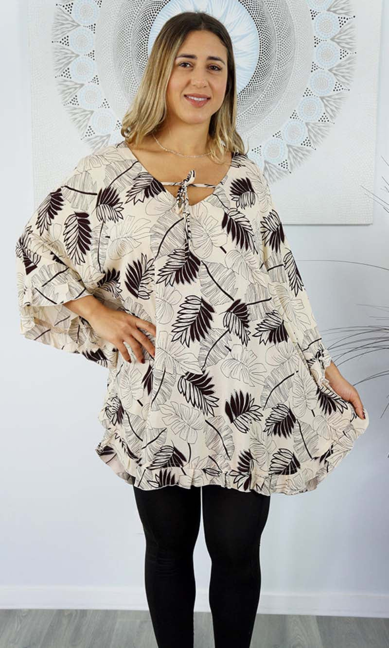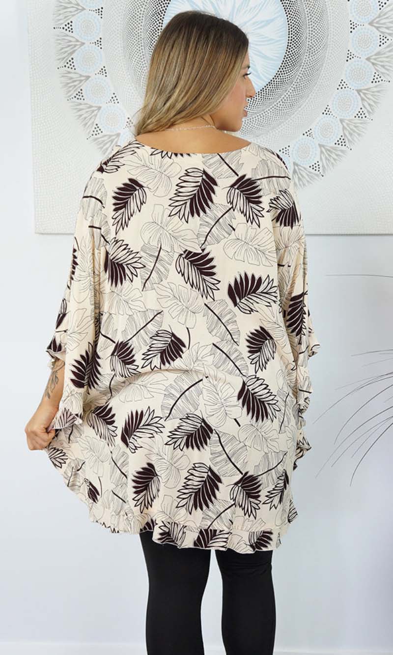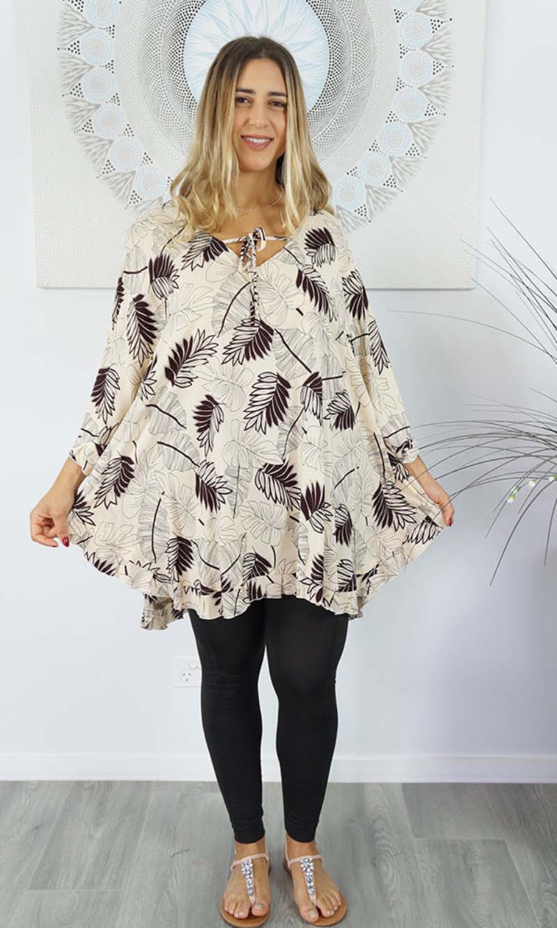 Wear it as a top, a dress, or a tunic over bathers, this product is a complete outfit. A cute tie on the neck line compliments the free flowing figure, while batwing style sleeves give your arms space to move freely.