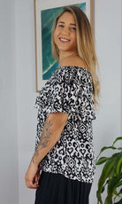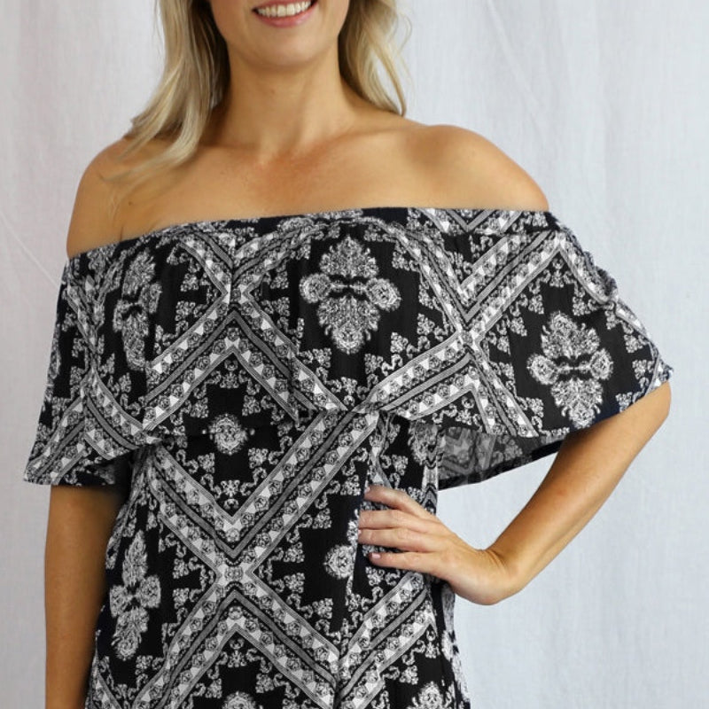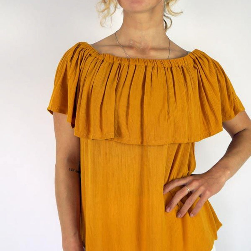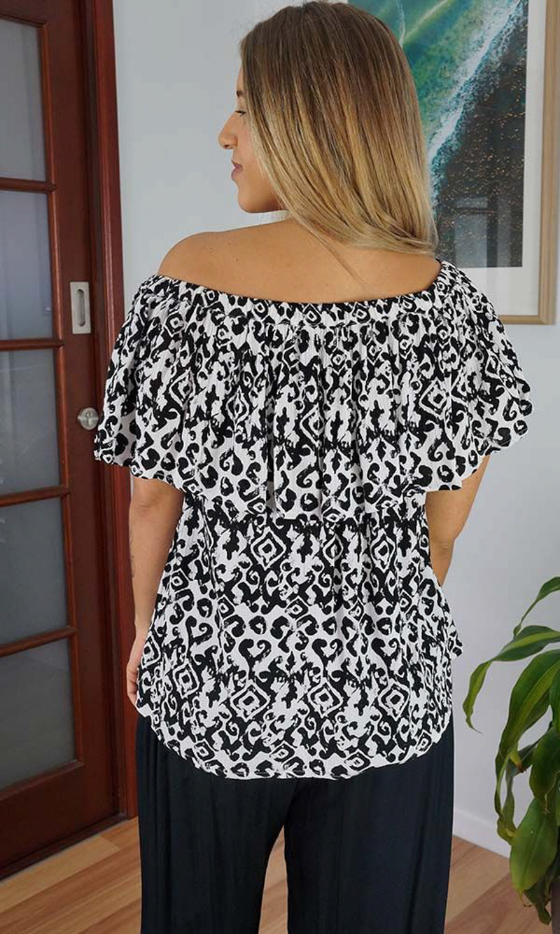 An off the shoulder flowy top with frill detail, made in a cool pre shrunk crinkle rayon. One size to fit 8-16