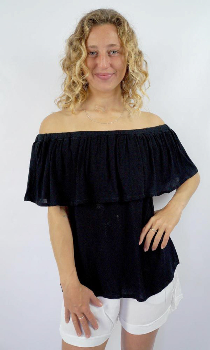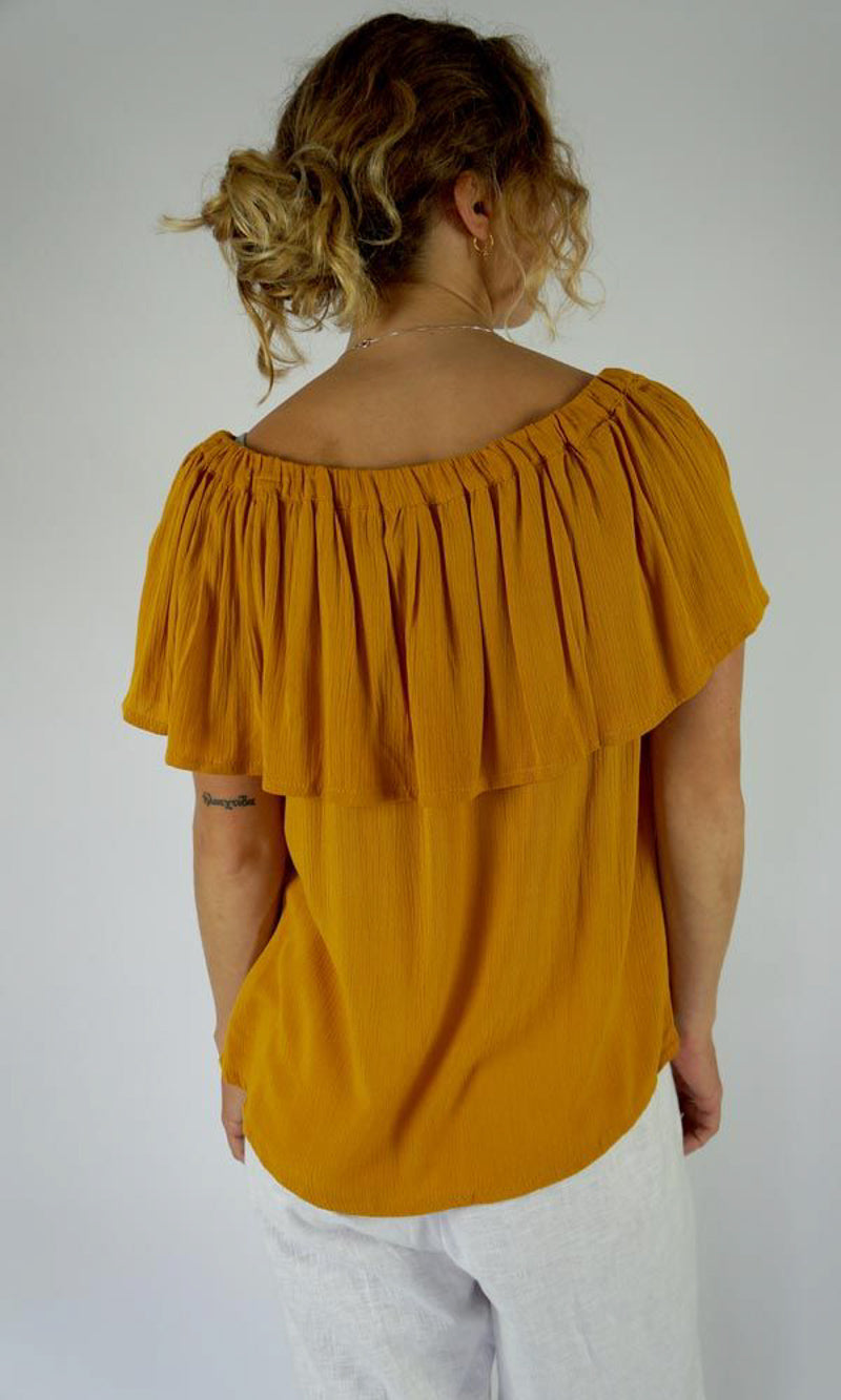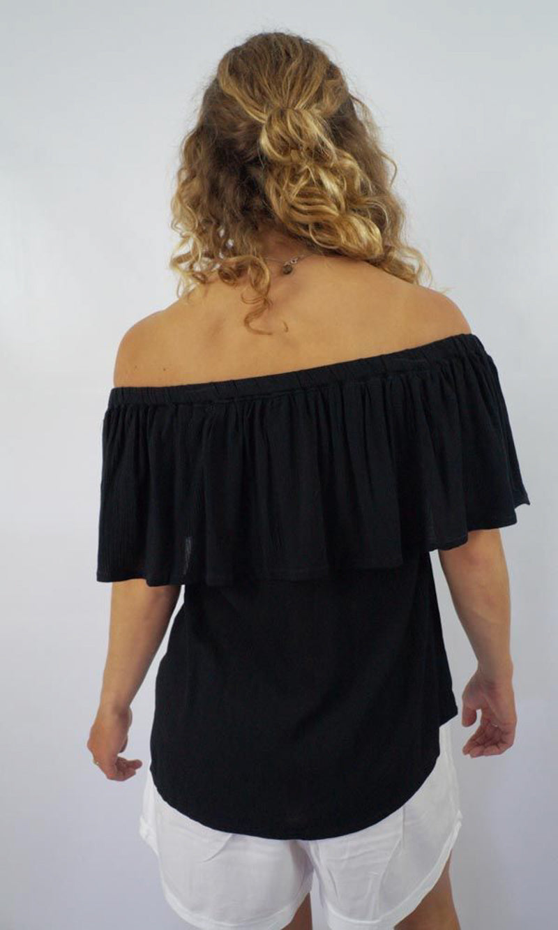 An off the shoulder flowy top with frill detail, made in a cool pre shrunk crinkle rayon. One size to fit 8-16