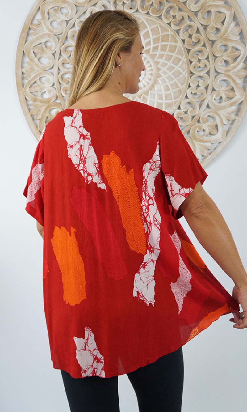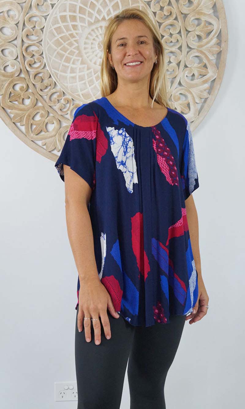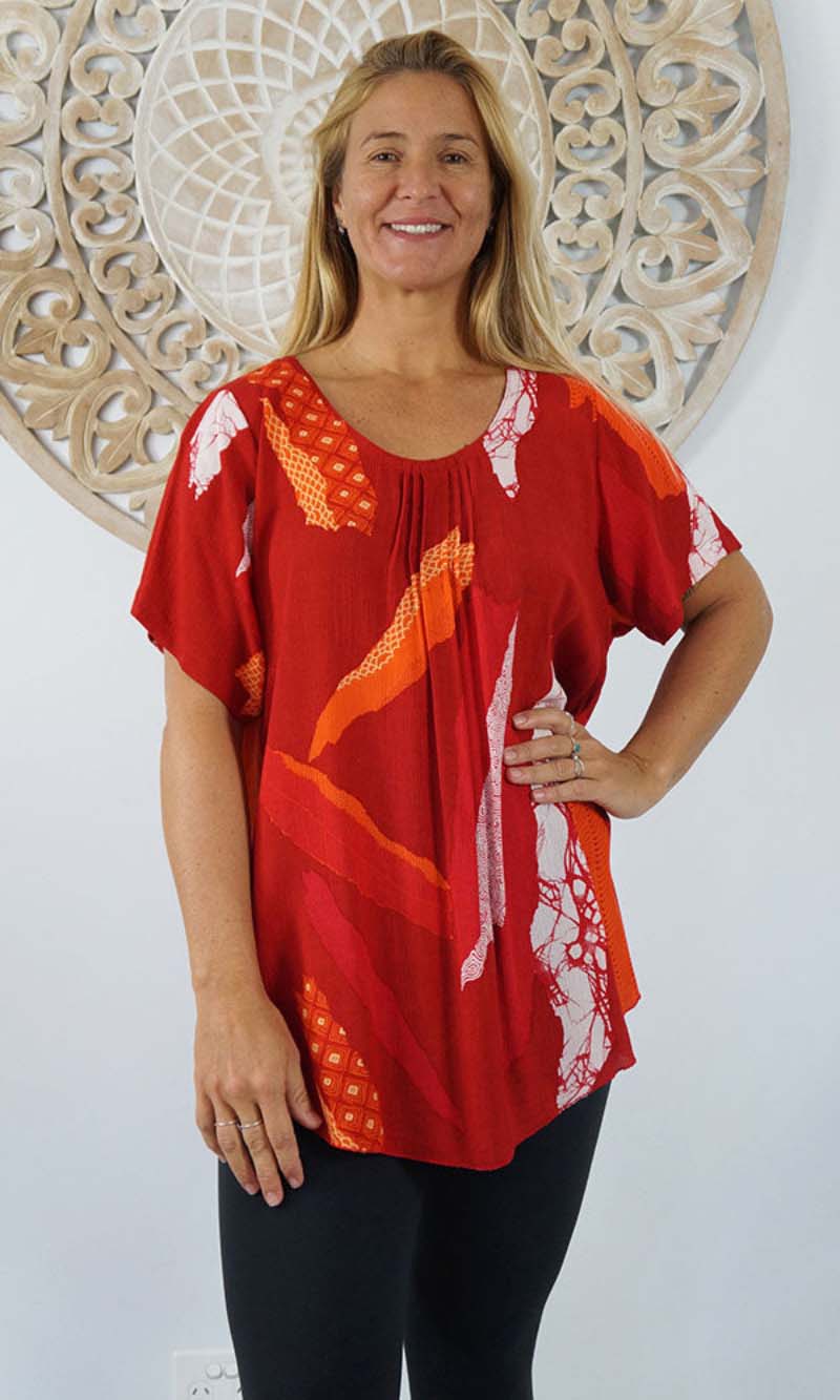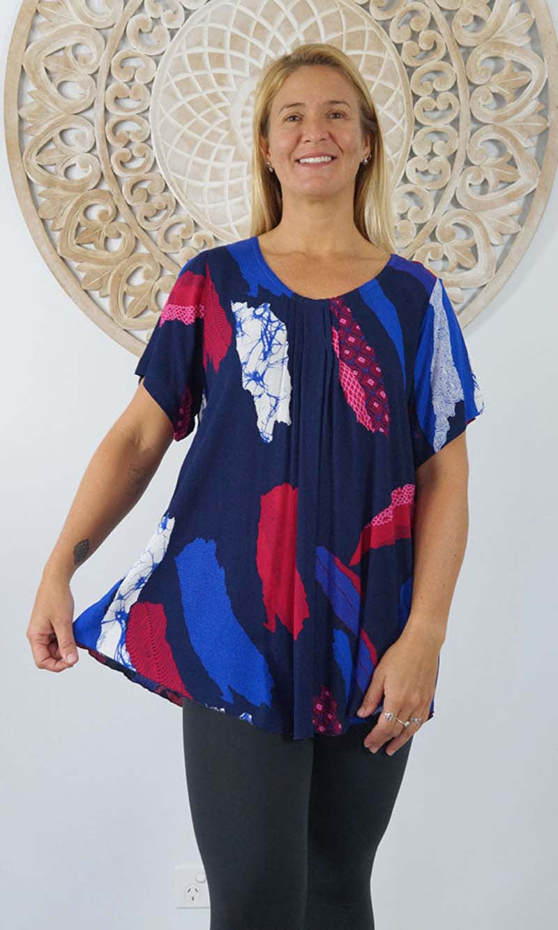 A flowy top with sleeves made from a cool crinkle rayon for those hot summer days. Sizes available 10-16, 18-22