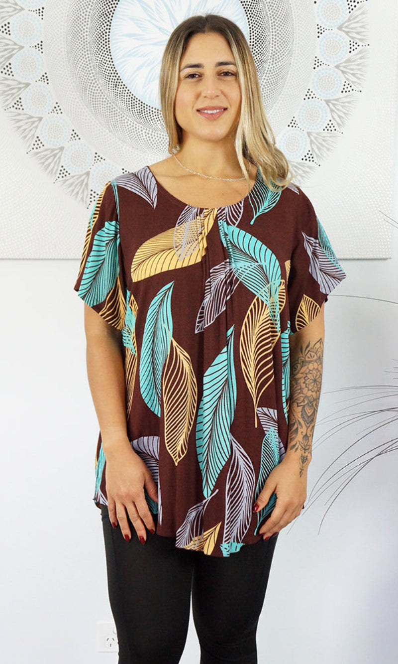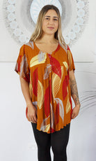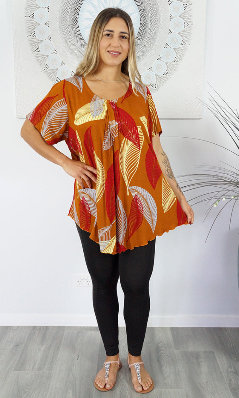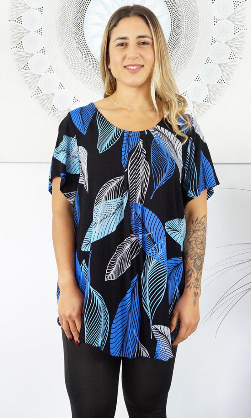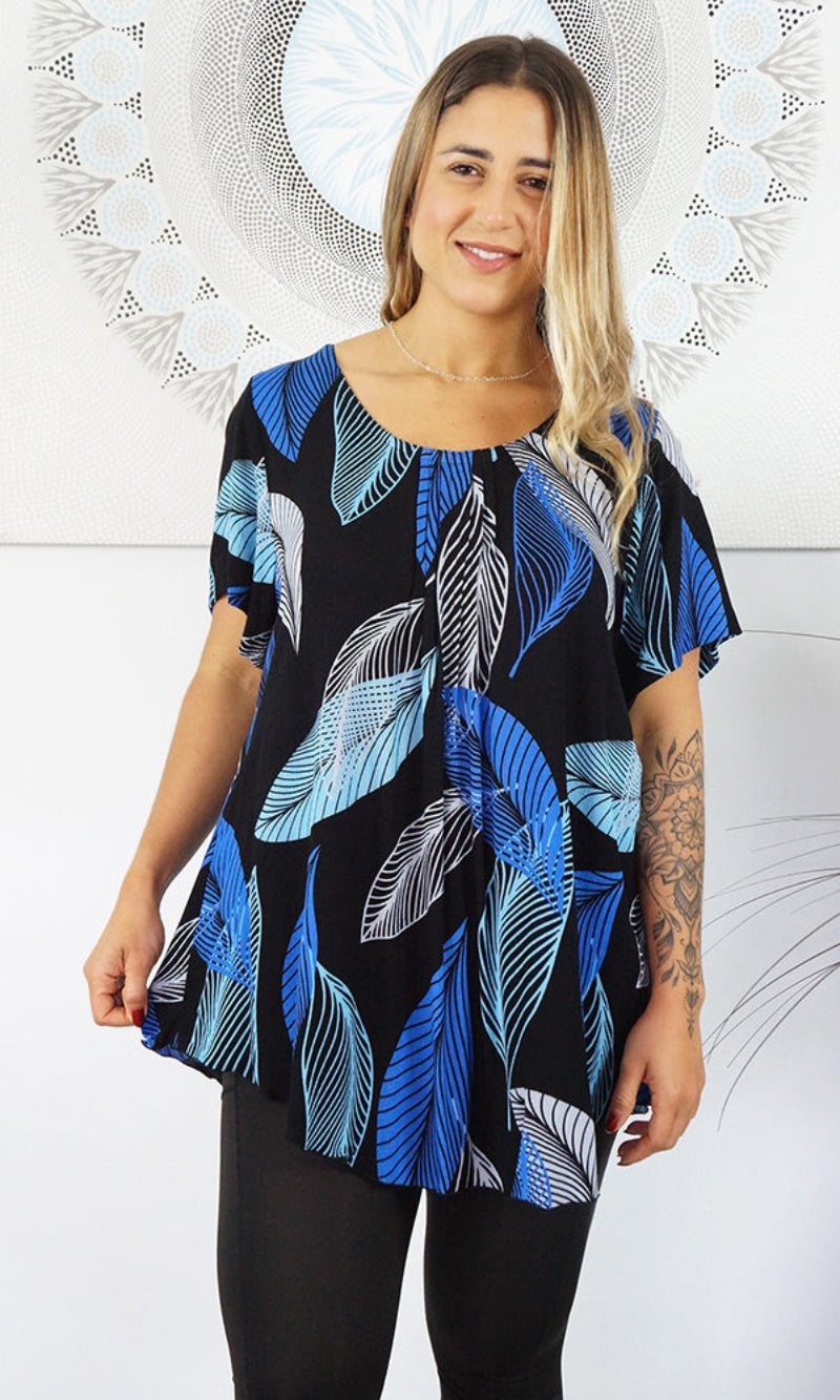 A flowy top with sleeves made from a cool crinkle rayon for those hot summer days. Sizes available 10-16, 18-22