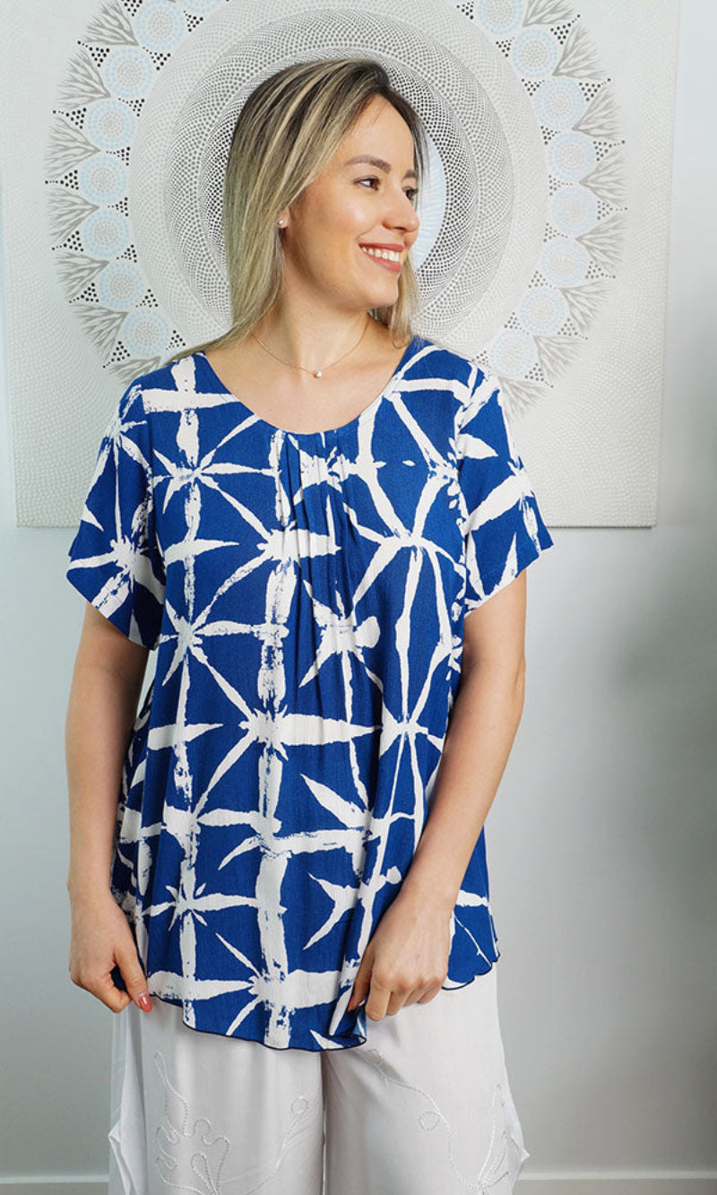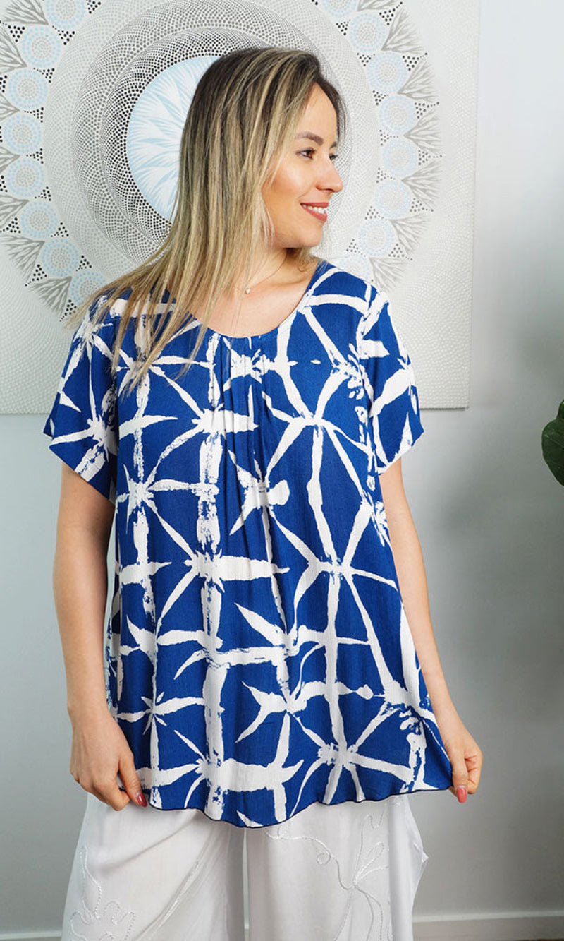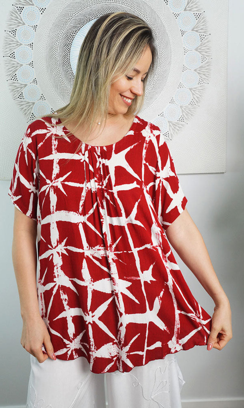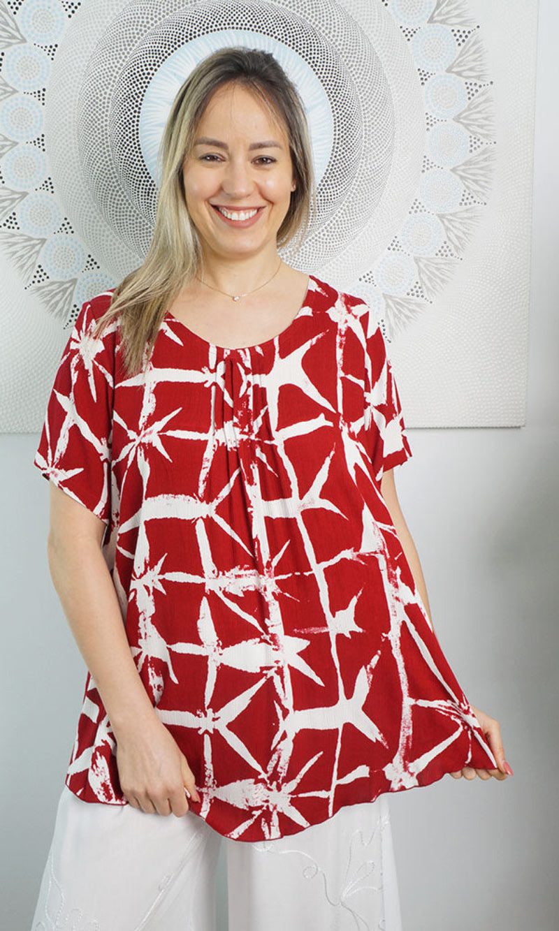 A flowy top with sleeves made from a cool crinkle rayon for those hot summer days. Sizes available 10-16, 18-22