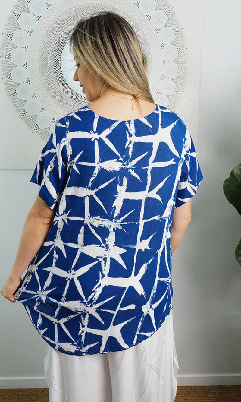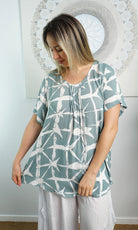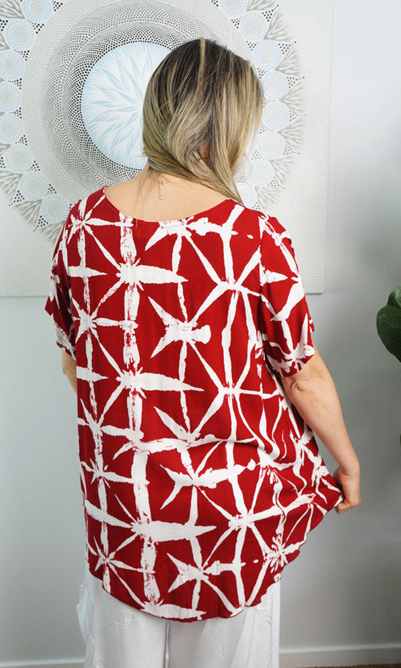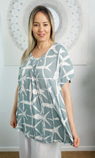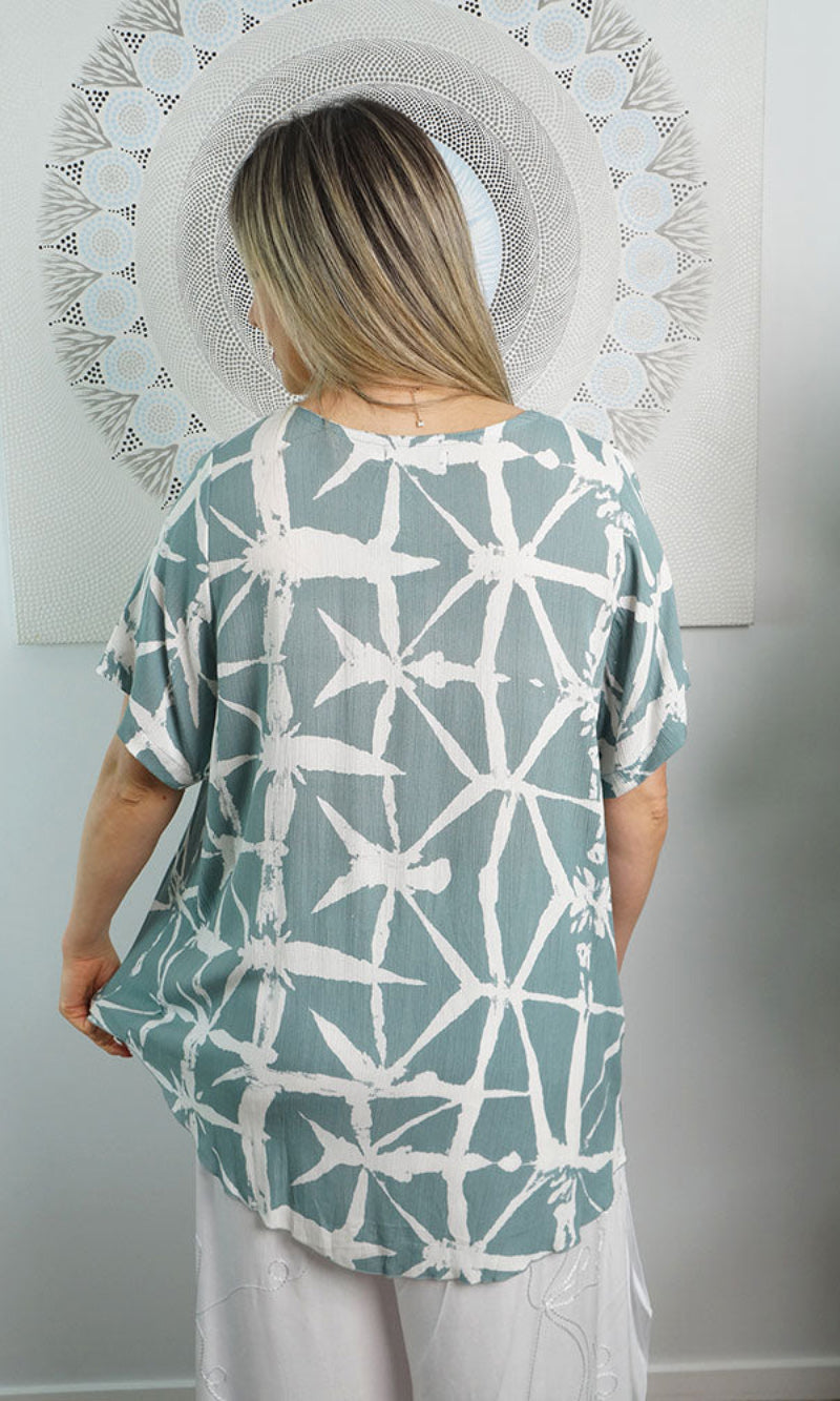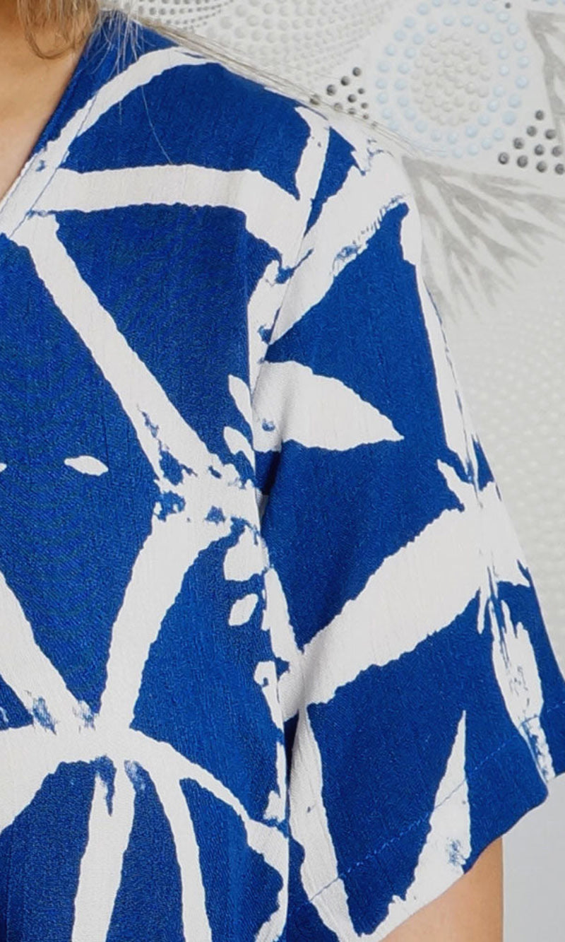 A flowy top with sleeves made from a cool crinkle rayon for those hot summer days. Sizes available 10-16, 18-22