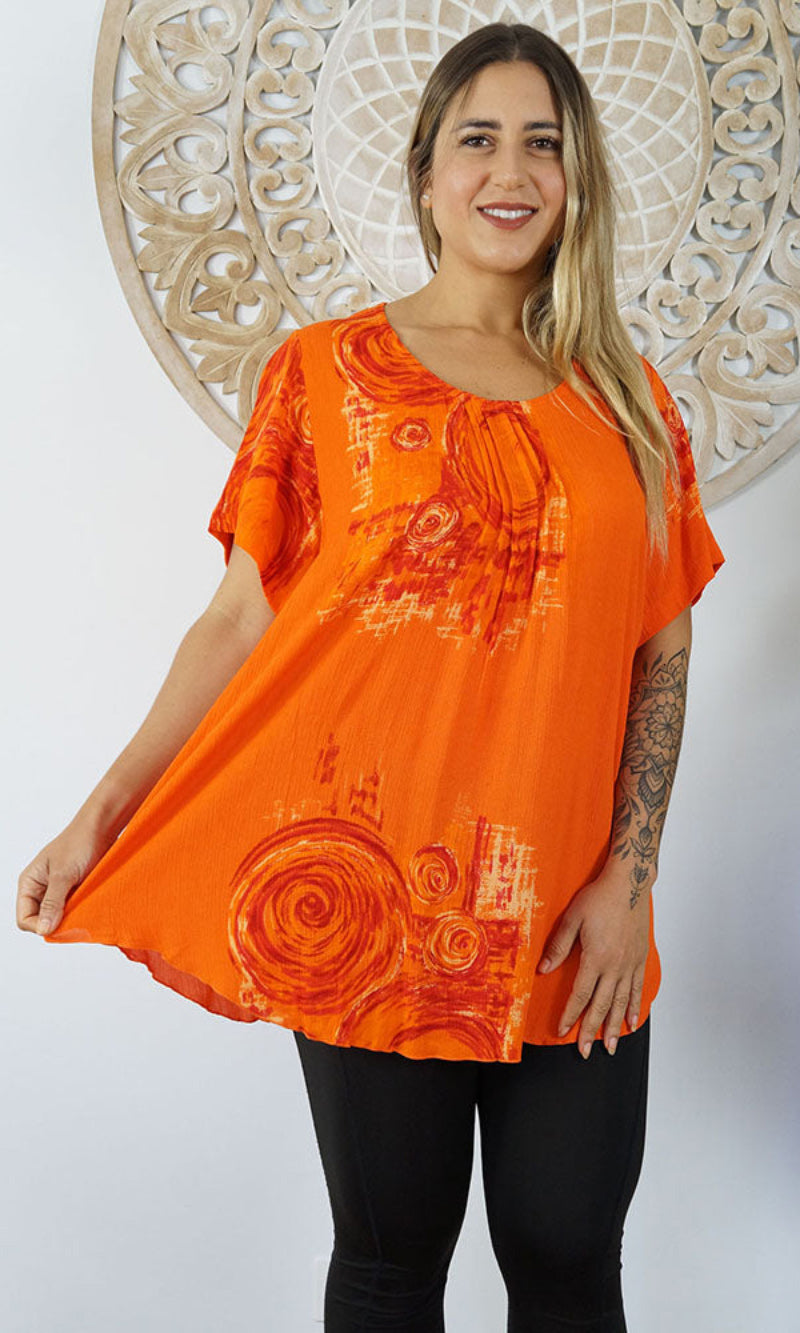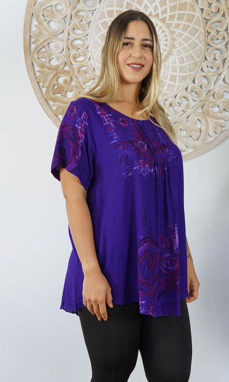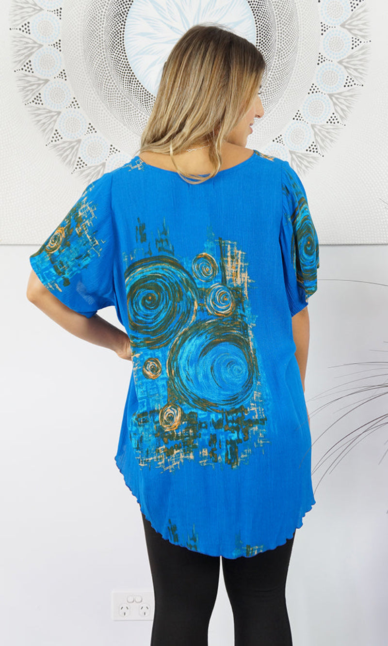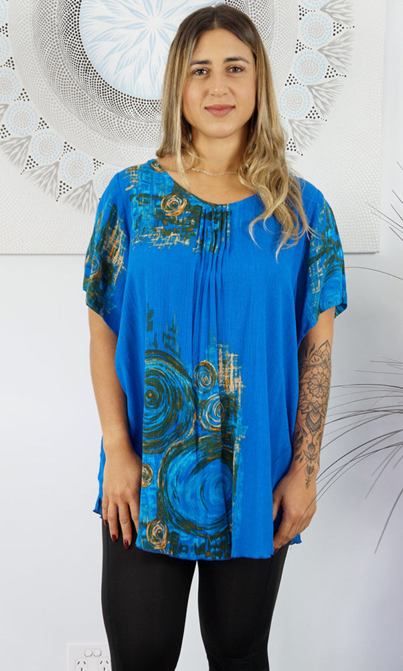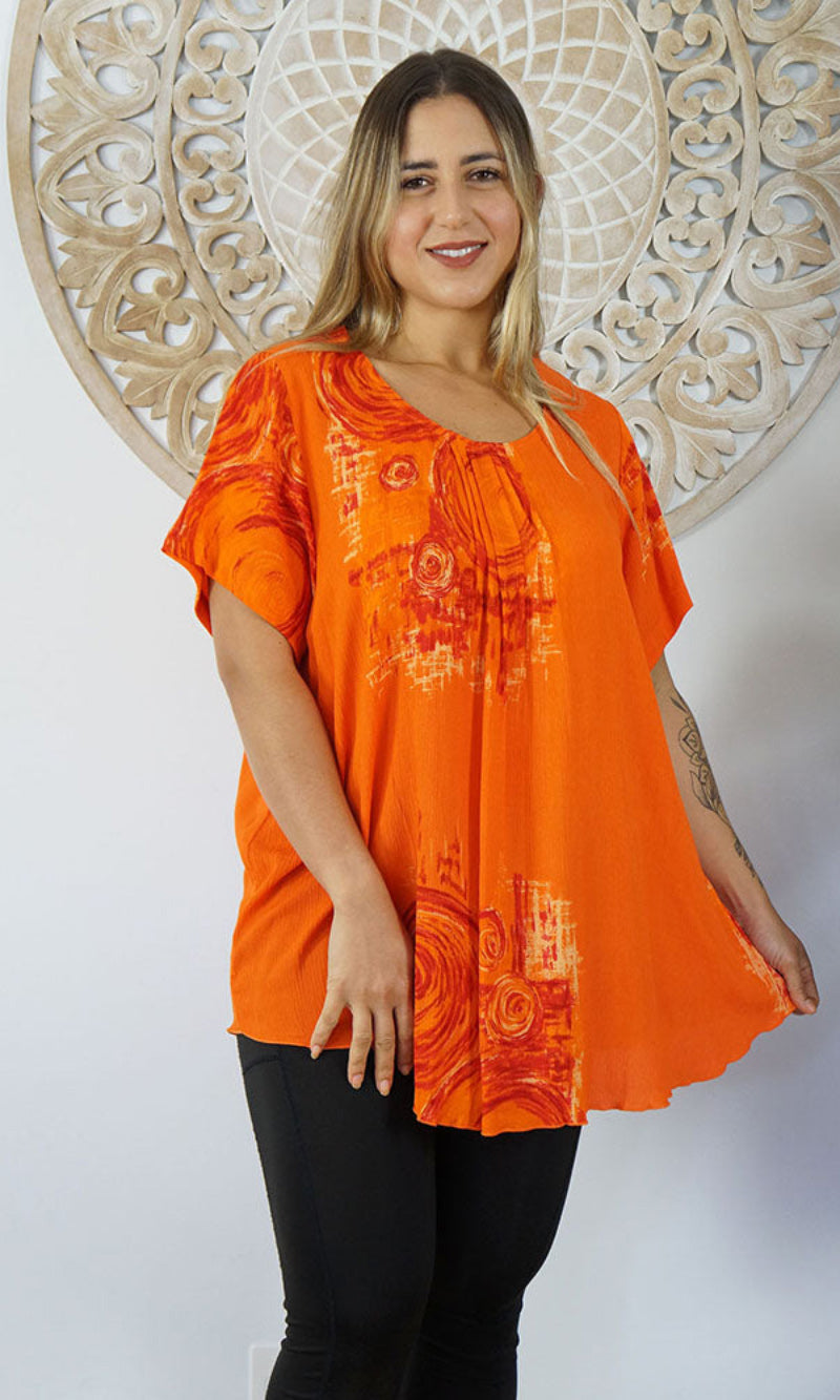 A flowy top with sleeves made from a cool crinkle rayon for those hot summer days. Sizes available 10-16, 18-22