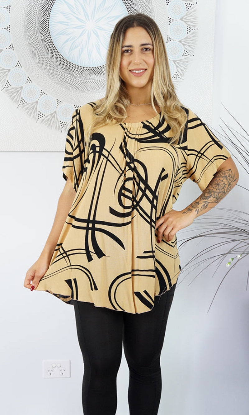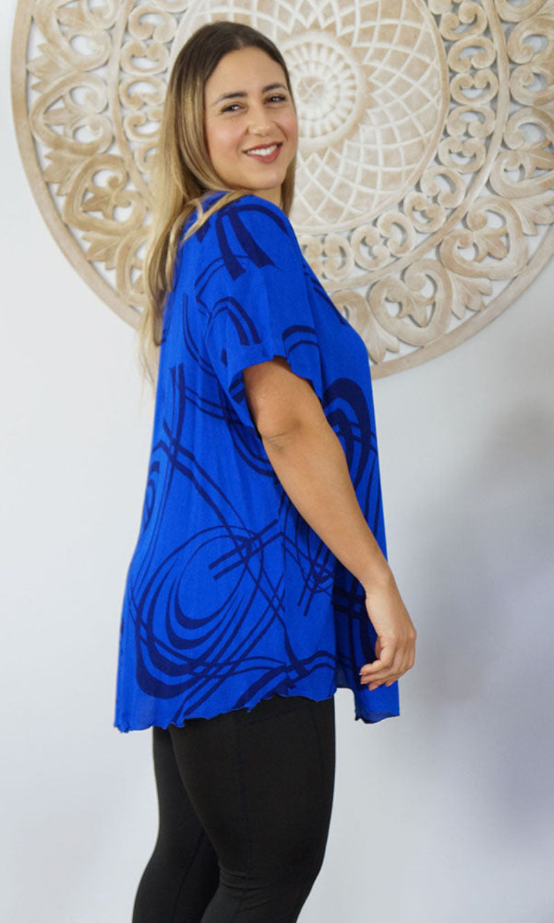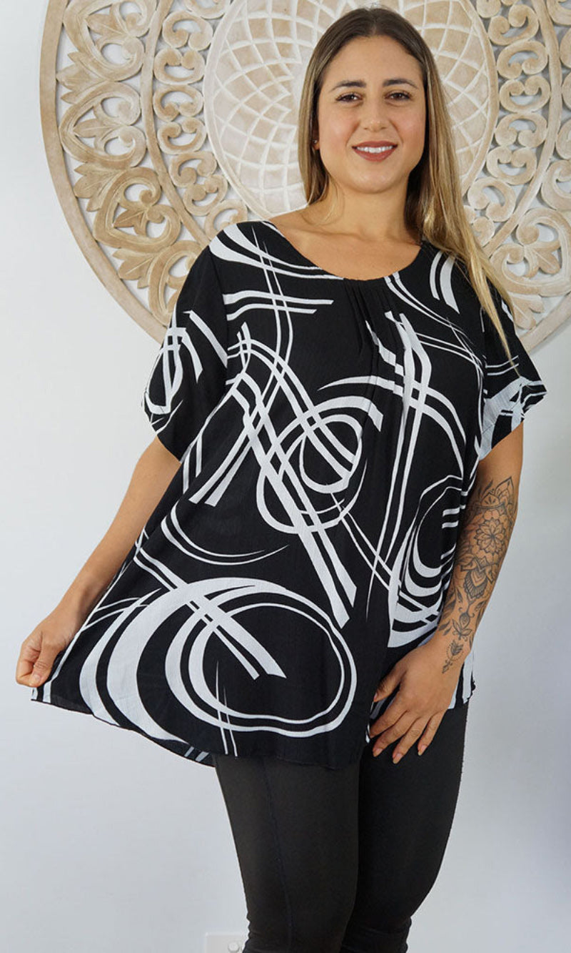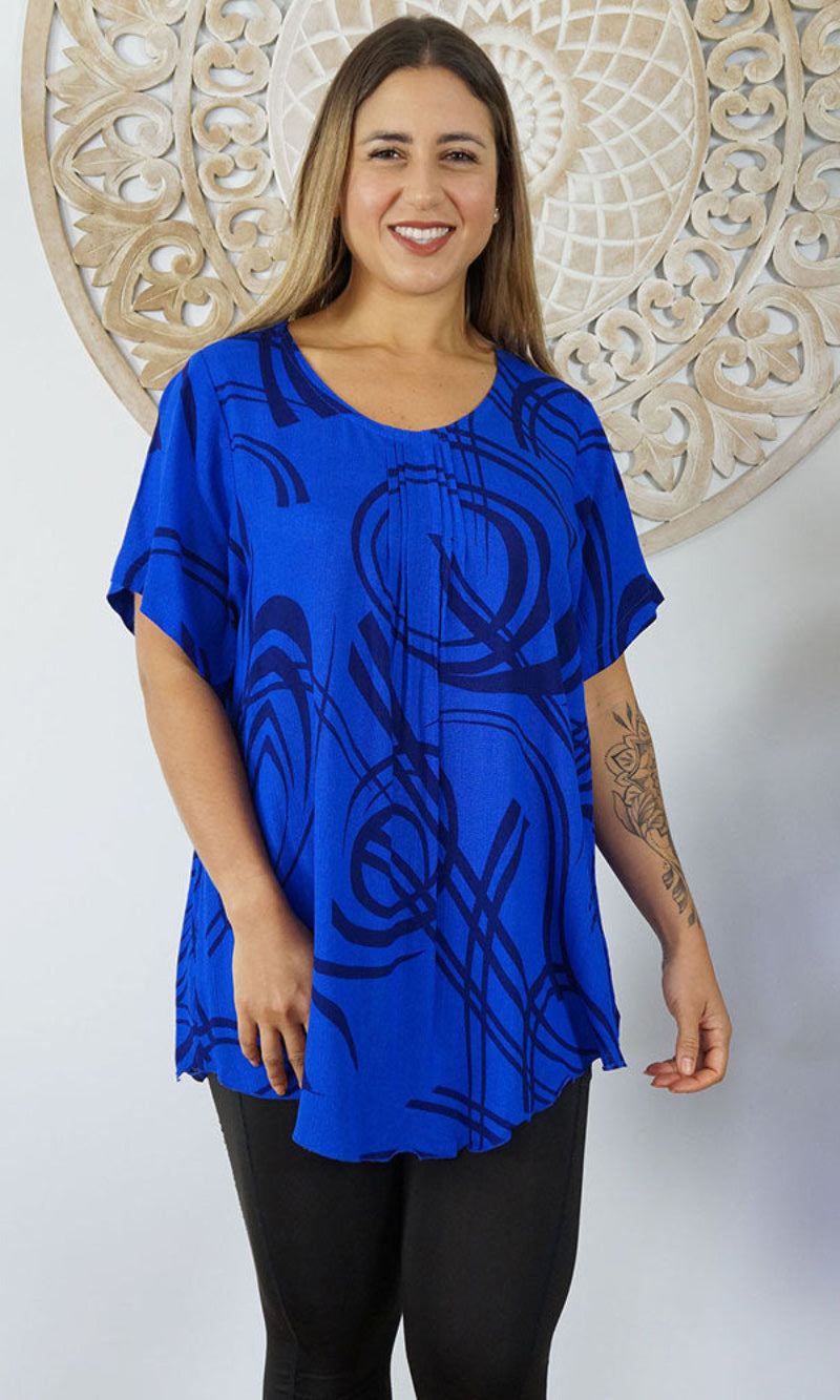 A flowy top with sleeves made from a cool crinkle rayon for those hot summer days. Sizes available 10-16, 18-22
