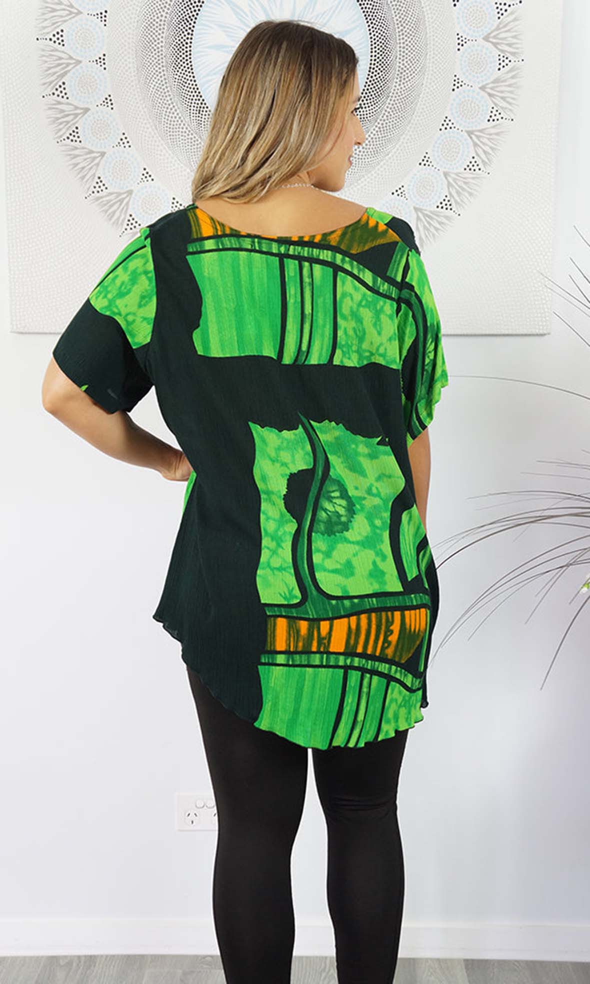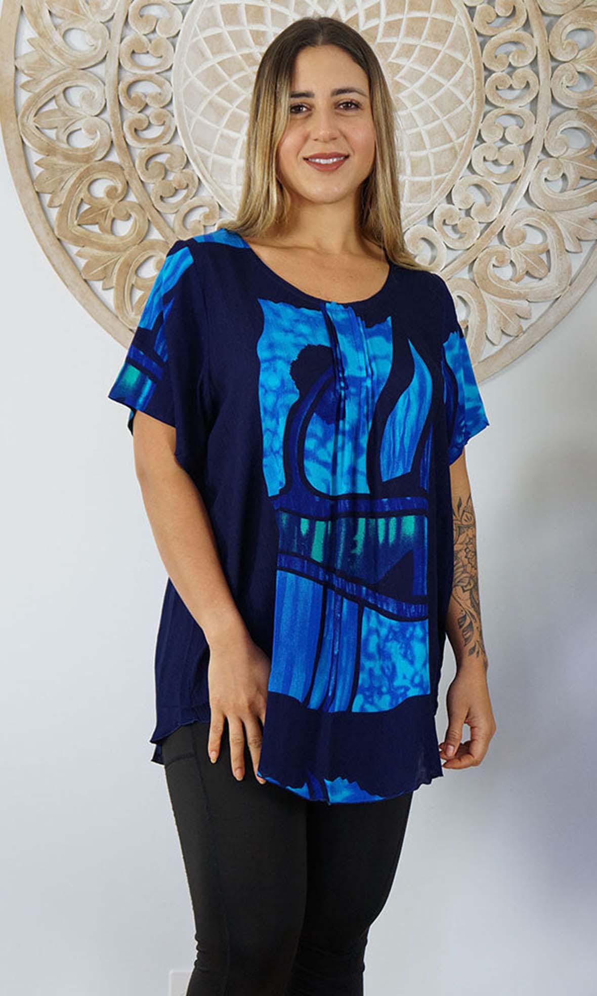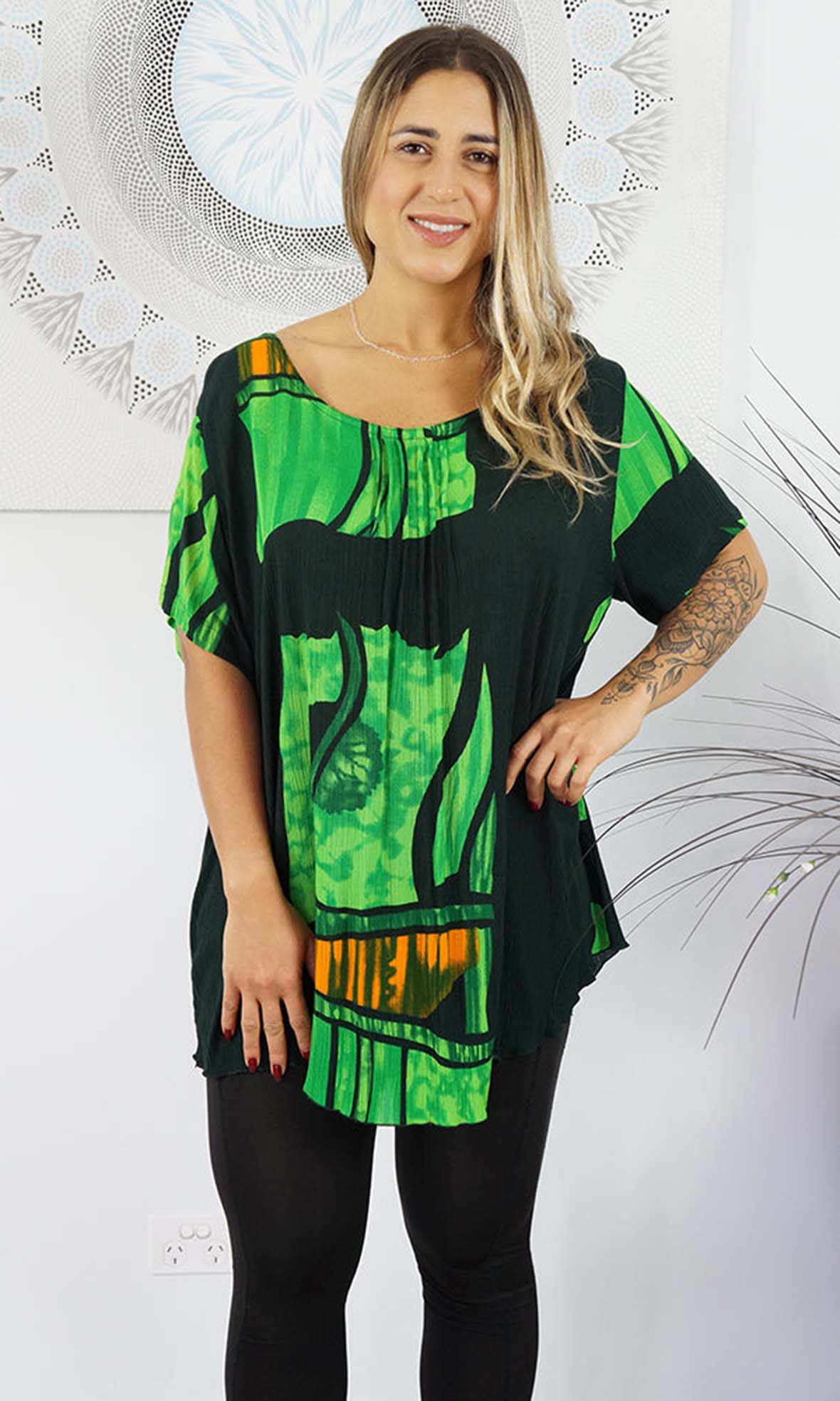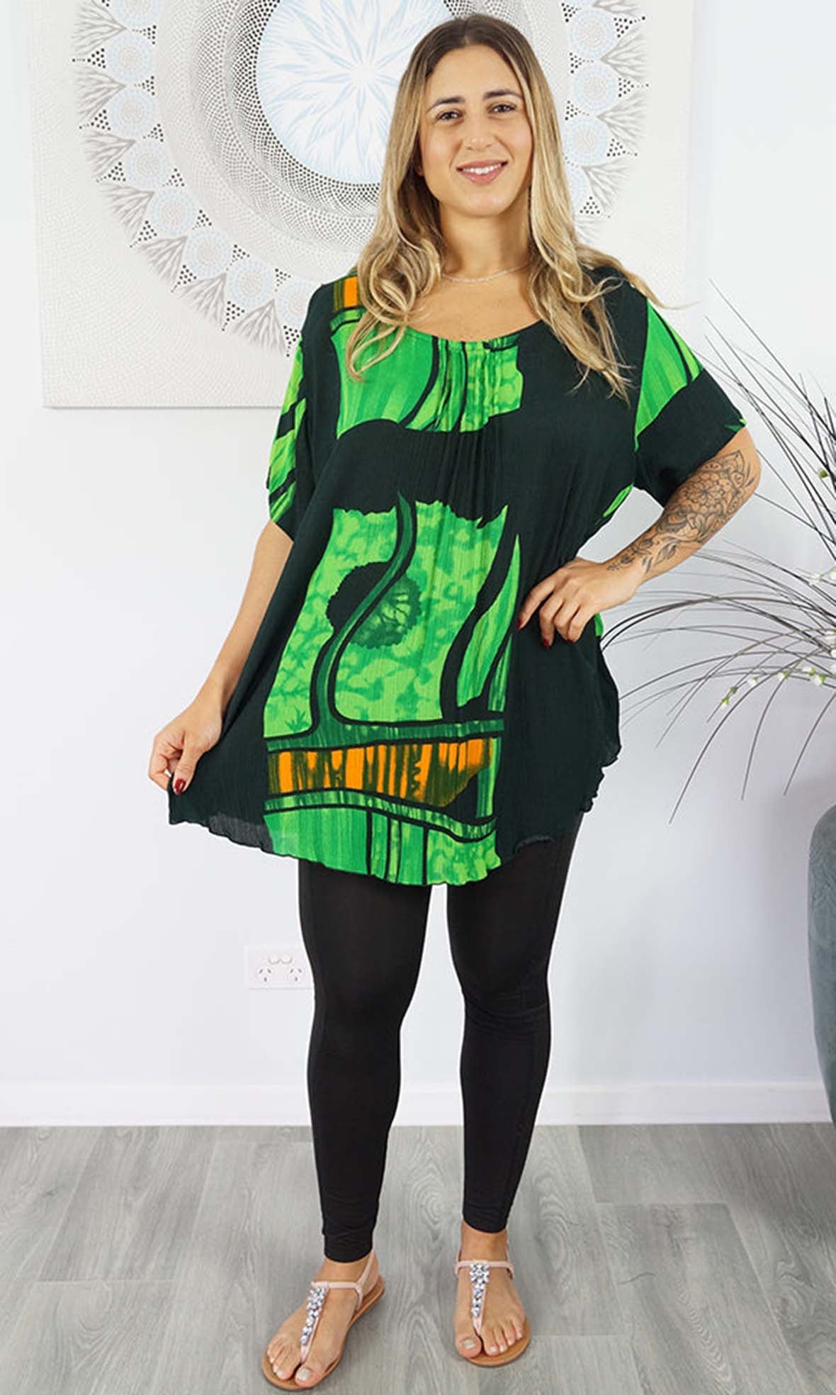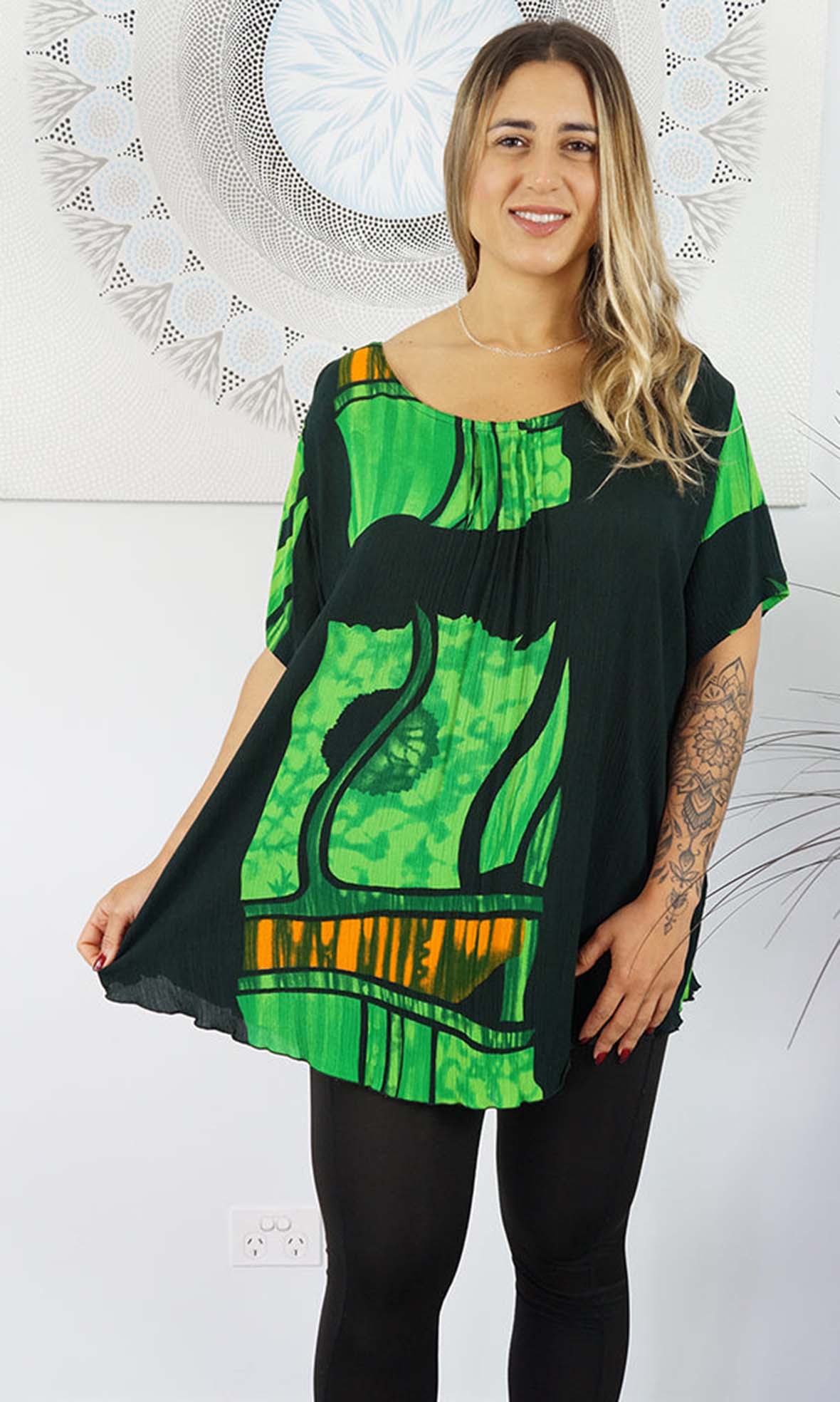 A flowy top with sleeves made from a cool crinkle rayon for those hot summer days. Sizes available 10-16, 18-22