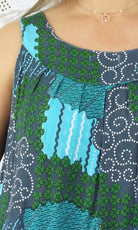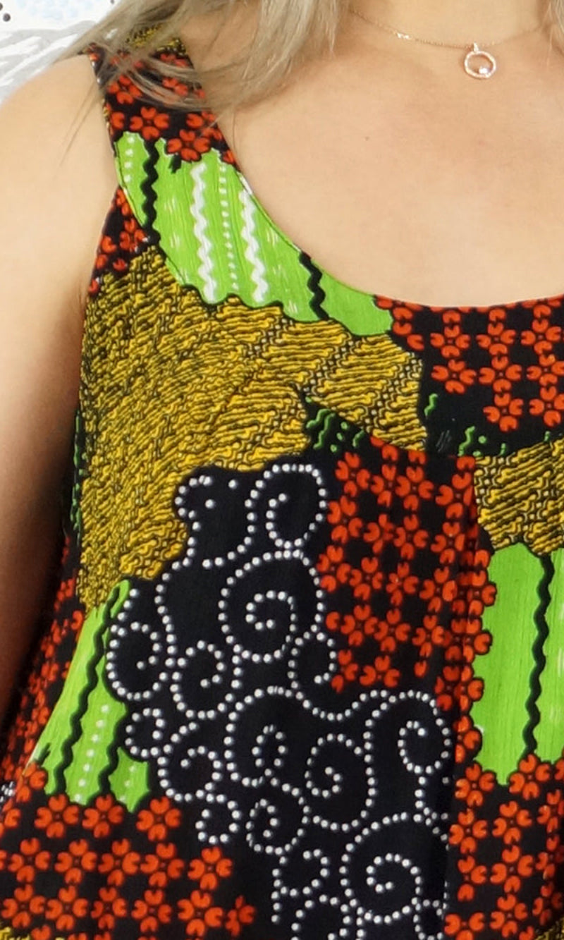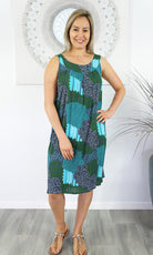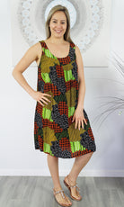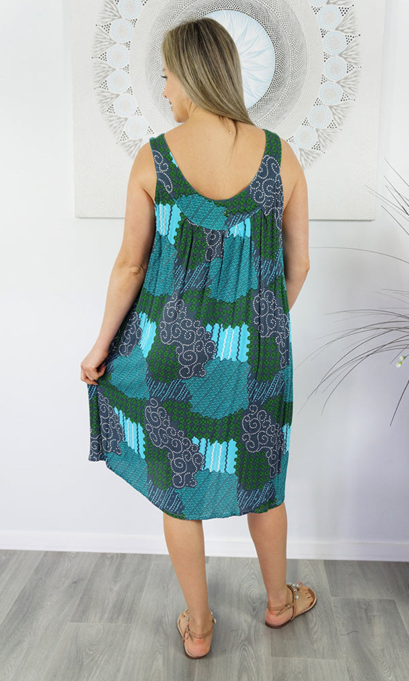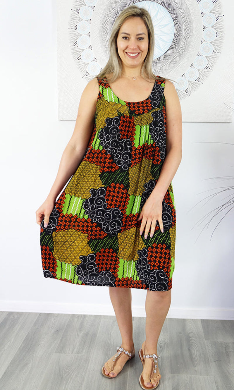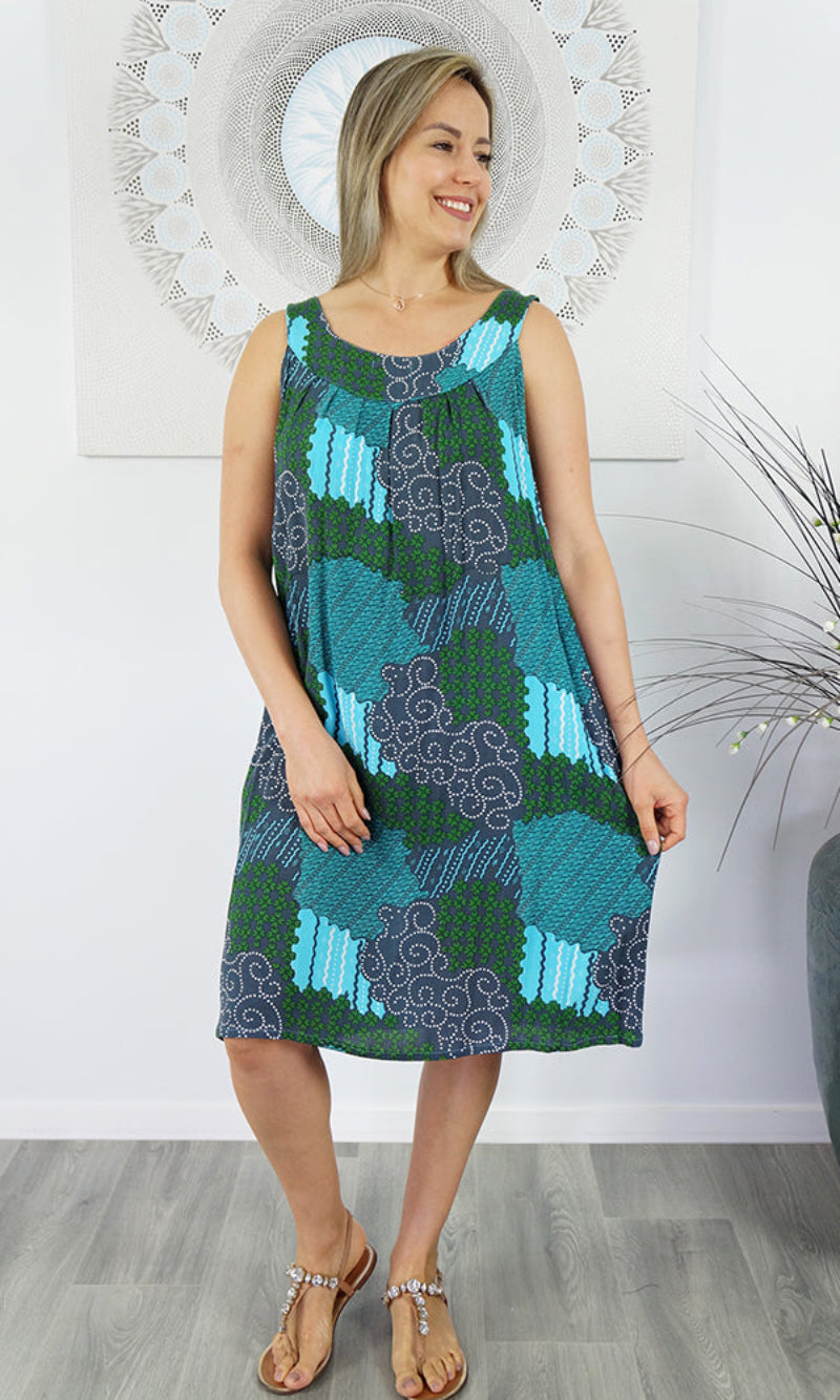 The Mosaic print Tahiti dress makes a great casual dress made from a cool crinkle rayon for those hot summer days. You'll find elastic easements under the arm area for that perfect fit. Sizes S/M (10-12), LXL (14-16), 2XL (18-20).