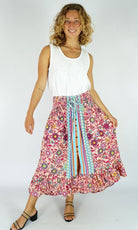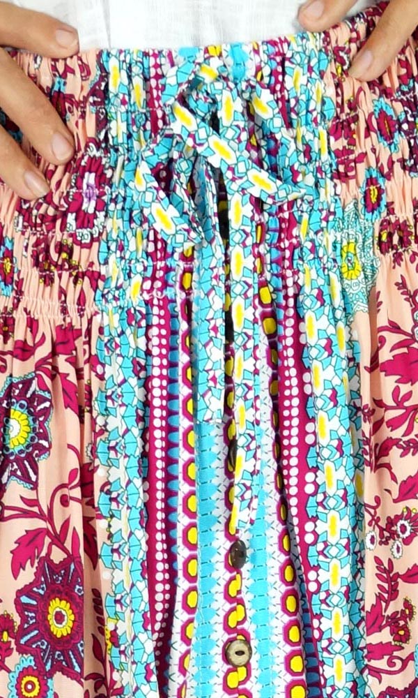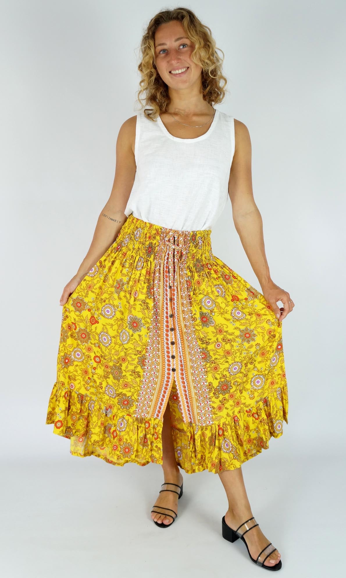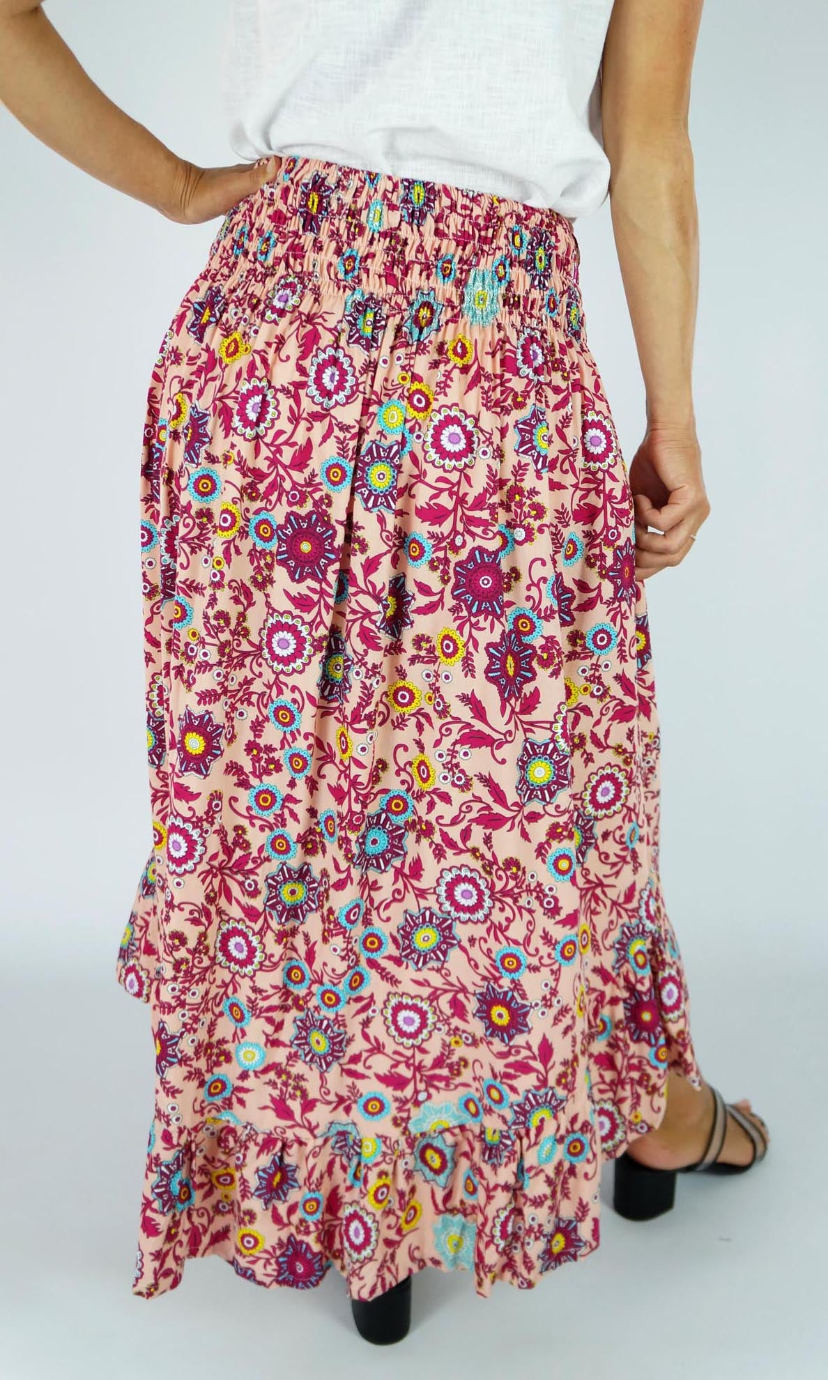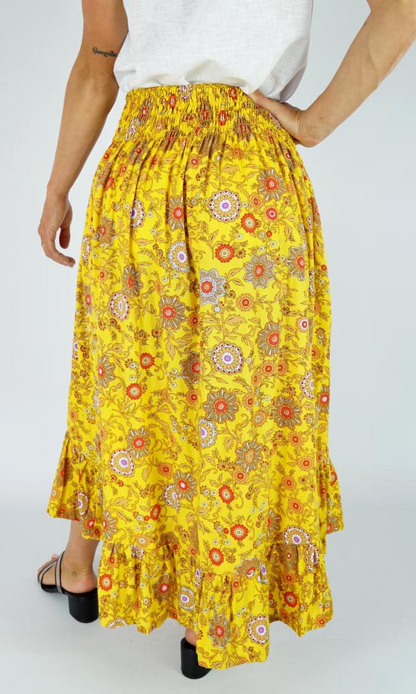 The Tangelo Skirt is fun and flirty. This "hi-low" skirt is the perfect length that can worn at as a casual or dressed up. The elastic smock waist ensures a comfortable fit for a wide range of sizes. Free size fits 8-16.