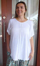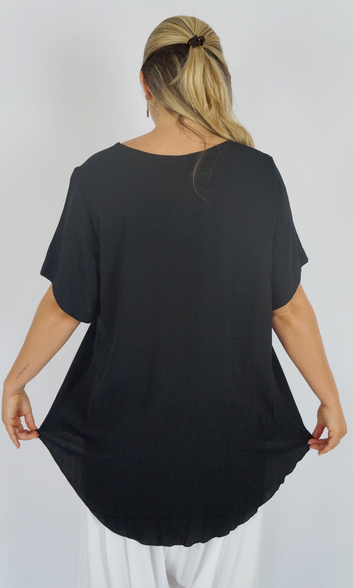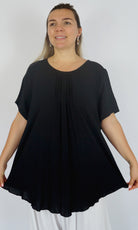 A flowy top with sleeves made from a cool crinkle rayon for those hot summer days. Sizes available 10-16, 18-22