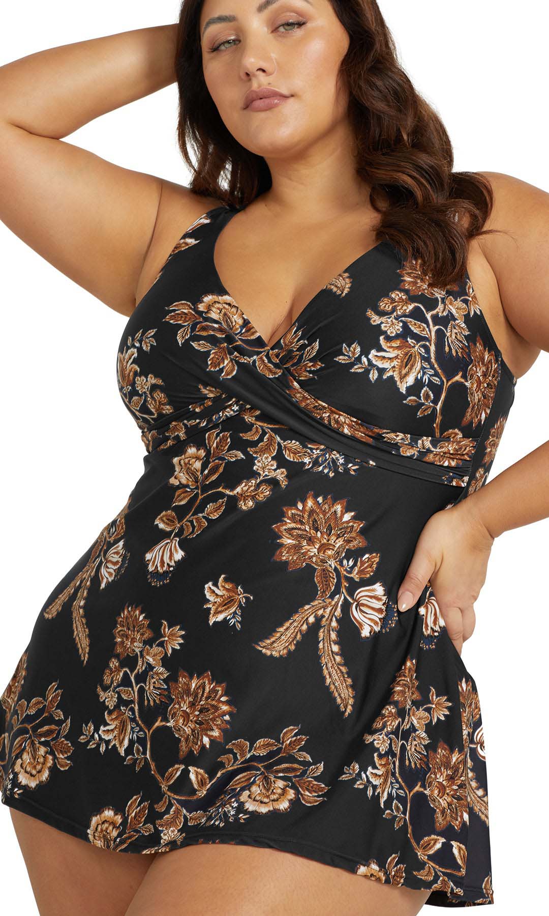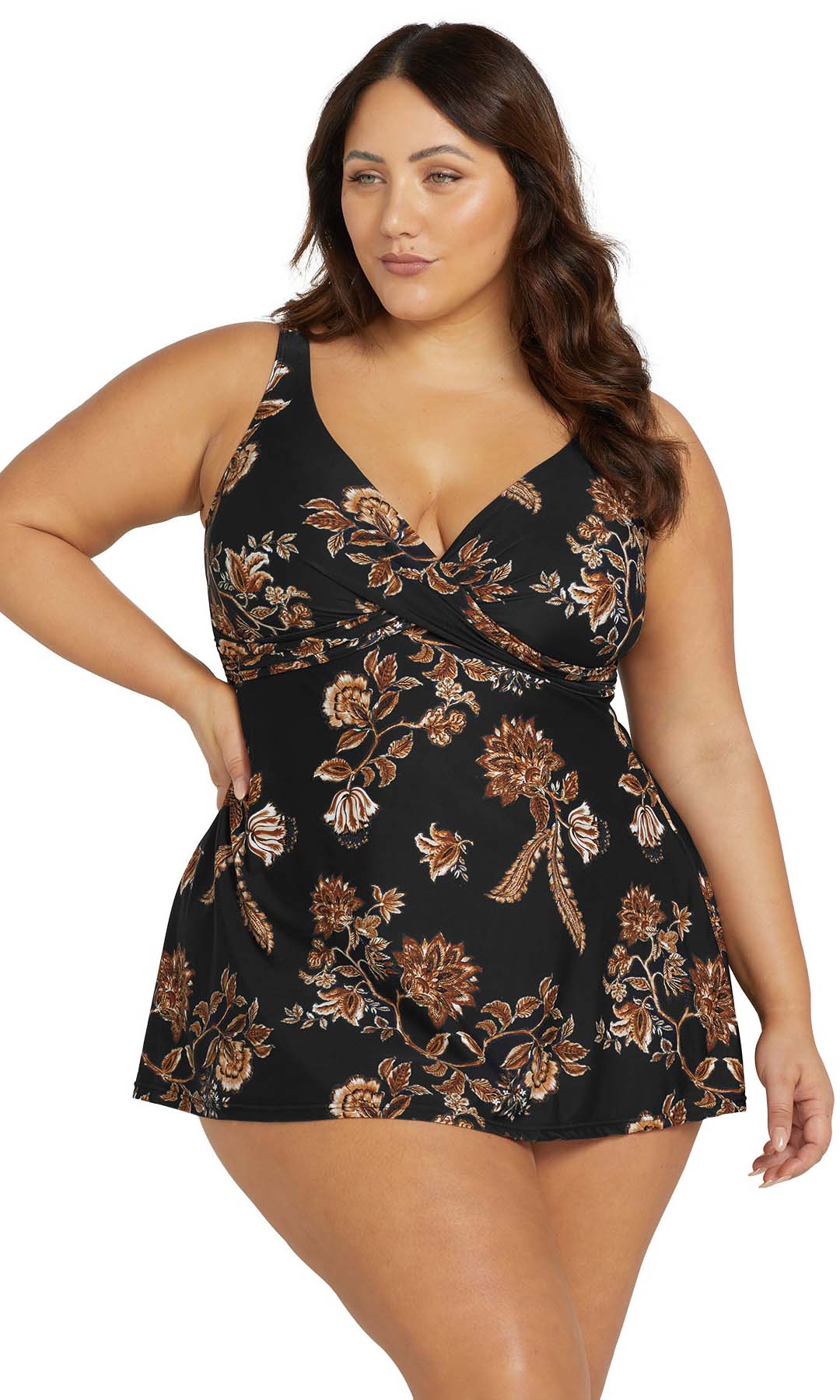 Artesands Fits Your Curves. Our Delacroix one piece swimdress shape is our wire free comfort and support swimdress style. Every woman needs a swimsuit that makes you feel good when you put it on and this is our curve fit and plus size shape Delacroix. This style has a cross front design with multifit cup support that fits a D cup , DD cup, E cup, F cup and a G cup. The Delacroix one piece swimdress silhouette is a waist defining A-line design that will not cling to your body. Delacroix has internal full body 360 degree powermesh for body sculpting confidence.