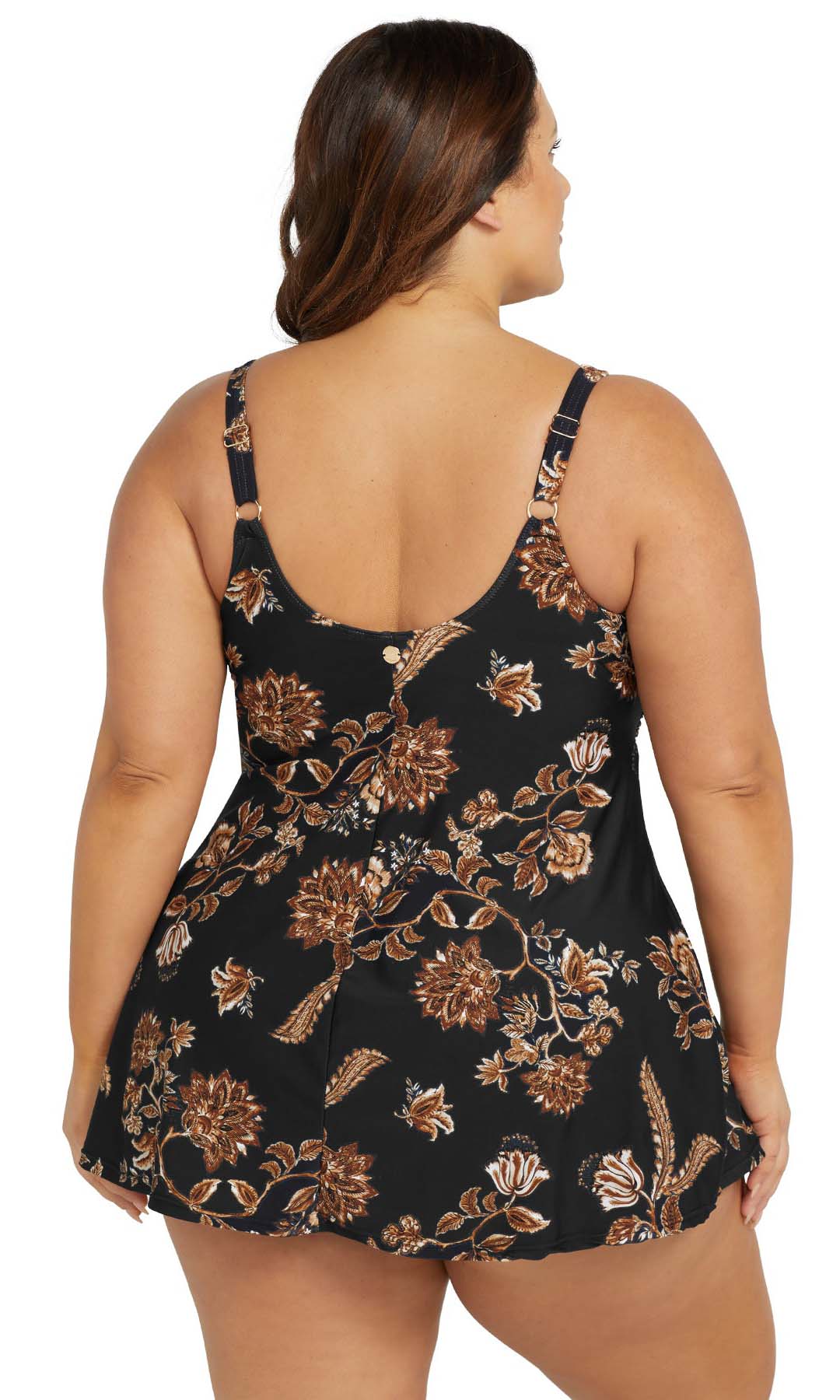 Internal built in swim pant - Our curve fit and plus size Delacroix swimdress has a full high waist brief built in under the flared A-Line dress. This swimpant is the same fabric as the outer layer with powermesh lining.