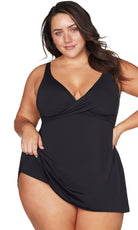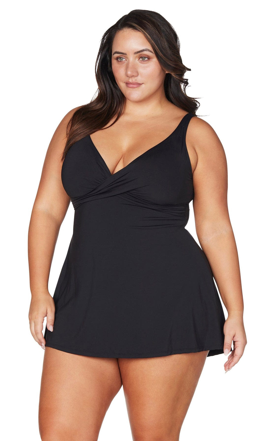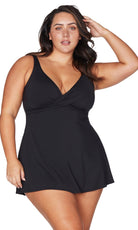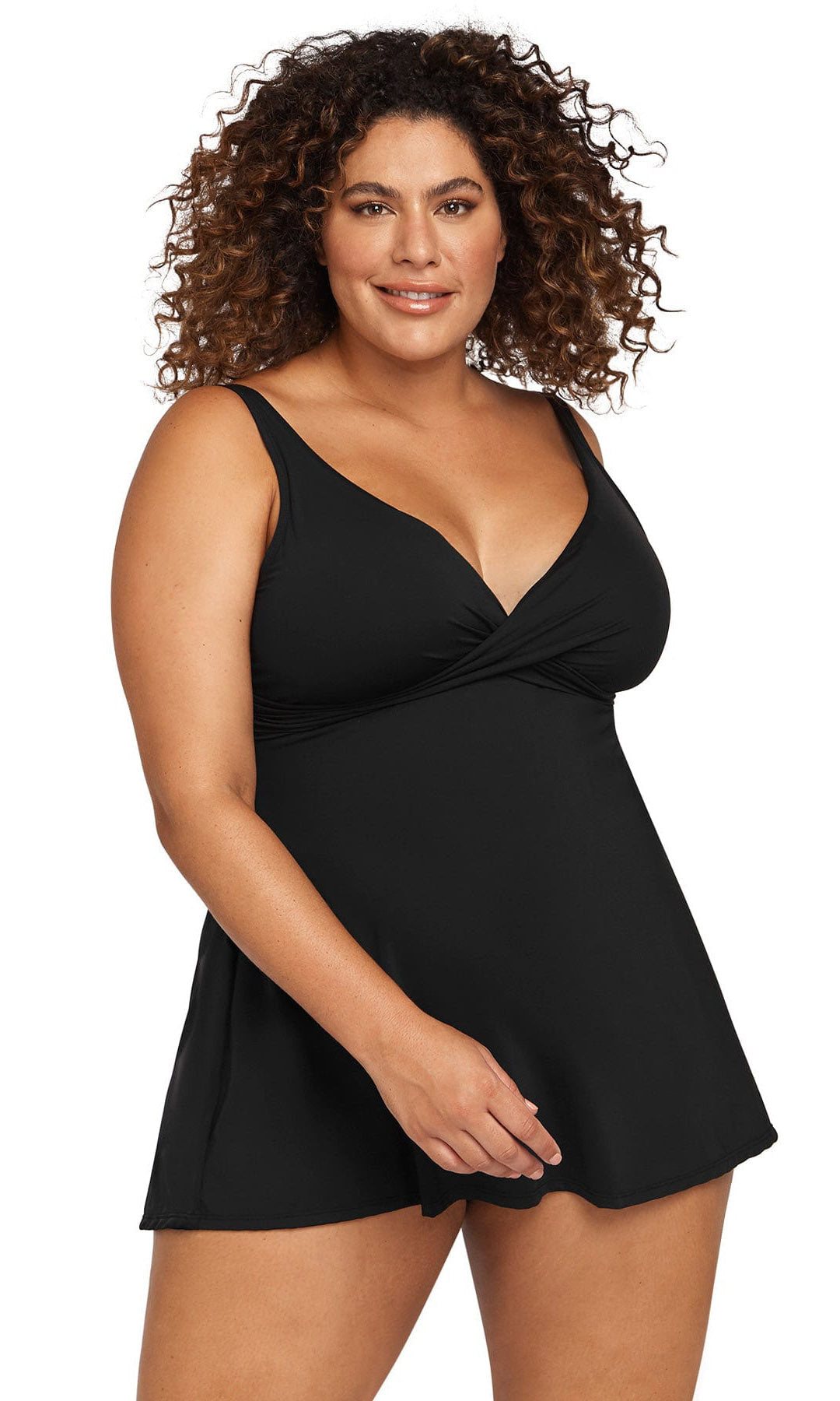 RecycledArtesands Fits Your Curves. Our Delacroix one piece swimdress shape is our wire free comfort and support swimdress style. Every woman needs a swimsuit that makes you feel good when you put it on and this is our curve fit and plus size shape Delacroix. This style has a cross front design with multifit cup support that fits a D cup , DD cup, E cup, F cup and a G cup. The Delacroix one piece swimdress silhouette is a waist defining A-line design that will not cling to your body. Delacroix has internal full body 360 degree powermesh for body sculpting confidence.